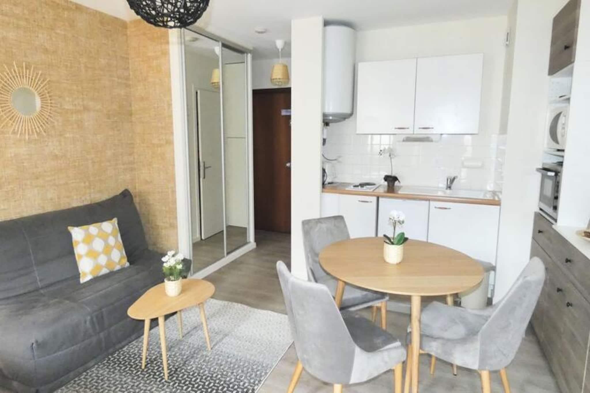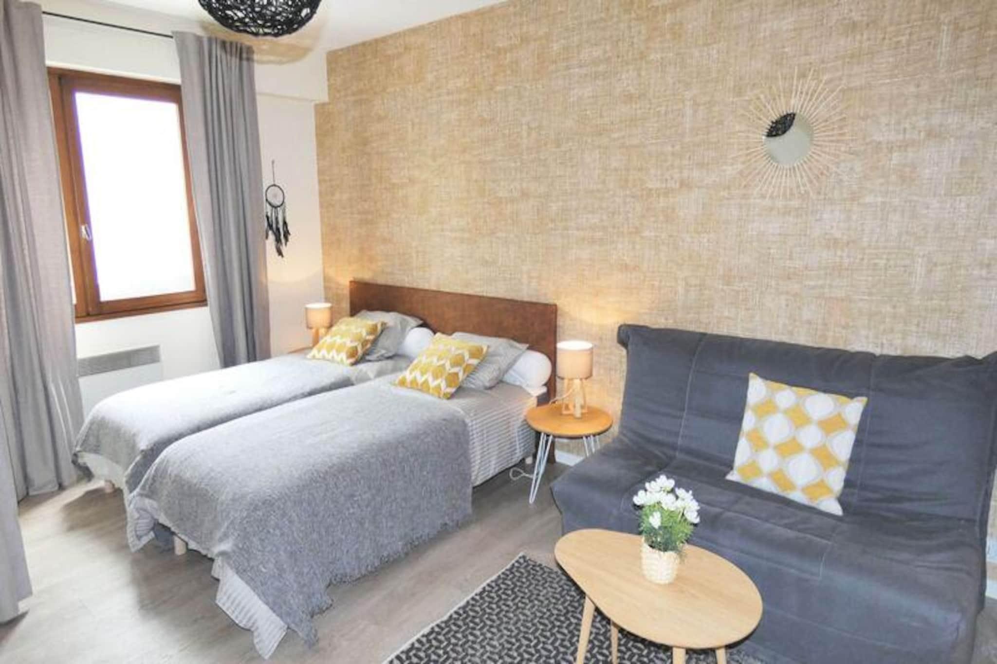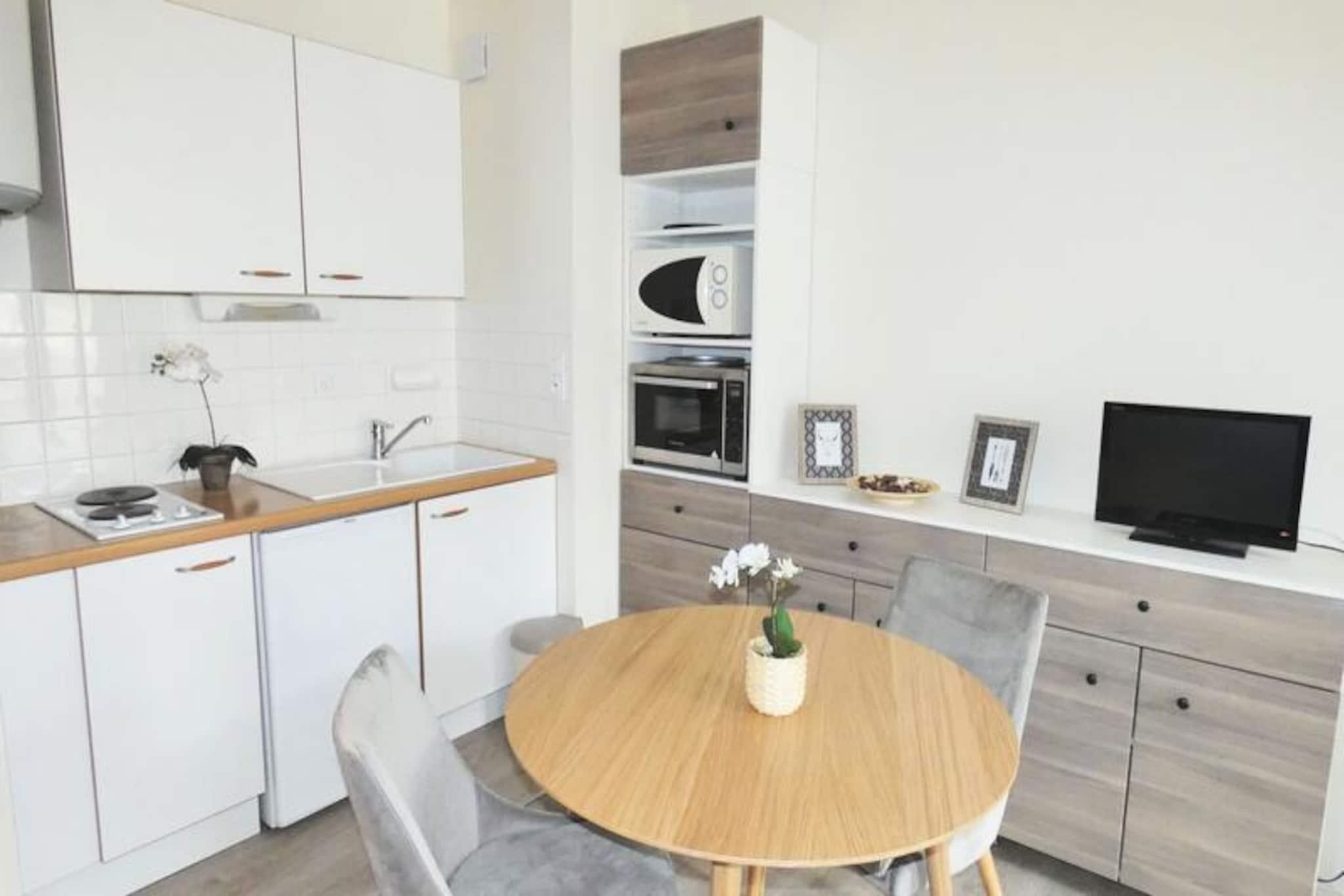 Midt i Aix-les-Bains' pulserende gader tilbyder denne charmerende studiolejlighed et hyggeligt tilflugtssted for rejsende, der søger både bekvemmelighed og komfort. Ejendommen ligger overfor den historiske Notre Dame-kirke i et livligt kvarter fyldt med butikker, caféer og med nem adgang til byens berømte termiske spa-faciliteter. Uanset om du besøger byen for fritid eller forretning, sikrer den førsteklasses beliggenhed, at du aldrig er langt fra begivenhedernes centrum, mens du nyder en fredelig oase at slappe af i. Fra loggiaen på tredje sal kan du nyde morgensolen og den travle atmosfære i denne maleriske by. \n\nStudiolejligheden er designet til at rumme op til tre gæster og er på 29 m². Den har gennemtænkte faciliteter til et problemfrit ophold. Det åbne køkken er udstyret med essentielle apparater, herunder en miniovn, mikrobølgeovn, køleskab/fryser og elkedel, hvilket gør det nemt at tilberede måltider. Den primære opholdsstue tilbyder to enkeltsenge, en dobbelt sovesofa, et fladskærms-tv og et spisebord til fire, hvilket sikrer både afslapning og praktisk anvendelighed. Det moderne badeværelse kan prale af en bruseniche, håndklædetørrer og vaskemaskine, hvilket giver ekstra bekvemmelighed til dit ophold. Yderligere bekvemmeligheder inkluderer individuel elektrisk opvarmning, en røgalarm og en tårnventilator til varmere dage.\n\nLejligheden ligger kun 950 meter fra Chevalley Thermal Baths og 3 kilometer fra den fredfyldte bred af Bourget-søen og er en ideel base for at udforske Aix-les-Bains' naturlige og kulturelle skatte. Nærliggende attraktioner inkluderer Grand Cercle Casino, Marlioz Thermal Baths og Mont Revard, perfekt til naturskønne vandreture og panoramaudsigt. Med parkeringsmuligheder og offentlig Wi-Fi tilgængelig i hele byen er dit ophold både praktisk og behageligt.\n\nUanset om du er her for at lade op i det termiske vand, udforske de charmerende gader eller blot slappe af ved søen, tilbyder denne studiolejlighed en dejlig blanding af komfort og tilgængelighed i hjertet af Aix-les-Bains.