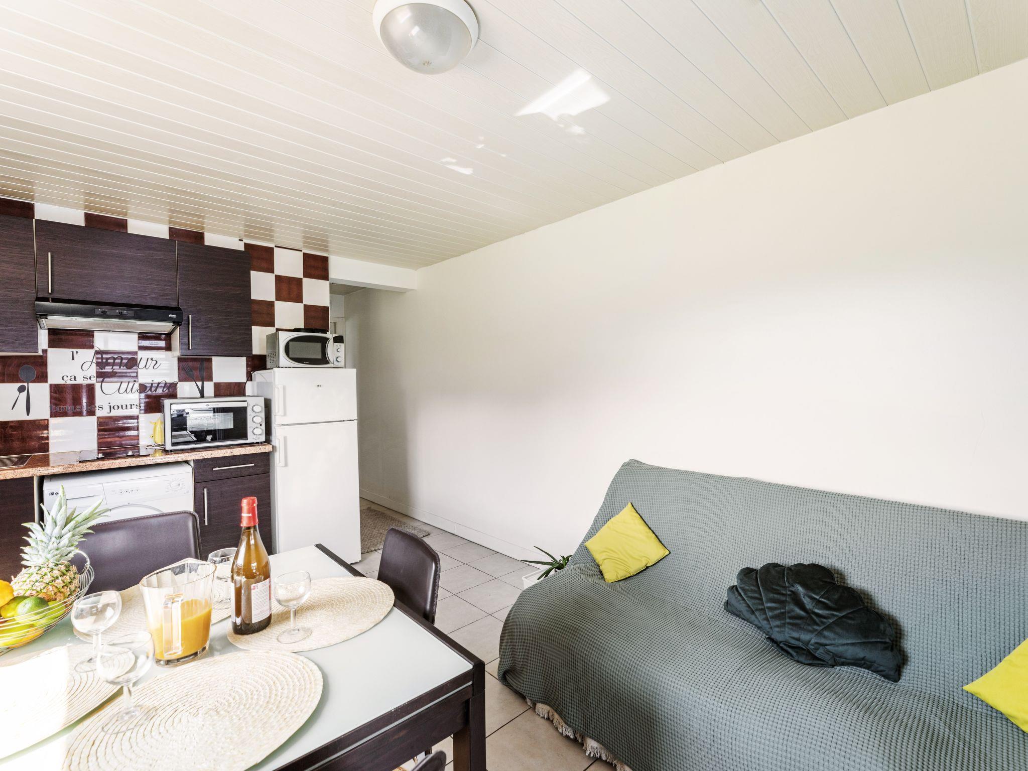 2-room apartment 35 m2, on the ground floor. Beautiful furnishings: living/dining room with 1 double sofabed (140 cm, length 190 cm), TV (flat screen). Exit to the terrace. 1 room with 1 french bed (140 cm, length 190 cm). Open kitchen (2 ceramic glass hob hotplates, toaster, kettle, freezer, electric coffee machine, combination microwave). Shower/WC. Electric heating. Terrace 12 m2, west facing position, large garden 400 m2, south facing position. Terrace furniture, barbecue, deck chairs. Facilities: washing machine, iron, hair dryer. Internet (WiFi, free). Parking (fenced 1 car). Please note: non-smokers only. Smoke alarm. 64024002568B5