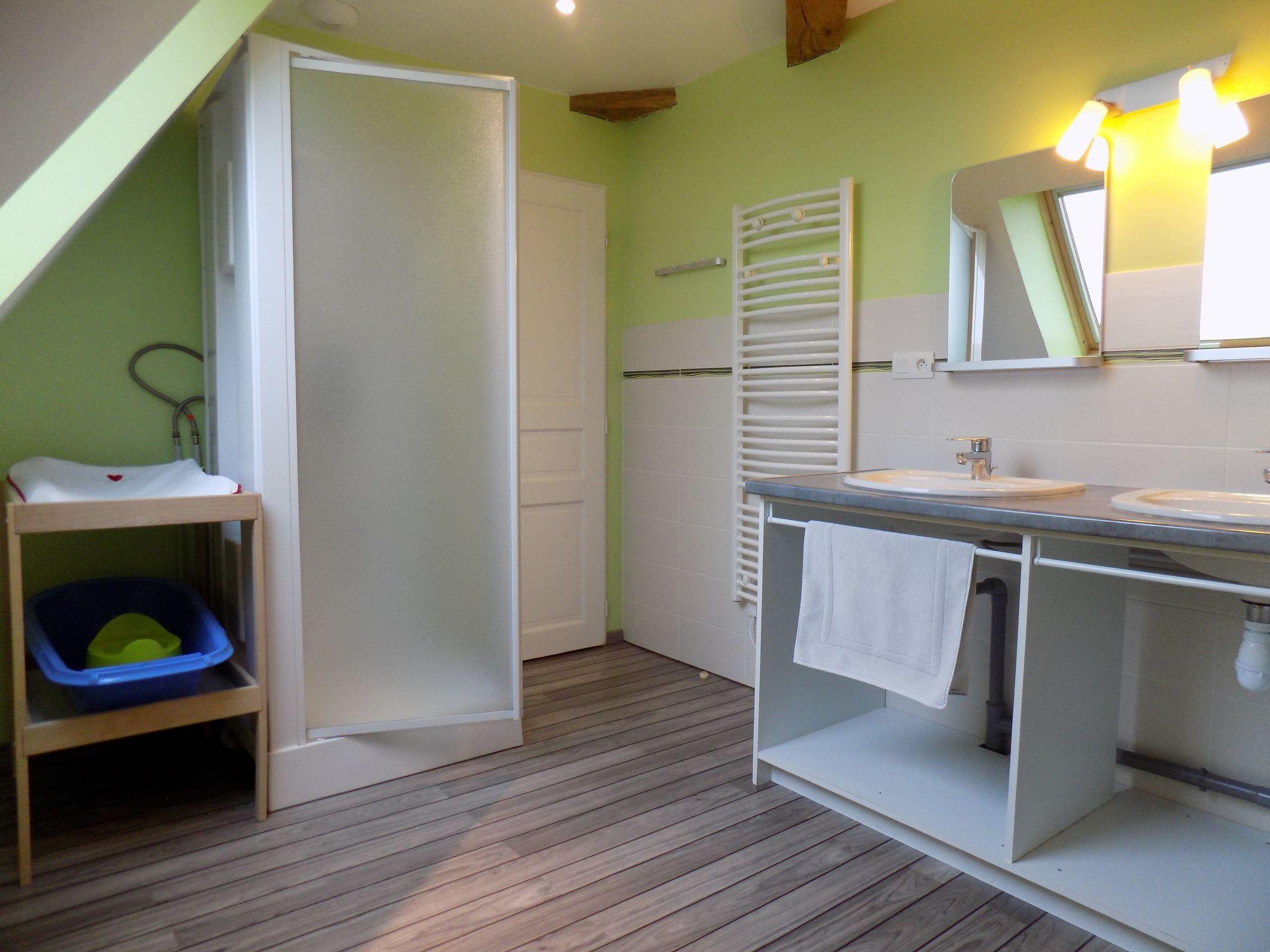 The rooms in this 135 m² holiday home are bright and tastefully furnished. The ground floor features a large living room with a wood-burning stove and sofas, as well as'une télévision et un lecteur de DVD. La cuisine attenante avec espace repas s', which opens onto the living room. The modern living room is fully equipped and includes a dishwasher and microwave. The large dining table with wooden seating is directly in front of the kitchen area. One of the four bedrooms is on the ground floor. It is furnished with two beds from'un place de 90 x 200 cm et est accessible aux personnes en fauteuil roulant. Il y a en outre une salle de bain avec douche et WC, également accessible en fauteuil roulant, ainsi qu'and a separate toilet. At'étage supérieur se trouvent trois autres chambres doubles agréablement aménagées. Deux des chambres disposent chacune d'there is a double bed (160 x 200 cm) and a bedroom with two single beds ('une place de 90 x 200 cm. A l'). On the same floor there is a bathroom with shower and washbasin unit with two washbasins and'un cabinet de toilette.