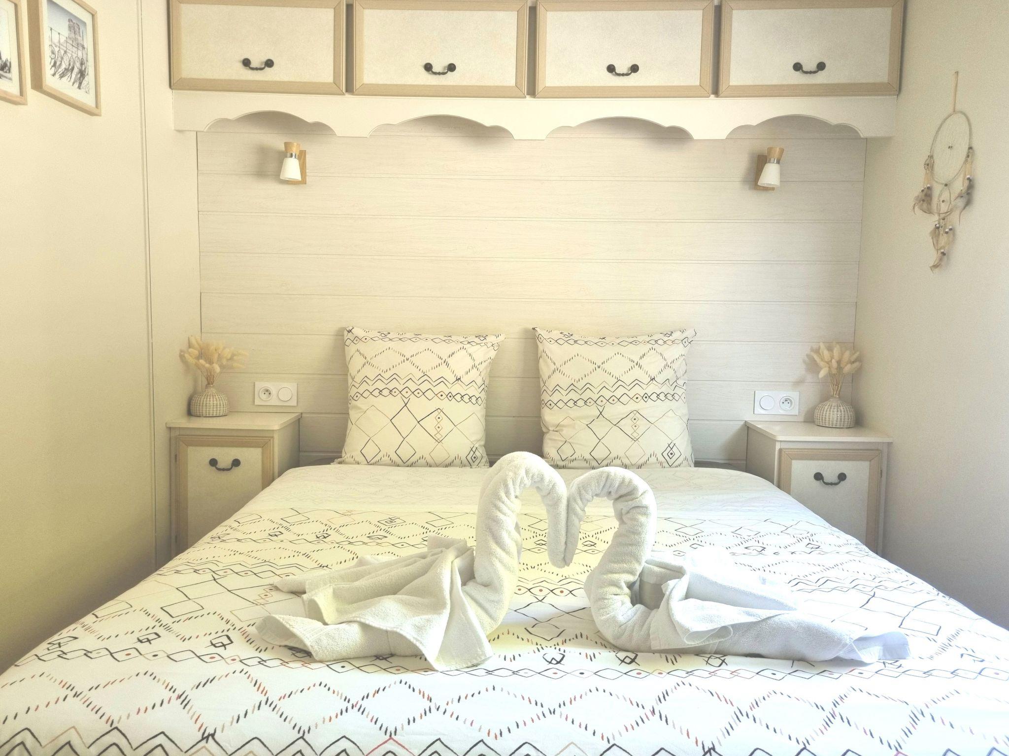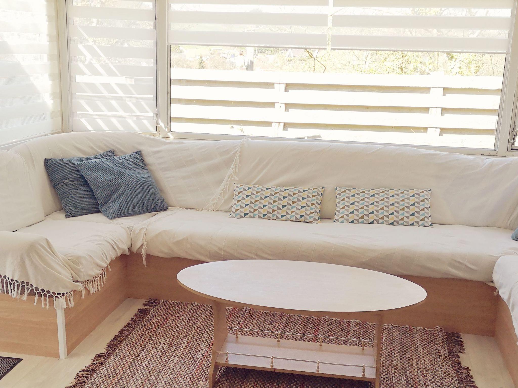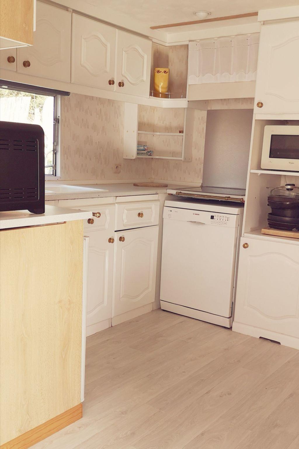 The interior of this mobile home is equipped to meet your needs during your stay. The kitchen is well equipped with a ceramic hob, a dishwasher, a coffee maker with soft pods, an electric kettle and a mini-oven to prepare and enjoy your meals with ease. A washing machine for private use in the accommodation also ensures your comfort. Relaxation is guaranteed with a connected TV, so you can keep up to date with your favourite series and films.