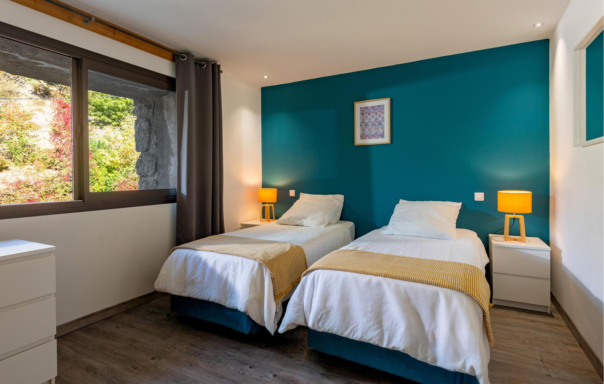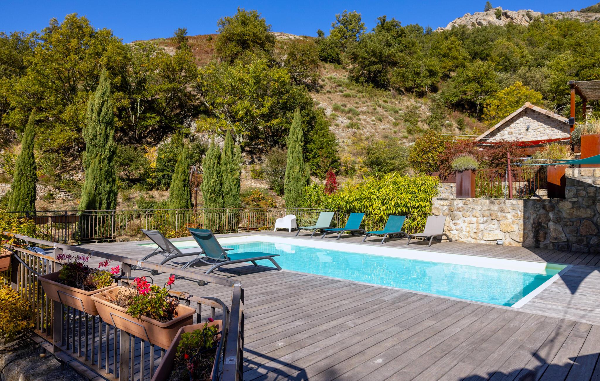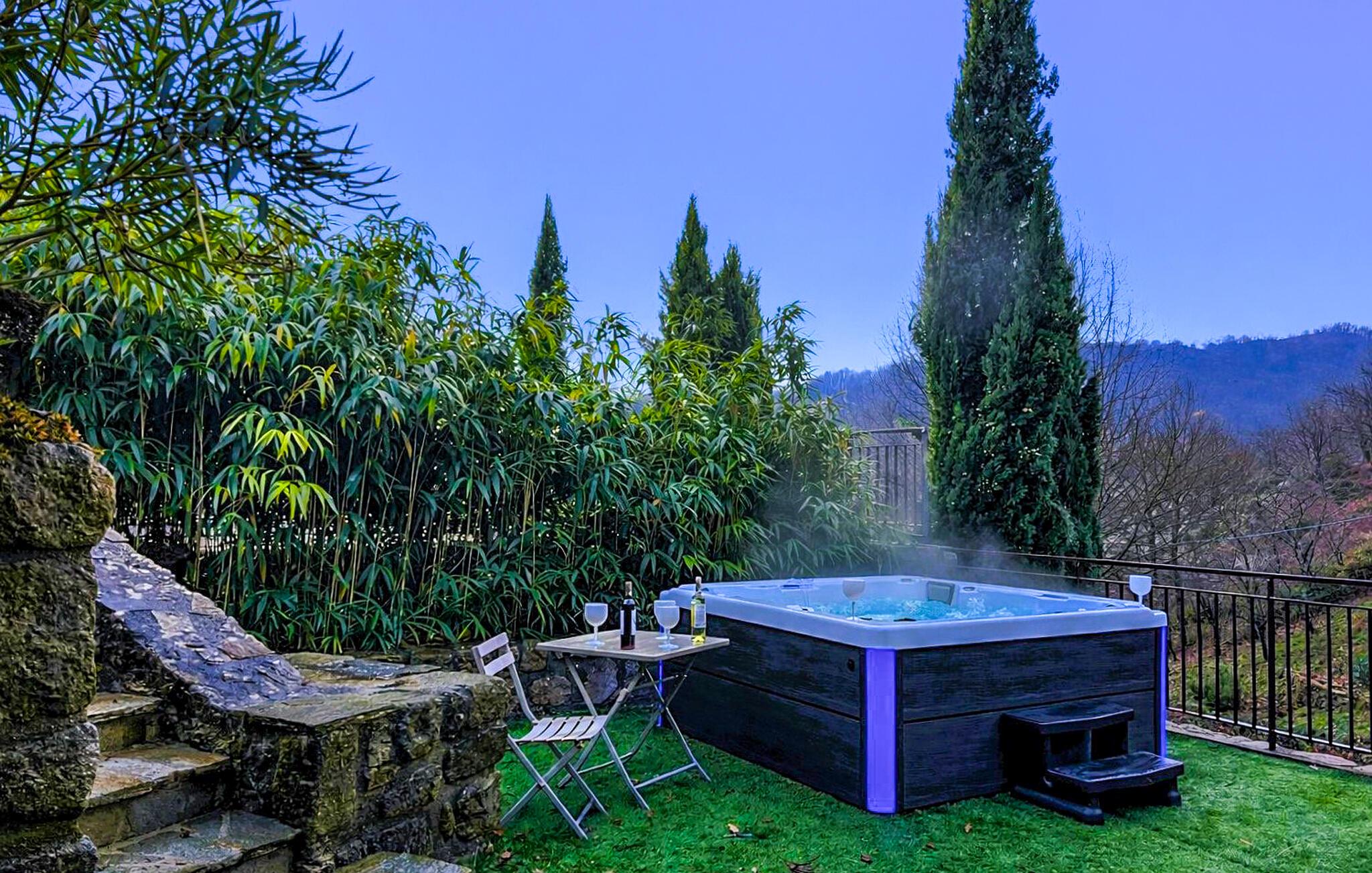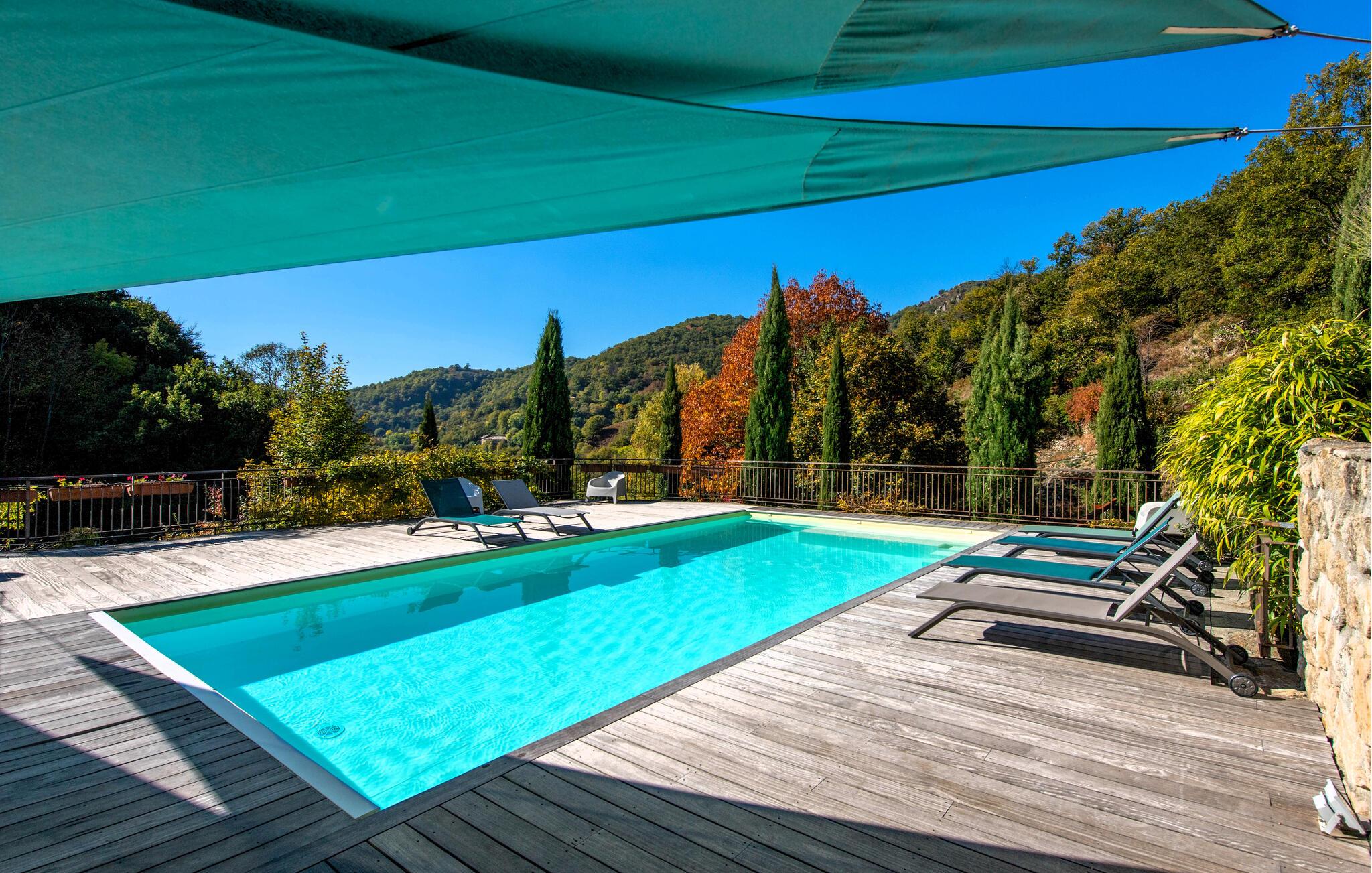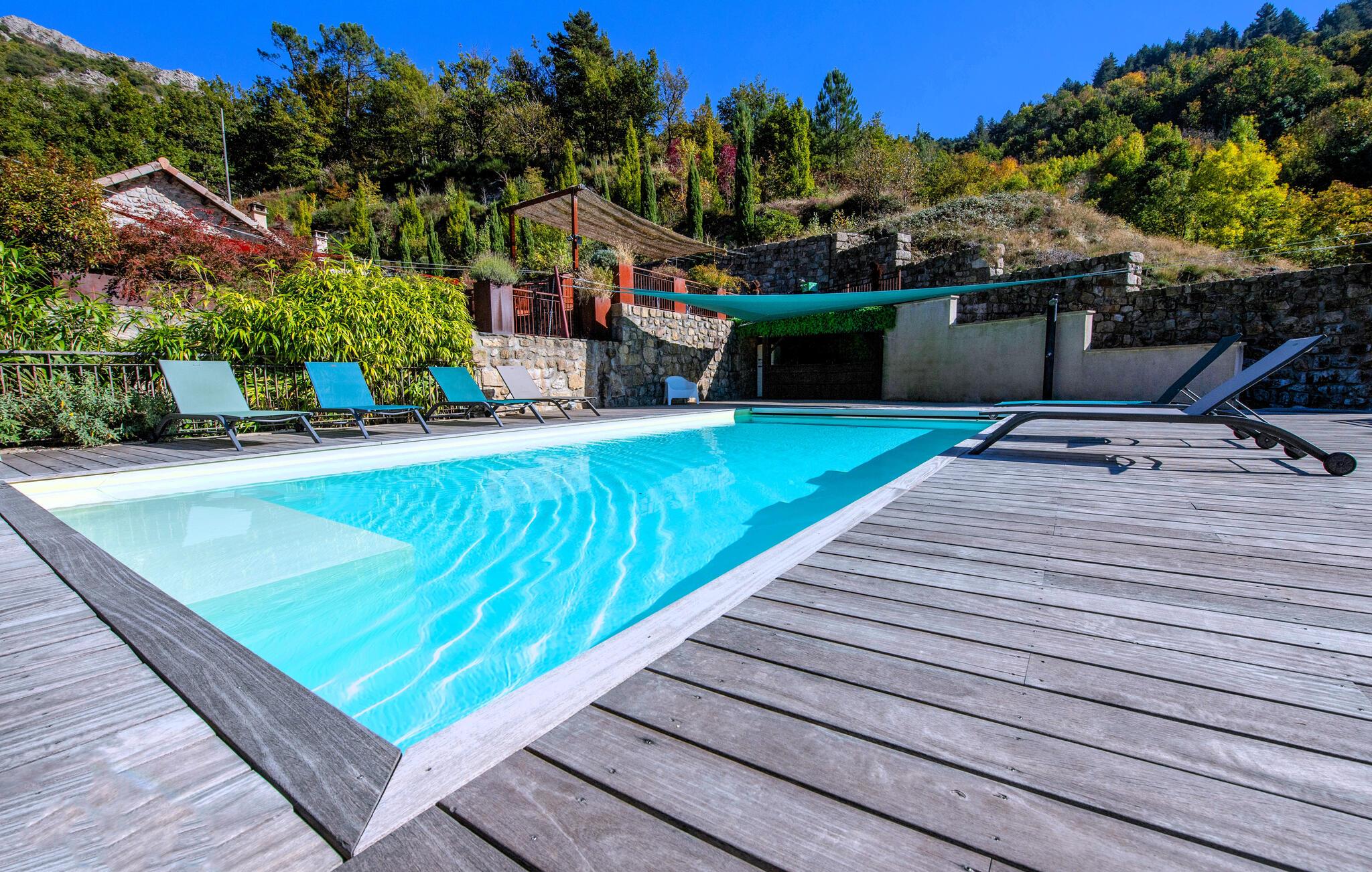 Forkæl jer selv med en afslappende ferie i dette smukke, børnevenlige feriehus med pool og spabad, beliggende midt i naturen. Tilbring idylliske dage i dette autentiske feriehus med moderne præg, som med sine mange ekstrafunktioner tilbyder det ideelle sted til familiesammenkomster eller en ferie med vennerne. Nyd den smagfulde atmosfære af møbler af høj kvalitet under hyggelige måltider, hold sjove spilleaftener ved det behageligt oplyste spisebord, eller saml jer til hyggelige filmaftener. Jeres sydvendte terrasse inviterer jer til at nyde morgenmad, grillfester og samtaler med venner og familie. Lad den fredelige atmosfære omslutte jer med afslappende bad i spabadet, forfrisk jer i poolen og slap af med en drink i strandbaren eller i hængekøjen, mens børnene leger på legepladsen. Gå en tur gennem de charmerende gader i bjerglandsbyen Antraigues med dens mange hoveder udskåret af lavasten, beundr udsigten over Volane- og Mas-dalene, og vandr gennem kastanjeskovene og vulkanbjergene omkring Genstelle. Besøg Château de Craux og slap af i den berømte termiske spa i Vals-les-Bains.