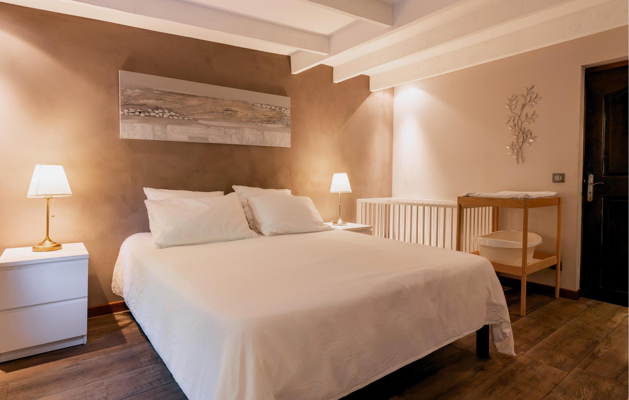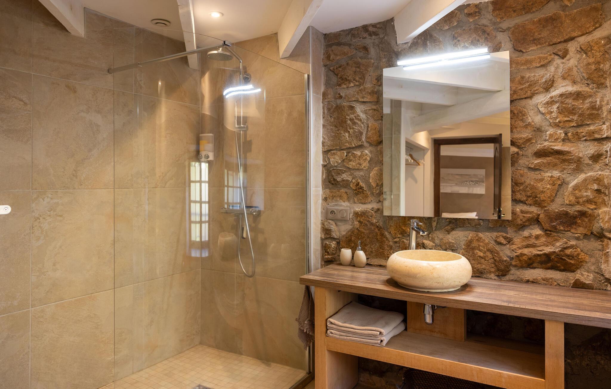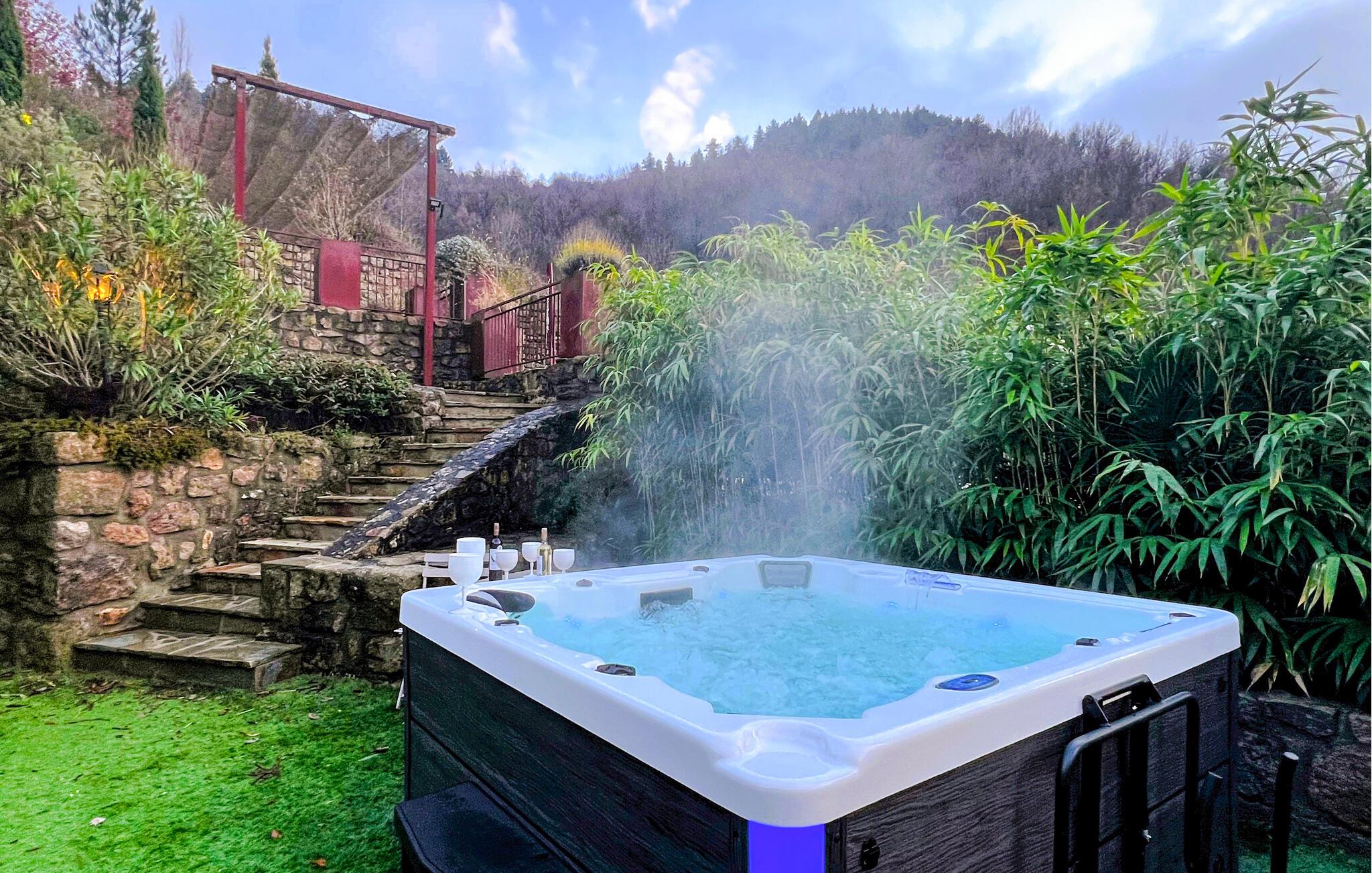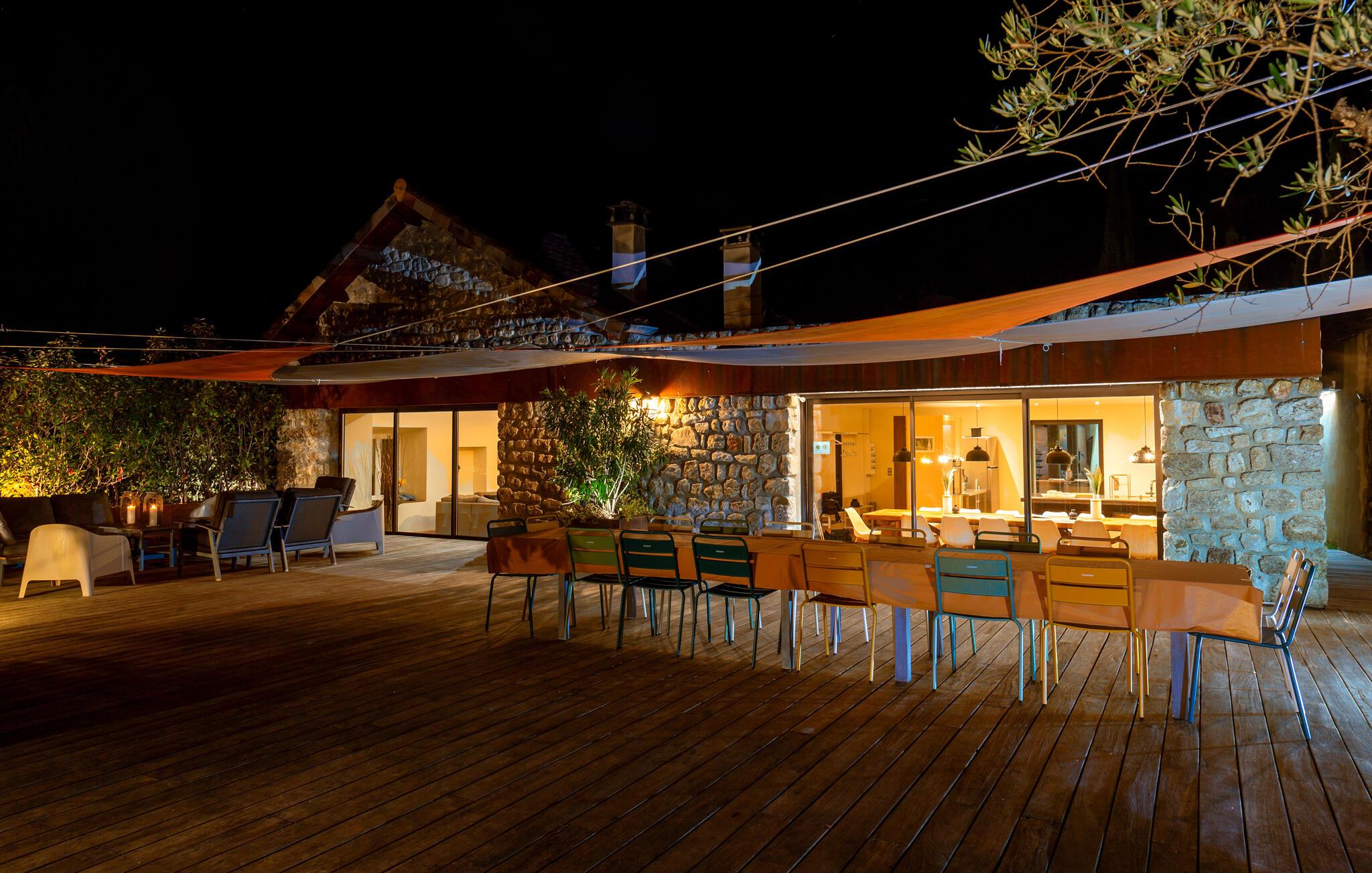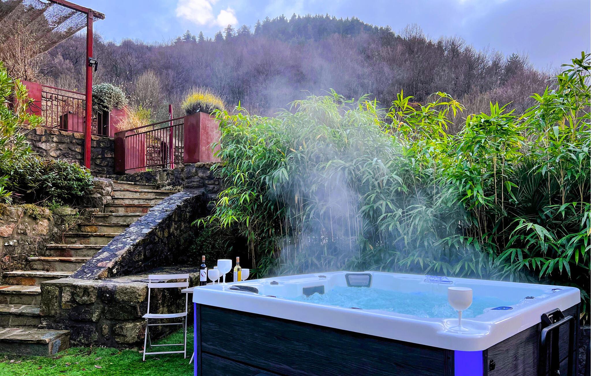 Forkæl jer selv med en afslappende ferie i dette smukke, børnevenlige feriehus med pool og spabad, beliggende midt i naturen. Tilbring idylliske dage i dette autentiske feriehus med moderne præg, som med sine mange ekstrafunktioner tilbyder det ideelle sted til familiesammenkomster eller en ferie med vennerne. Nyd den smagfulde atmosfære af møbler af høj kvalitet under hyggelige måltider, hold sjove spilleaftener ved det behageligt oplyste spisebord, eller saml jer til hyggelige filmaftener. Jeres sydvendte terrasse inviterer jer til at nyde morgenmad, grillfester og samtaler med venner og familie. Lad den fredelige atmosfære omslutte jer med afslappende bad i spabadet, forfrisk jer i poolen og slap af med en drink i strandbaren eller i hængekøjen, mens børnene leger på legepladsen. Gå en tur gennem de charmerende gader i bjerglandsbyen Antraigues med dens mange hoveder udskåret af lavasten, beundr udsigten over Volane- og Mas-dalene, og vandr gennem kastanjeskovene og vulkanbjergene omkring Genstelle. Besøg Château de Craux og slap af i den berømte termiske spa i Vals-les-Bains.