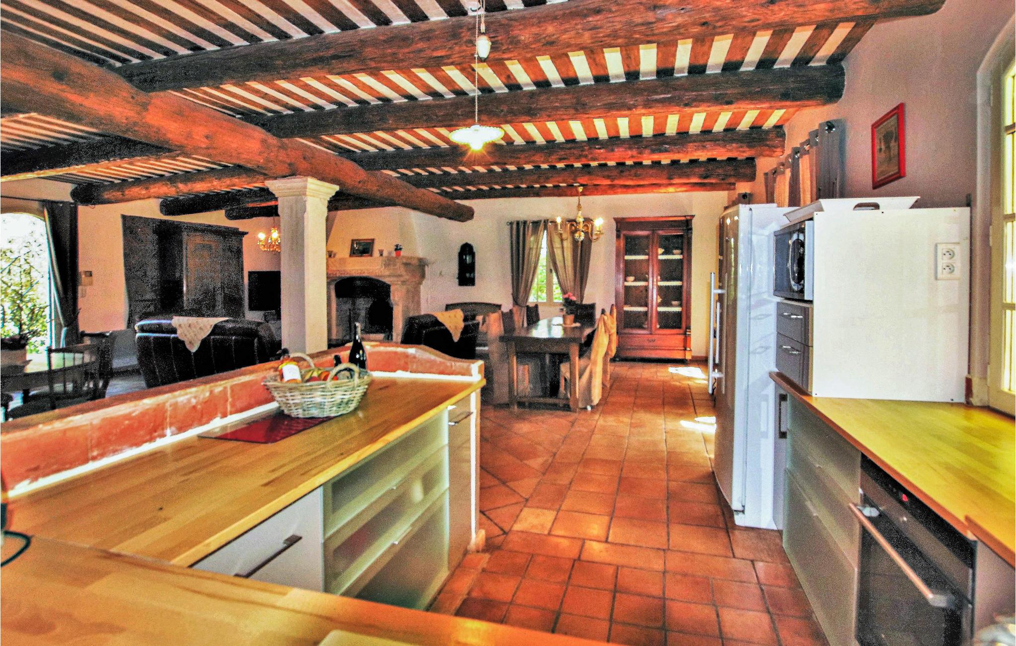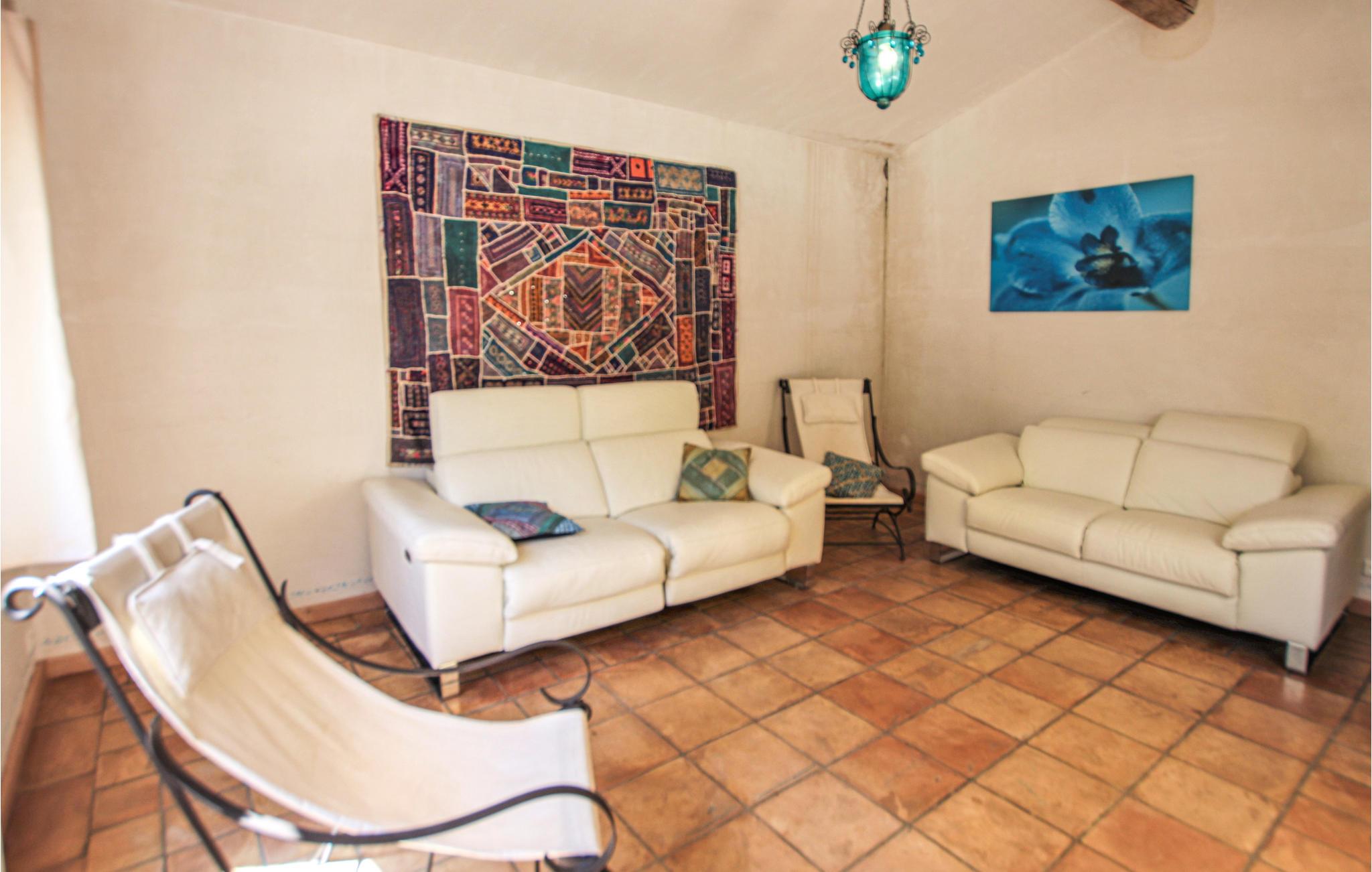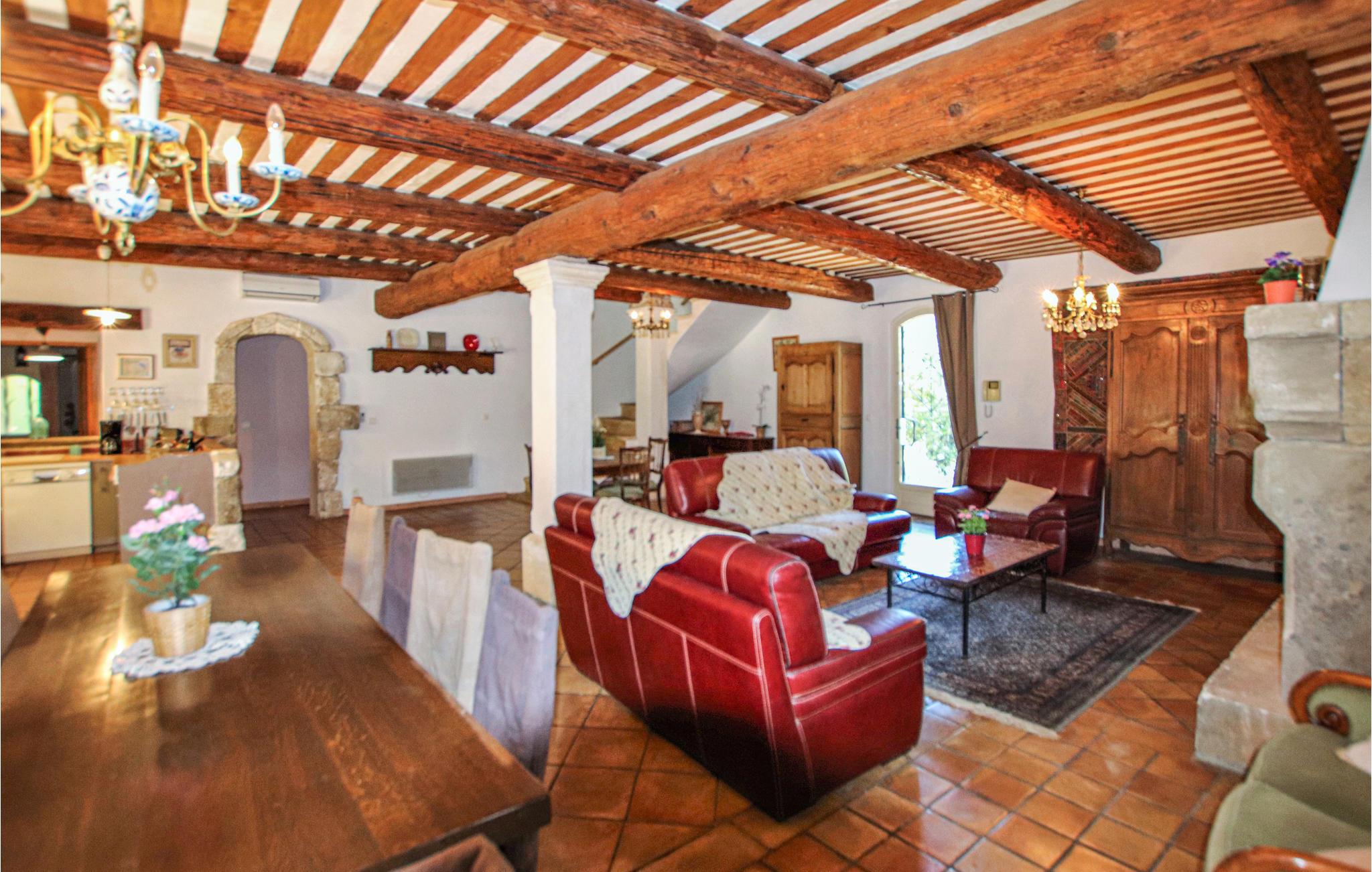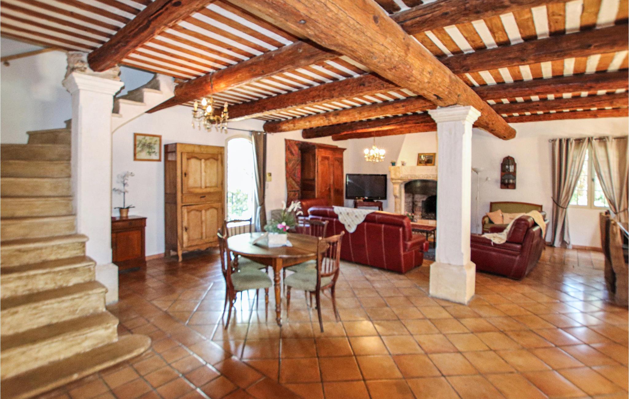 Huset strækker sig over to etager og tilbyder plads til en familie med sine fire indbydende og rummelige soveværelser. Det autentiske interiør i en rustik, provencalsk stil lavet af fine materialer er velholdt, og den enorme stue med integreret køkken åbner ud til haven.