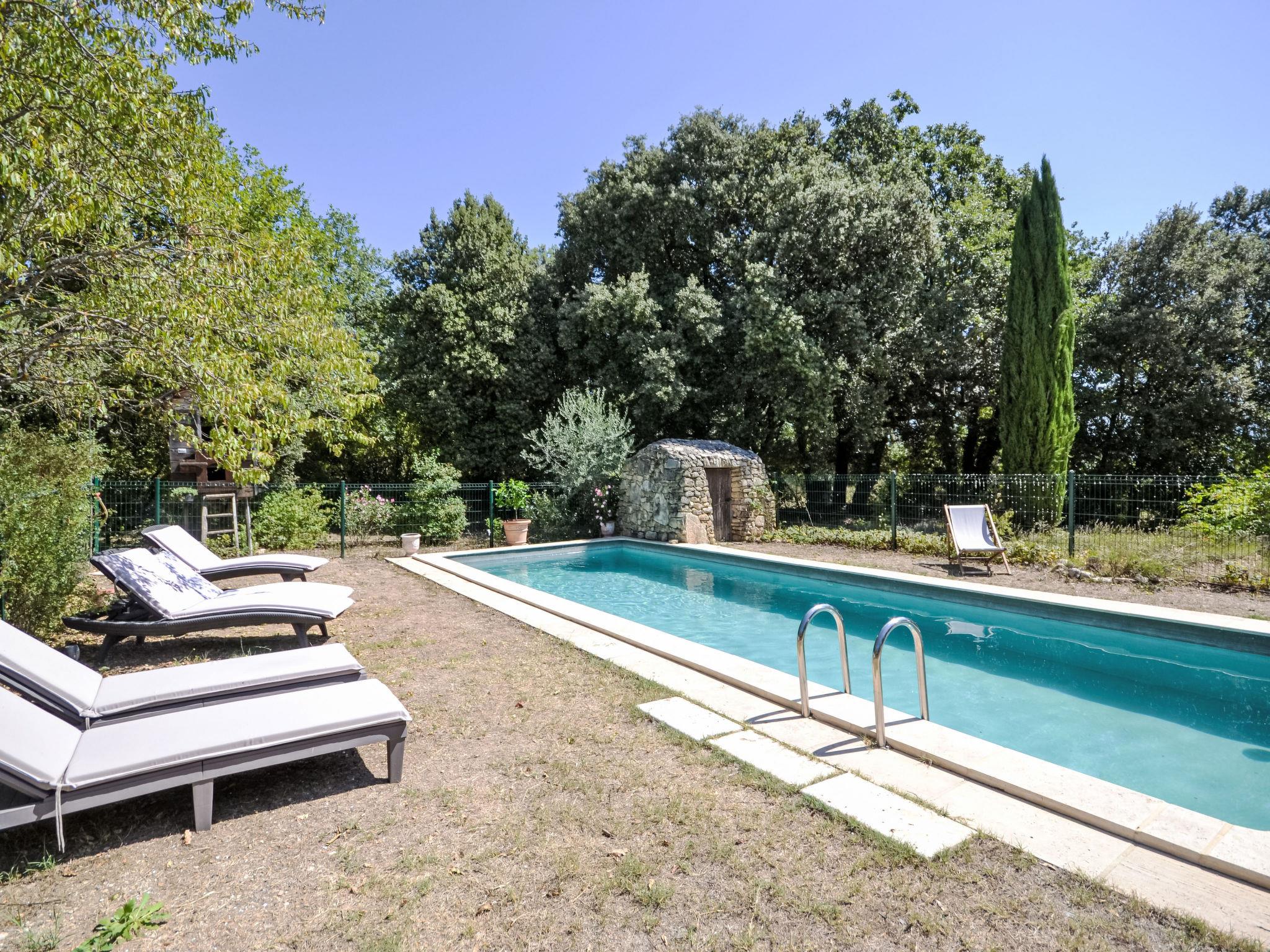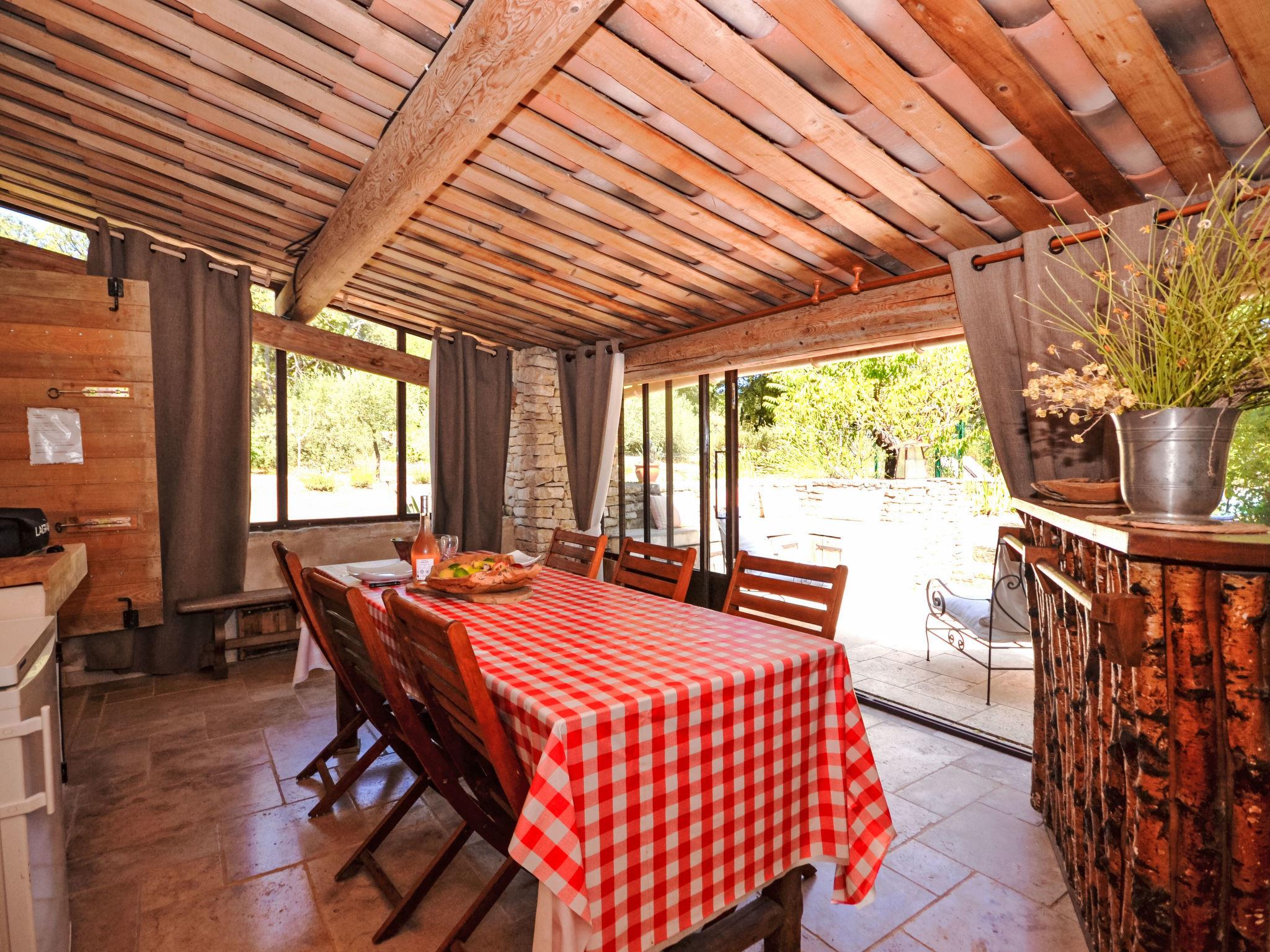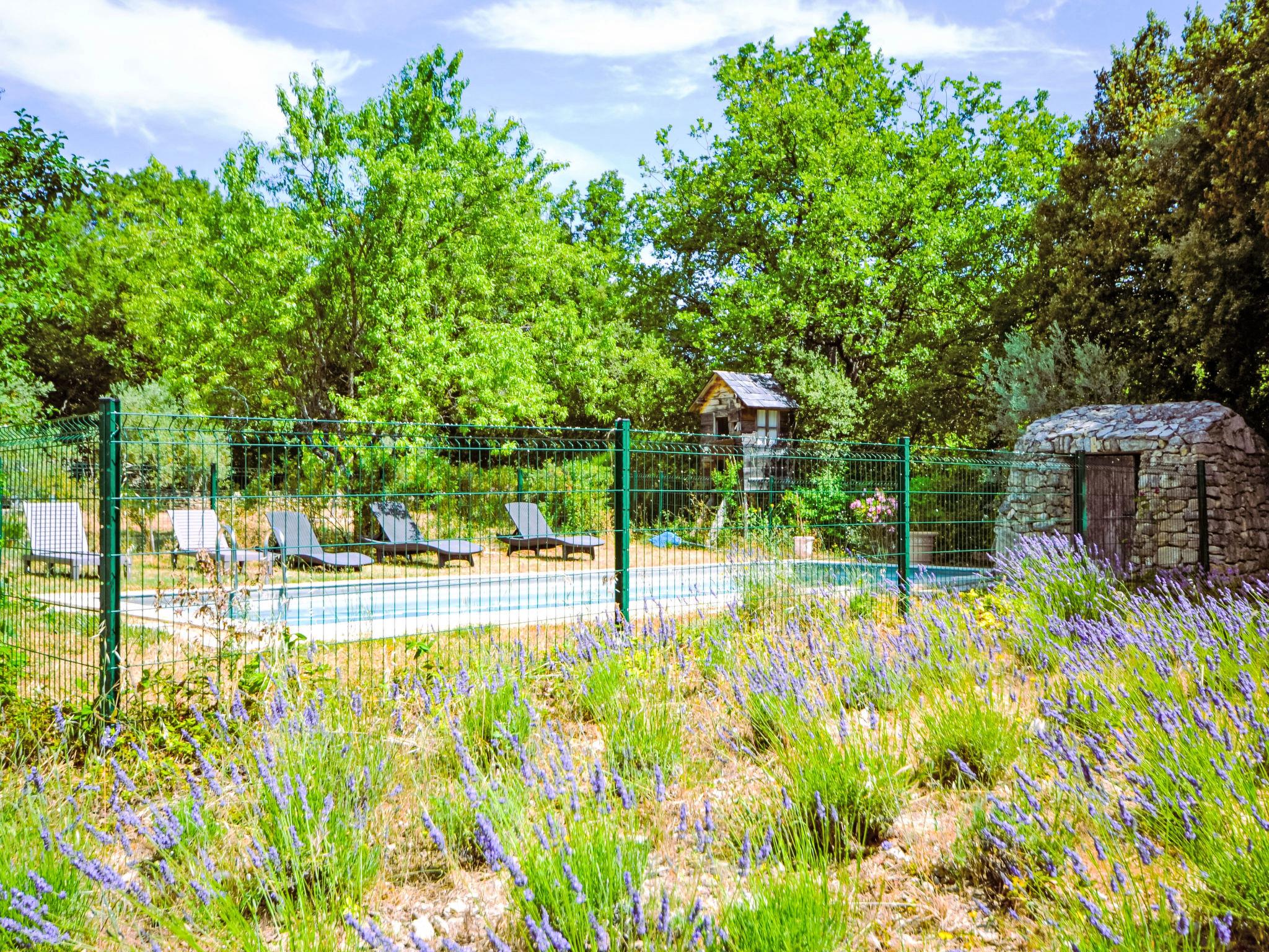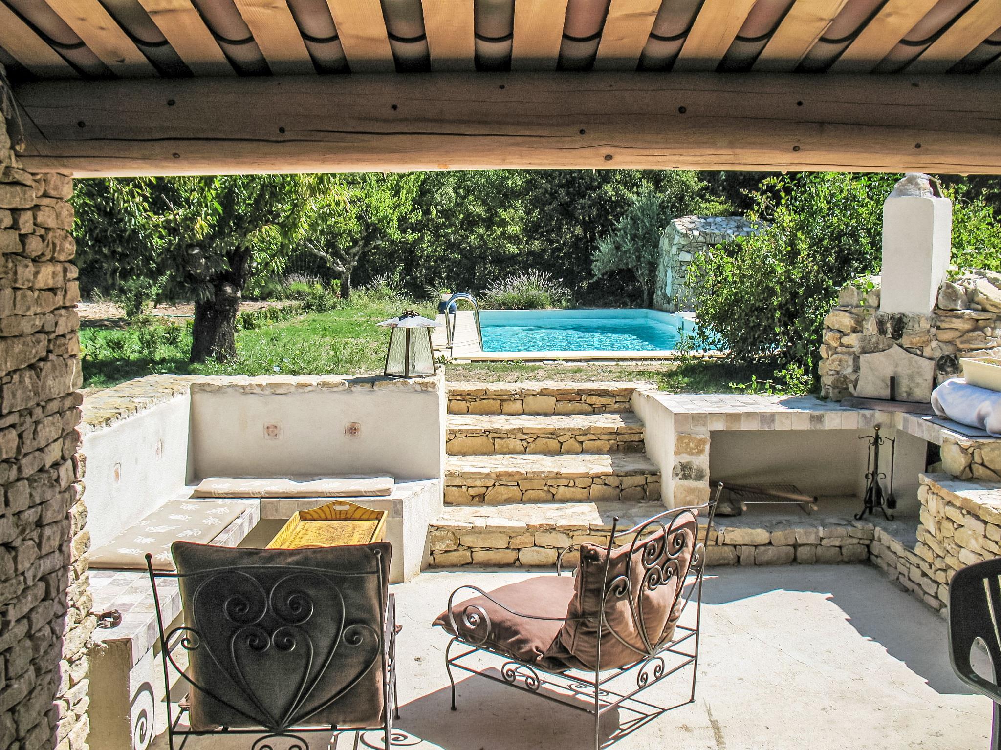 The covered terrace has a sink, a small fridge and an electrical grill. Mas "Le Bois d'Amour", built in 1900, renovated, surrounded by trees. Outside the resort, 2.5 km from the centre of d'Apt, in a quiet position, 100 m from the edge of the forest, north-east facing position. Private: property 2'500 m2 (fenced) with flowers and trees, swimming pool fenced (10 x 4 m, depth 150 cm, seasonal availability: 01.May. - 15.Oct.) with alarm system. Outdoor shower, terrace, garden furniture. Motor access to the house (50 m via unmade road). Parking on the premises. E-charging station. Shop 4 km, grocery 4 km, restaurant 4 km, bakery 4.8 km, bicycle rental 4.3 km, bus stop "Gare Routière" 5 km, lake Plan d'eau d'Apt 6.4 km. Golf course (9 hole) 5.2 km, children's playground 5 km. Nearby attractions: Colorado de Rustrel 10 km, Les Ocres de Roussillon 11 km, Village classé de Gordes 10 km, Simiane La Rotonde 24 km, Avignon 54 km. Hiking paths: Parc Régional des Alpilles 30 km, Forêt des Cèdres 22 km, Parc Régional du Luberon 10 km. Please note: car recommended.