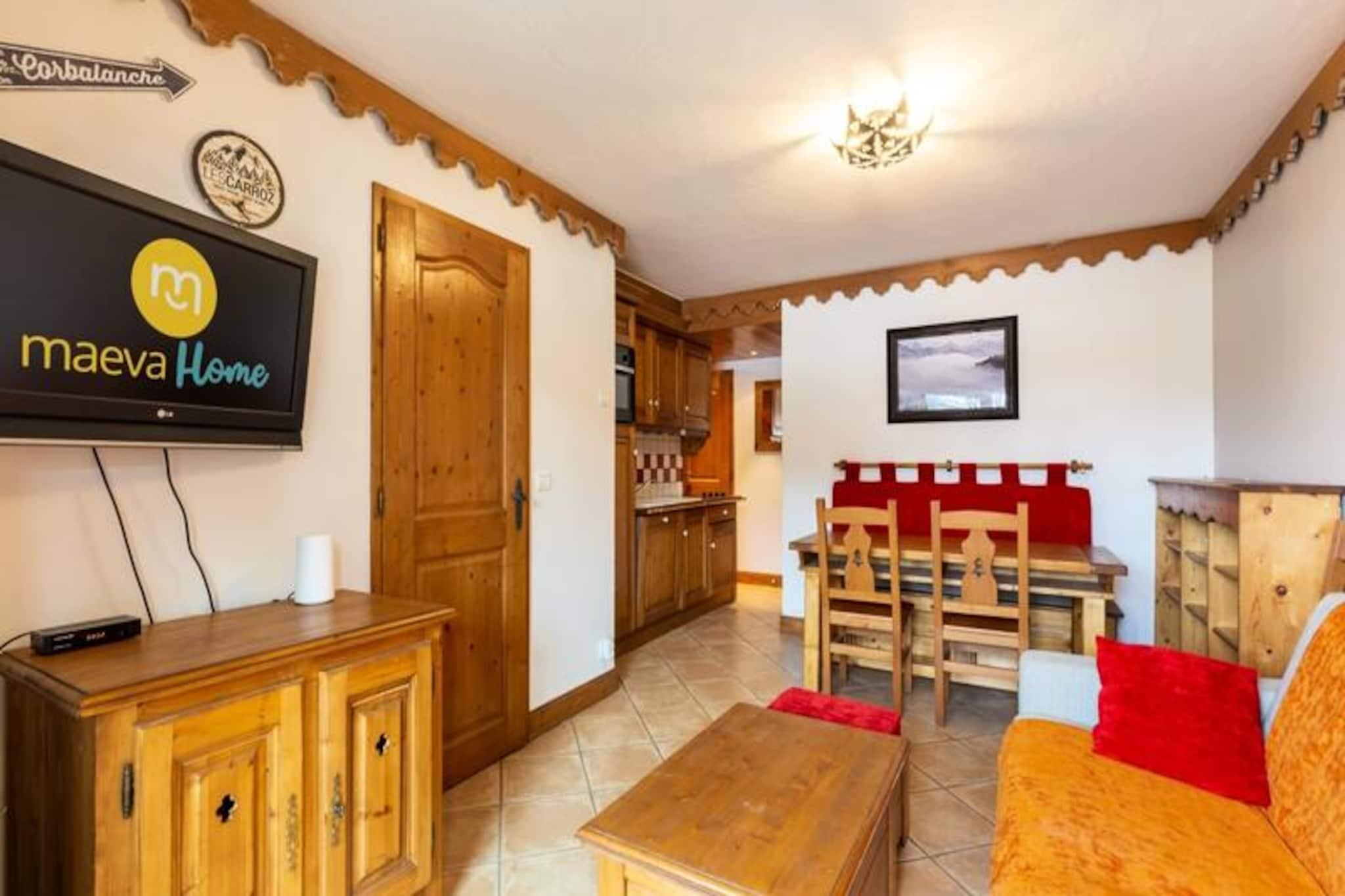 Denne hyggelige lejlighed er beliggende i en charmerende bolig med fem hytter, beliggende i det familievenlige feriested Carroz d'Arraches, i en højde af 1140 meter. Lejligheden byder på to komfortable soveværelser: et med dobbeltseng og det andet med to enkeltsenge. I stuen er der en sovesofa til yderligere gæster, hvilket gør den velegnet til op til 6 personer. Lejligheden er kæledyrsvenlig efter forudgående aftale. Sengelinned og håndklæder leveres, og et separat toilet er tilgængeligt. Boligen er bekvemt beliggende nær centrum af feriestedet, med turistkontoret kun 500 meter væk. De første svævebaner og ESF ligger omkring 800 meter fra ejendommen, med en gratis shuttle-service tilgængelig i nærheden. Gæsterne kan udforske det omkringliggende område, med barer, restauranter og butikker kun en kort gåtur derfra. Der er også børneklubber, der tilbyder en række aktiviteter, perfekt for yngre gæster. Til afslapning kan gæsterne nyde wellness-området, som omfatter en sauna, jacuzzi og en opvarmet indendørs swimmingpool. Poolen er åben dagligt med udvidede åbningstider om lørdagen. Lejligheden har også et veludstyret køkken med mikroovn, ovn og opvaskemaskine, perfekt til at tilberede måltider. Boligen tilbyder underjordisk parkering (ekstra gebyr) og et babysæt tilgængeligt efter anmodning.