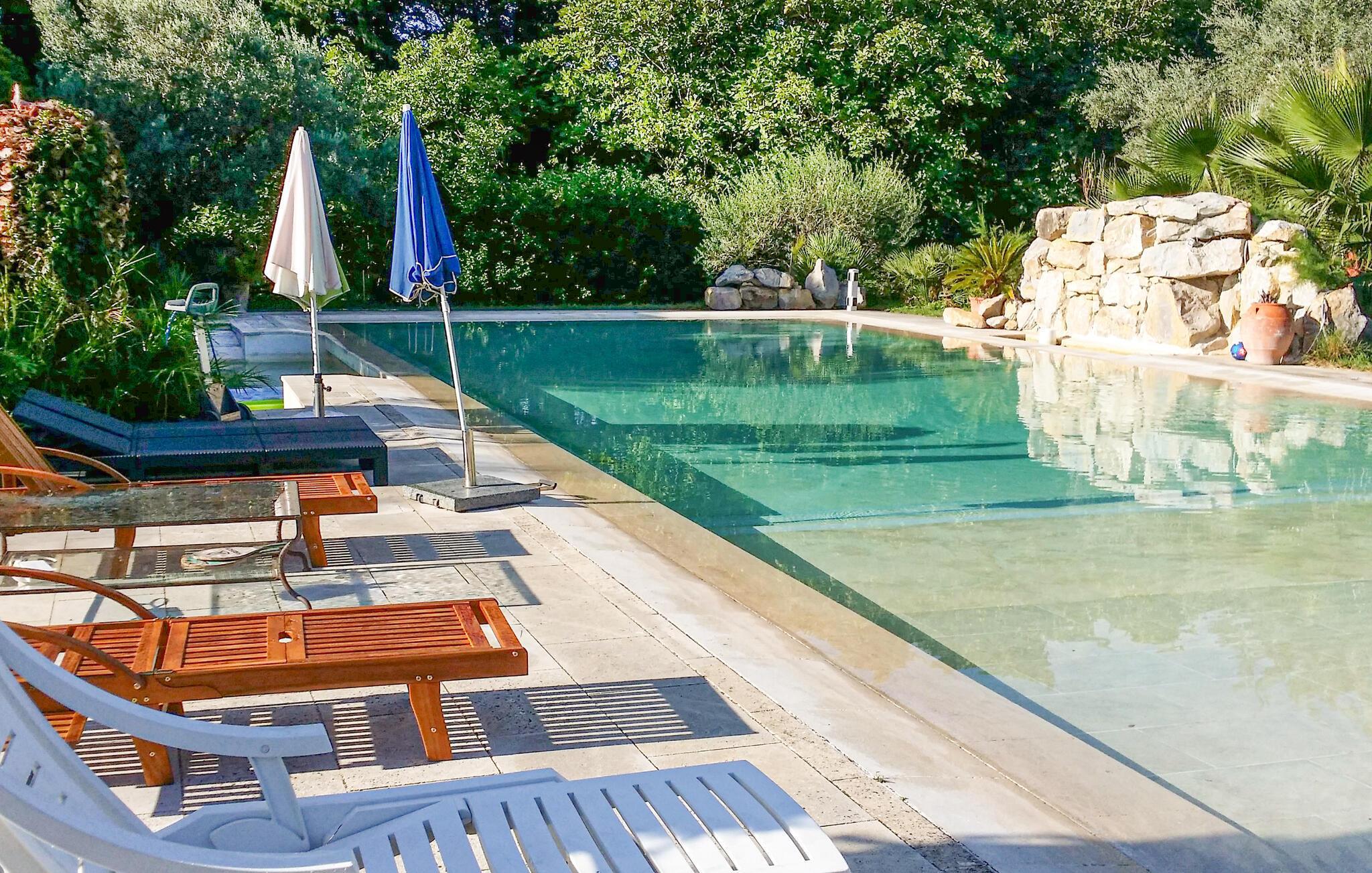 Der er nærmest ingen grund til at forlade jeres dejlige oase her. Huset ligger på en rolig, fuldstændig indhegnet grund, hvor I blandt finder en park med træer og et stort pool-område, og I kan se særligt frem til at glide ned i det behagelige vand i infinity-poolen. Sæt jer i boblerne i spabadet eller lad jer plaske igennem under vandfaldet, inden I runder en fantastisk dag af med et lækkert måltid fra grillen og en god drink.