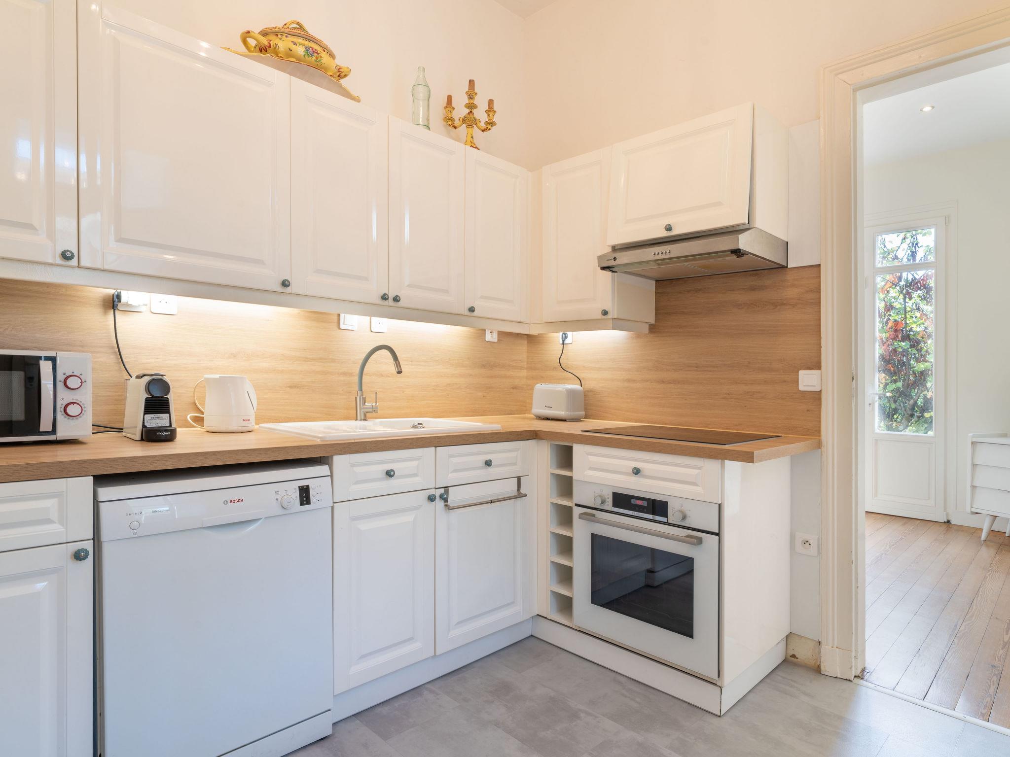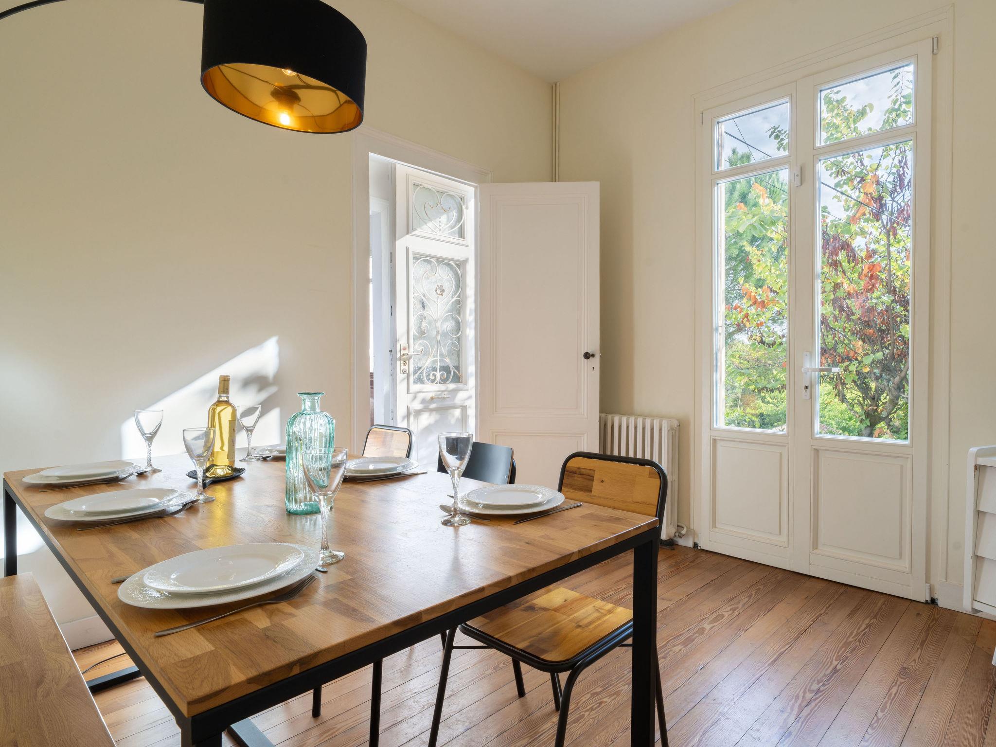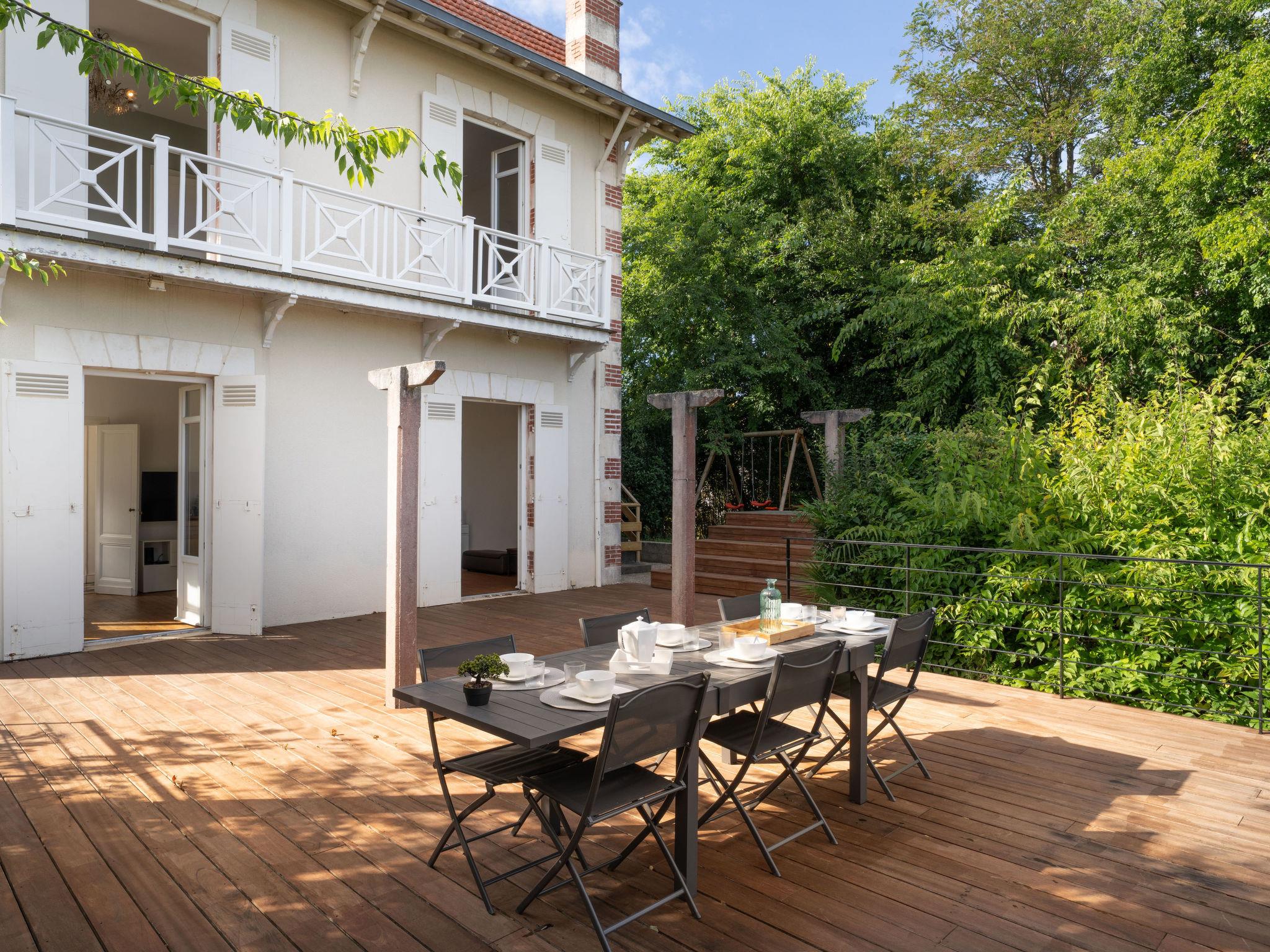 Arcachon: Large single-family house "Miarka", built in 1900. In an elevated position, 230 m from the sea, 230 m from the beach. Parking (for 2 cars). Shop 1.8 km, grocery, supermarket 750 m, shopping centre 3.9 km, restaurant 160 m, bar 750 m, bakery 210 m, café 600 m, bicycle rental 800 m, bus stop "Plage d'Eyrac" 170 m, railway station "Arcachon" 1 km, sandy beach "Plage d'Eyrac" 230 m, park "Mauresque" 1.9 km, diving center 1.5 km, thermal baths "Thalazur" 4.2 km. Sports harbour 2.6 km, golf course (18 hole) 4.8 km. Nearby attractions: Dune du Pyla 11.5 km, Eratopia 9.1 km, Navette Maritime pour le Cap Ferret 2.2 km, Casino 650 m, Marché Municipal 1.1 km, Observatoire Sainte Cécile 2.8 km. Well-known lakes can easily be reached: Lac de la Magdeleine 10.6 km, Lac de Cazaux 18.9 km. The owner does not accept any youth groups. Please note: the keys‘ handover takes place by the agency Interhome in Arcachon, 2 km. The owner lives on the same property. Neighbourhood highly sensitive to noise. Quietness and good behaviour expected.