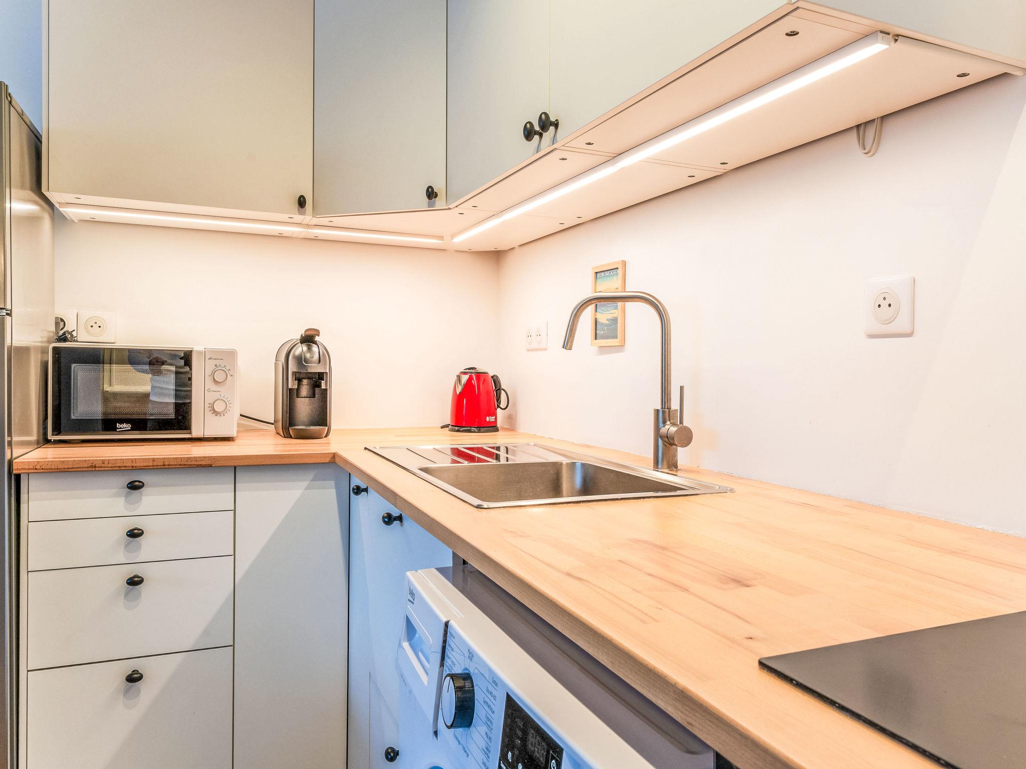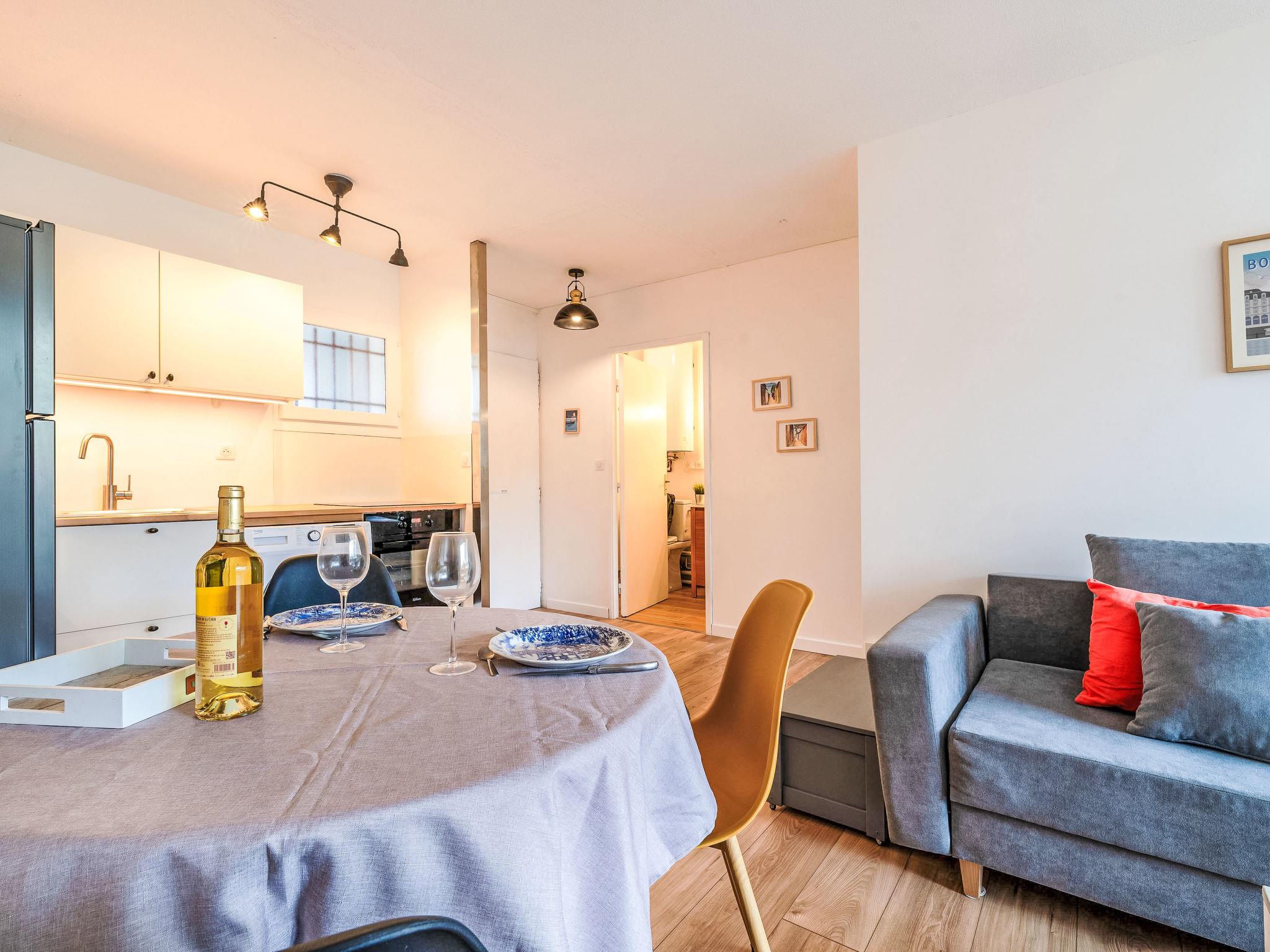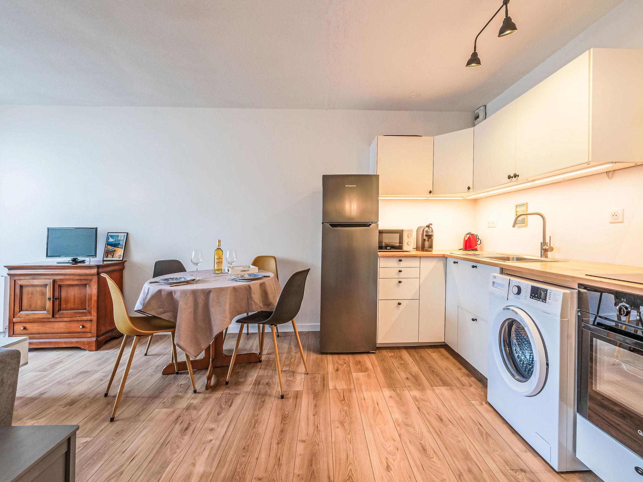 2-room apartment 32 m2, on the ground floor. Beautiful furnishings: dining room with TV (flat screen). Exit to the terrace. 1 room with 1 french bed (1 x 140 cm, length 190 cm). Open kitchen (oven, 3 induction hot plates, toaster, kettle, microwave, freezer, electric coffee machine, Capsules for coffee machine (Nespresso) extra). Shower/WC. Electric heating. Terrace 17 m2, west facing position. Terrace furniture. Facilities: washing machine, hair dryer. Internet (WiFi, free). Parking (1 car) at 100 m. Please note: smoke alarm. Offer by a private individual according to Art. 155, IV of CGI. 33009003709C8