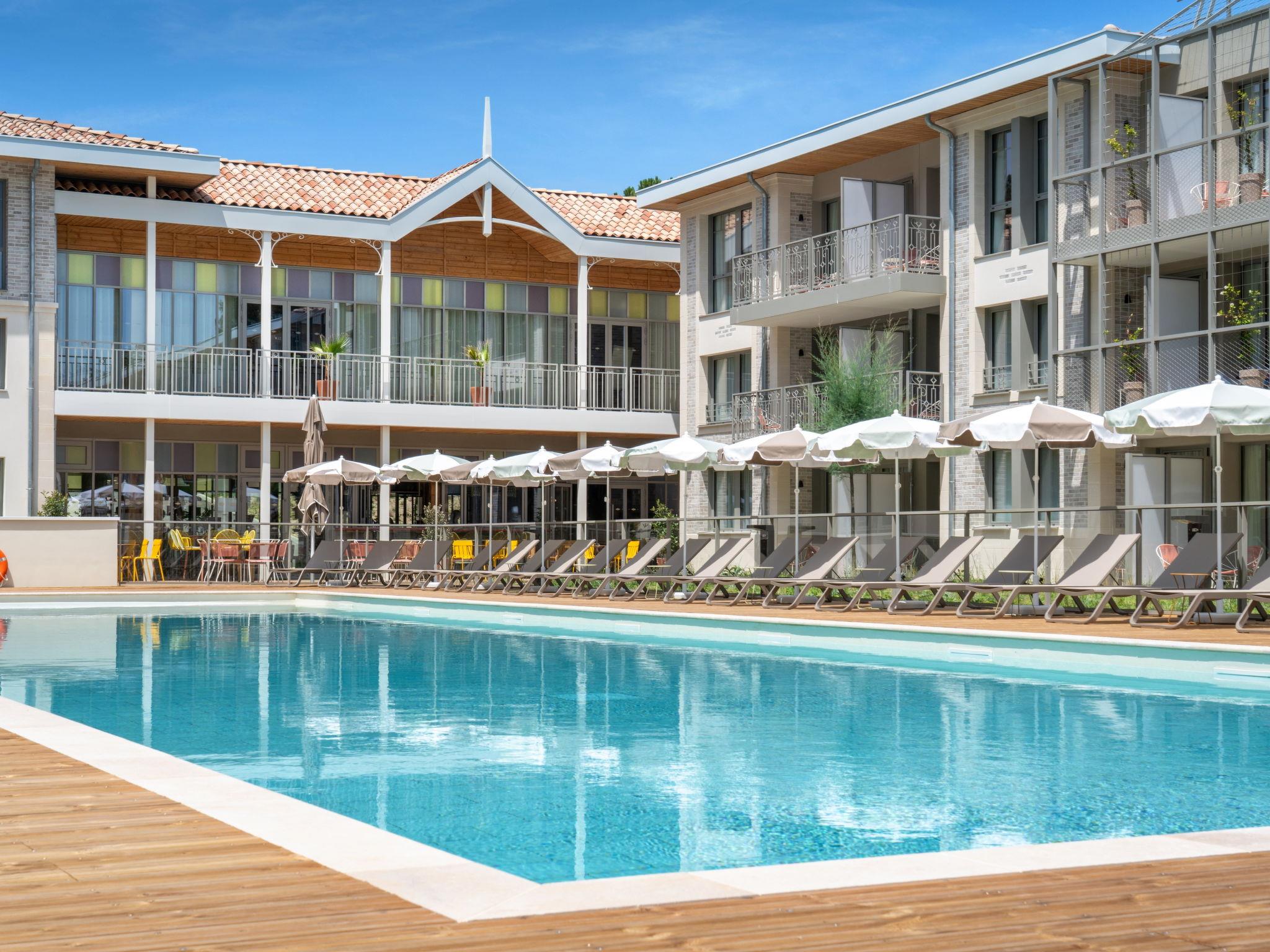 Very beautiful aparthotel "La Résidence", 3 storeys, built in 2025. On the outskirts, 3 km from the centre of Arcachon, in the residential district, 10 m from the edge of the forest, 100 m from the sea, 100 m from the beach. For shared use: park 6'290 m2 (fenced), swimming pool heated (28 x 7 m, depth 100 - 150 cm, seasonal availability: 01.Apr. - 30.Oct.) with shutter cover. WC in the pool area. In the house: reception, restaurant, bar, breakfast room, fitness room, bicycle rental. Room cleaning daily on request (extra). Parking (extra). Shop 3 km, restaurant, bus stop 50 m, sandy beach "Pereire" 100 m. Golf course (18 hole) 3 km, tennis 200 m, cycle lane 100 m. Nearby attractions: Arcachon 3 km, Bordeaux 75 km. Hiking paths: Dune du Pilat 7 km. Please note: baby equipment on request (included). The photograph shows a typical example.