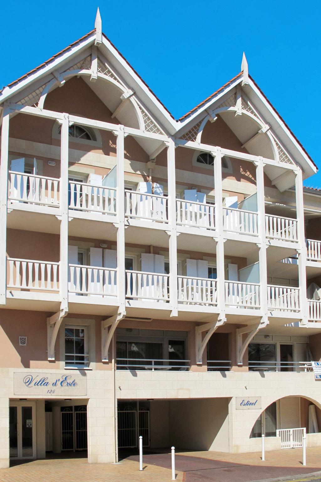Beautiful residence "Villa d'Este", 4 storeys. 12 apartments in the residence. 200 m from the centre of Arcachon, 5 km from the centre of La Teste-de-Buch, 70 km from the centre of Bordeaux, in a central position, 500 m from the sea. In the complex: reception, WiFi, storage room for bicycles. Shop 200 m, supermarket 300 m, restaurant, café, pedestrian zone 200 m, bus stop "Ligne 3" 550 m, sandy beach "Bassin d'Arcachon" 500 m. Golf course (18 hole) 5 km. The photo is just an example. The holiday properties may differ in living space, floorplan, equipment and furnishing. The reception with internet access (Wi-Fi, included) is located in the 'Jardin Mauresque' residence opposite.