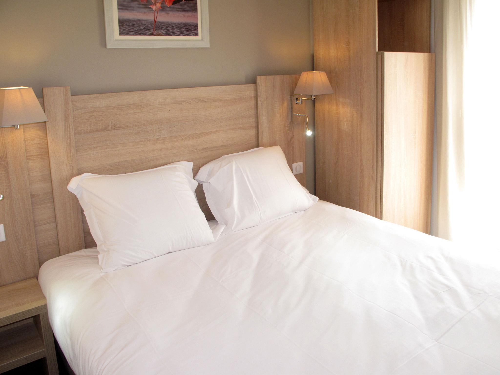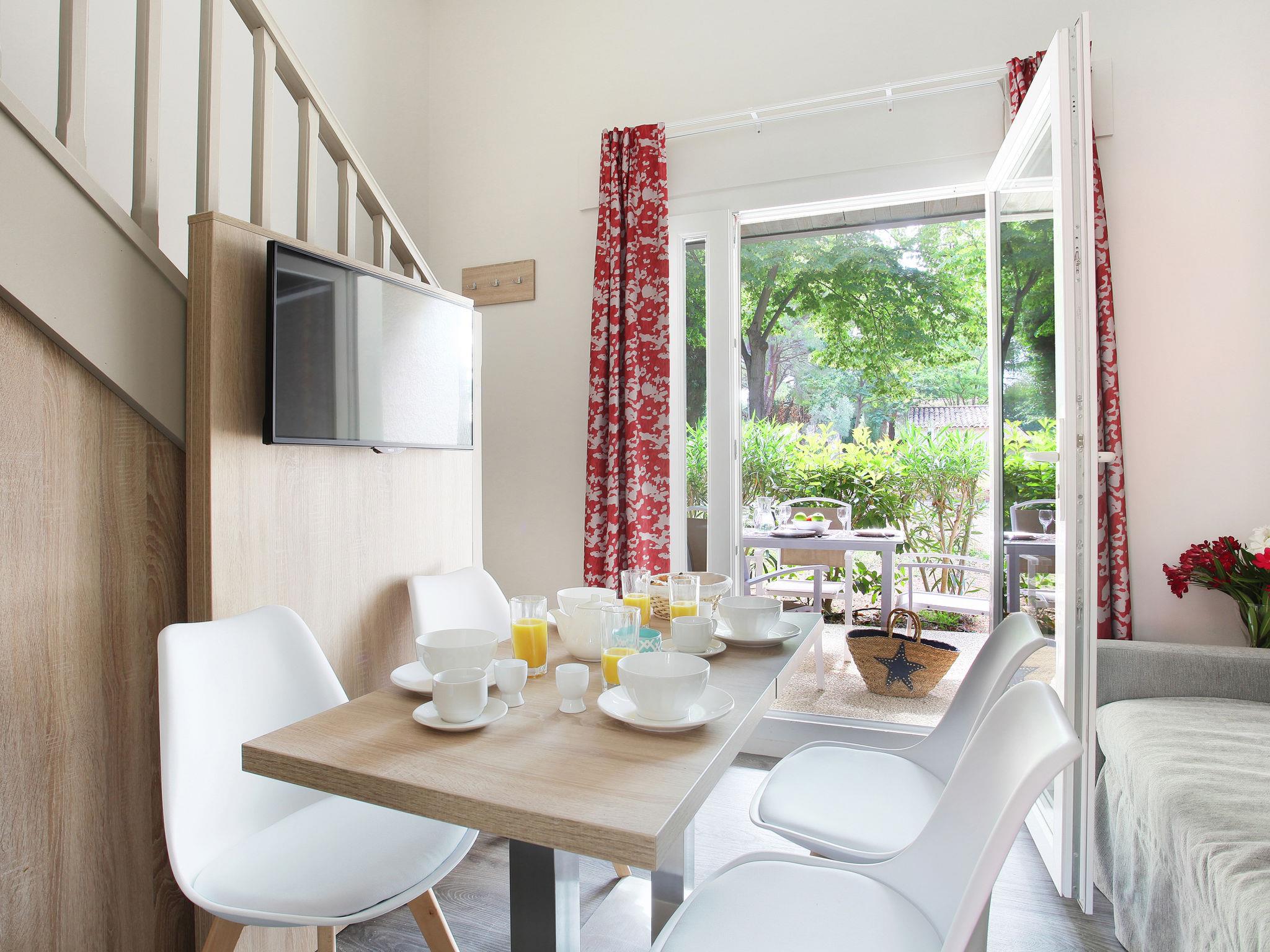 "Résidence Odalys Référence Les Gardians", 3-room apartment 36 m2 on 2 levels. Partly with sloping ceilings, renovated in 2017, practical and modern furnishings: small living/sleeping room with 1 double sofabed, dining table and satellite TV. Exit to the terrace. 1 room with 2 sleeping facilities. Exit to the terrace. Small, open kitchen (dishwasher, 4 ceramic glass hob hotplates, microwave, electric coffee machine). Shower, sep. WC. Upper floor: 1 room with sliding door with 2 sleeping facilities. Shower, sep. WC. Heating, air-conditioning. Balcony or terrace. Terrace furniture, balcony furniture. Facilities: children's high chair, baby cot (extra). Internet (WiFi, free). Please note: non-smokers only. Maximum 1 pet/ dog allowed. Smoke alarm, fire extinguisher. Maximum occupancy: 5 persons.