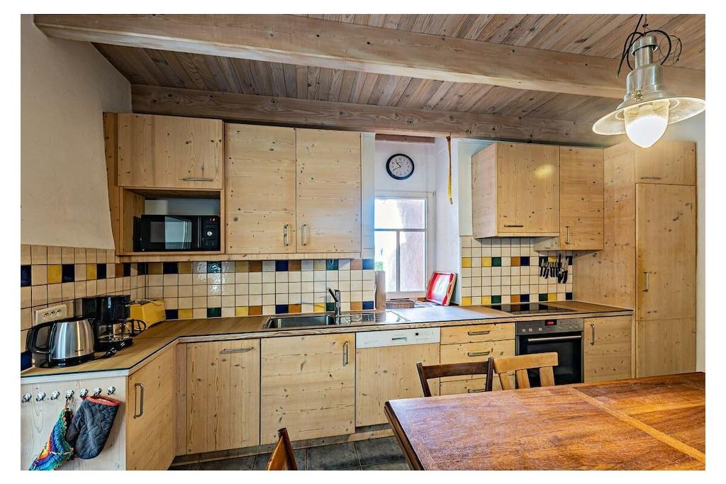 Feriehuset har tre soveværelser, badeværelser, et stort, veludstyret køkken og en rummelig stue. Det tilbyder en rummelig, behagelig og hyggelig atmosfære og er blevet renoveret efter økologiske byggeprincipper (massivt træ, kalkpuds). Sengene er alle 200 cm lange, og vi har sørget for at vælge latex- eller skummadrasser af høj kvalitet. Huset har et meget behageligt indeklima, især om sommeren, på grund af dets delvist meget tykke vægge. En stor, indhegnet have er tilgængelig med store bænke og borde til spisning og liggestole til afslapning. En opvarmet og (hvis nødvendigt) overdækket swimmingpool er tilgængelig for feriehusets gæster.
