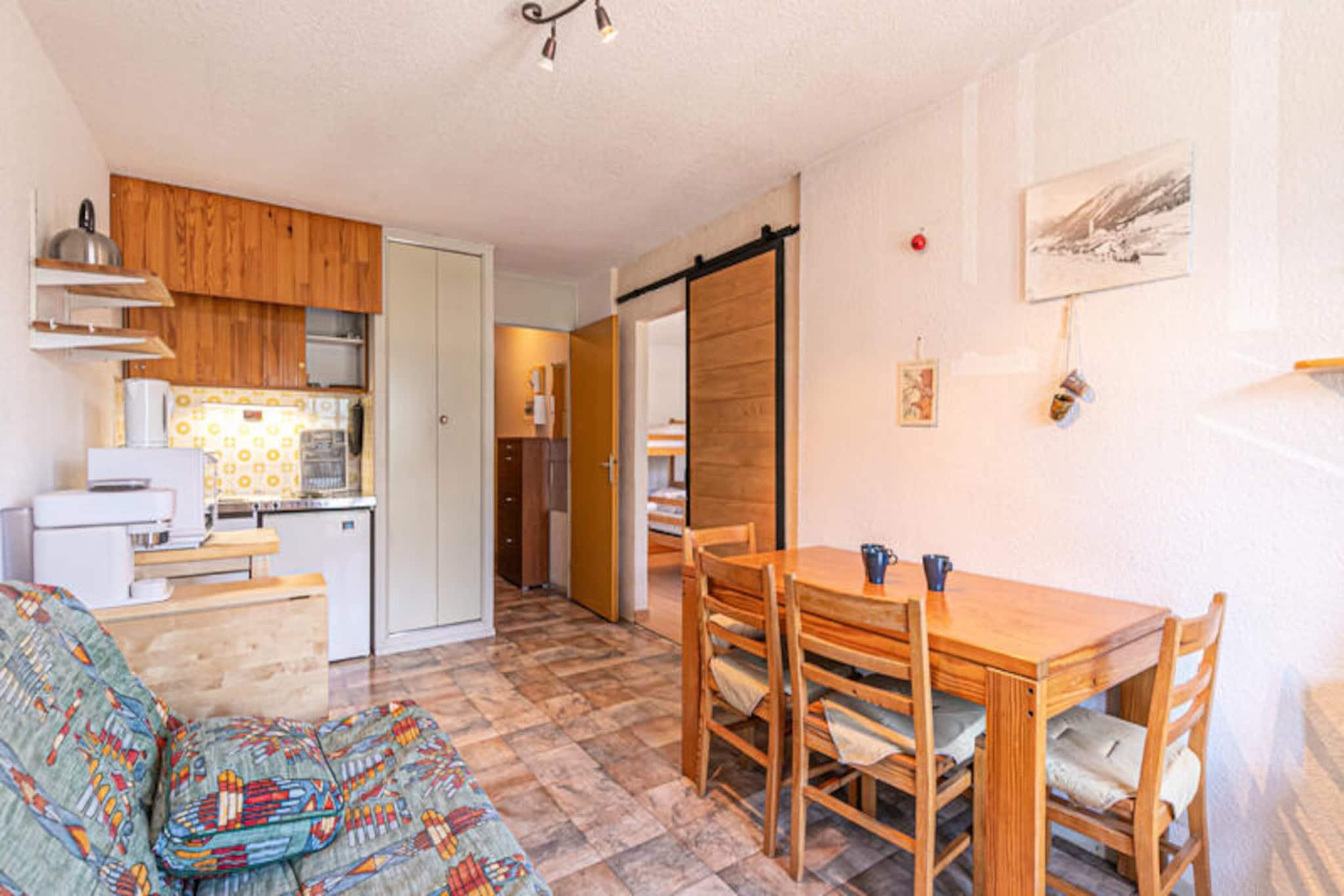 I den charmerende alpelandsby Aussois, hvor de majestætiske tinder i Maurienne-dalen skaber en betagende kulisse, tilbyder denne hyggelige lejlighed i residensen 'Les Sétives' et roligt tilflugtssted for bjergentusiaster. Beliggende kun 300 meter fra skilifterne og få skridt fra lokale butikker, er det den perfekte base for dit næste alpine eventyr. Uanset om du besøger stedet om vinteren for de uberørte pister eller om sommeren for naturskønne vandreture, placerer denne ejendom dig i hjertet af det hele. Lejligheden, der ligger på anden sal i en traditionel bygning i alpin stil, strækker sig over 34 kvadratmeter og har komfortabel plads til op til fire gæster. Den sydøstvendte balkon inviterer dig til at nyde den uhindrede udsigt over de omkringliggende bjerge, mens den lyse og funktionelle indretning sikrer et afslappende ophold. Soveværelset har fire enkeltsenge, herunder en dobbeltkøjeseng og to enkeltsenge, der kan sættes sammen, hvilket gør det ideelt for familier eller små grupper. Opholdsstuen er udstyret med et tv og et veludstyret køkken med elektrisk kogeplade, køleskab og ovn, perfekt til at tilberede solide måltider efter en dag med udforskning. Yderligere bekvemmeligheder inkluderer et skirum og muligheden for at leje sengelinned og håndklæder for ekstra komfort. Aussois er en malerisk landsby, der blander traditionel Savoyard-charme med moderne bekvemmeligheder. Ud over skiløb tilbyder regionen et væld af aktiviteter, lige fra sneskovandring og kælkning i de koldere måneder til vandreture, klatring og udforskning af Vanoise Nationalpark om sommeren. Boligens centrale beliggenhed sikrer nem adgang til lokale restauranter, bagerier og butikker, så du kan fordybe dig i den varme gæstfrihed i denne alpine perle. For dem, der søger en rolig, men eventyrfyldt ferie, er denne lejlighed i 'Les Sétives' din port til uforglemmelige minder i de franske alper.