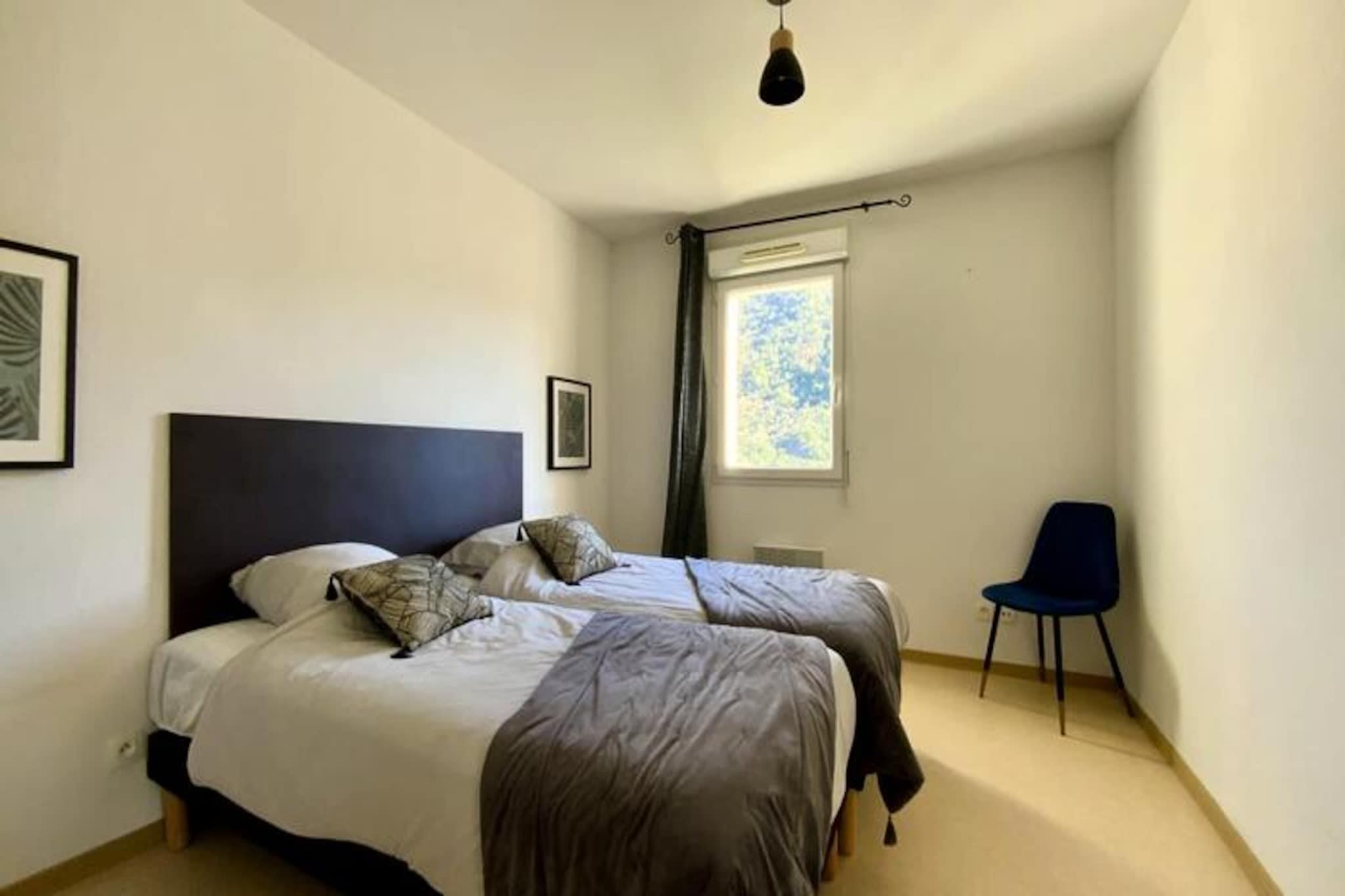 I hjertet af Haut-Languedoc Regional Naturpark, hvor Cévennes-bjergene møder den fredfyldte Upper Orb-dal, tilbyder denne charmerende lejlighed på anden sal en rolig oase kun 10 minutters gang fra den berømte Avène Thermal Spa. Omgivet af frodige landskaber og maleriske stier er det det perfekte tilflugtssted for både naturelskere og wellness-søgende. Forestil dig at starte din dag med en slentretur gennem den historiske landsby Avène, indånde den friske bjergluft og afslutte den med et bad i det beroligende termiske vand. Lejligheden er omhyggeligt designet til komfort og bekvemmelighed og har en rummelig åben opholdsstue med et fuldt udstyret køkken, spiseplads og en hyggelig sovesofa. Store vinduer fylder rummet med naturligt lys, og den udendørs terrasse inviterer dig til at slappe af med en kop kaffe eller nyde et måltid under åben himmel, mens du nyder det omkringliggende grønt. To soveværelser - et med to enkeltsenge og et andet med en køjeseng - giver rigelig soveplads til familier eller små grupper. Moderne bekvemmeligheder som Wi-Fi, fladskærms-tv og vaskemaskine sikrer et stressfrit ophold, mens sengetøj og håndklæder er inkluderet for din bekvemmelighed. Træd udenfor og oplev en verden af ??eventyr. Fra vandreture omkring Avène-søen til at udforske de dramatiske Héric- og Colombières-sur-Orb-kløfter, byder regionen på utallige muligheder for at genoprette forbindelsen til naturen. Besøg den charmerende landsby Olargues, en af ??Frankrigs smukkeste landsbyer, eller cykl gennem vinmarker og bølgende bakker. For en forfriskende dukkert er stedets swimmingpool åben i sommermånederne og er et perfekt sted at slappe af efter en dag med udforskning. Uanset om du søger en foryngende spa-ferie eller en aktiv ferie i det fri, tilbyder denne bolig den ideelle base for at skabe varige minder i en af ??Frankrigs mest fortryllende regioner.
