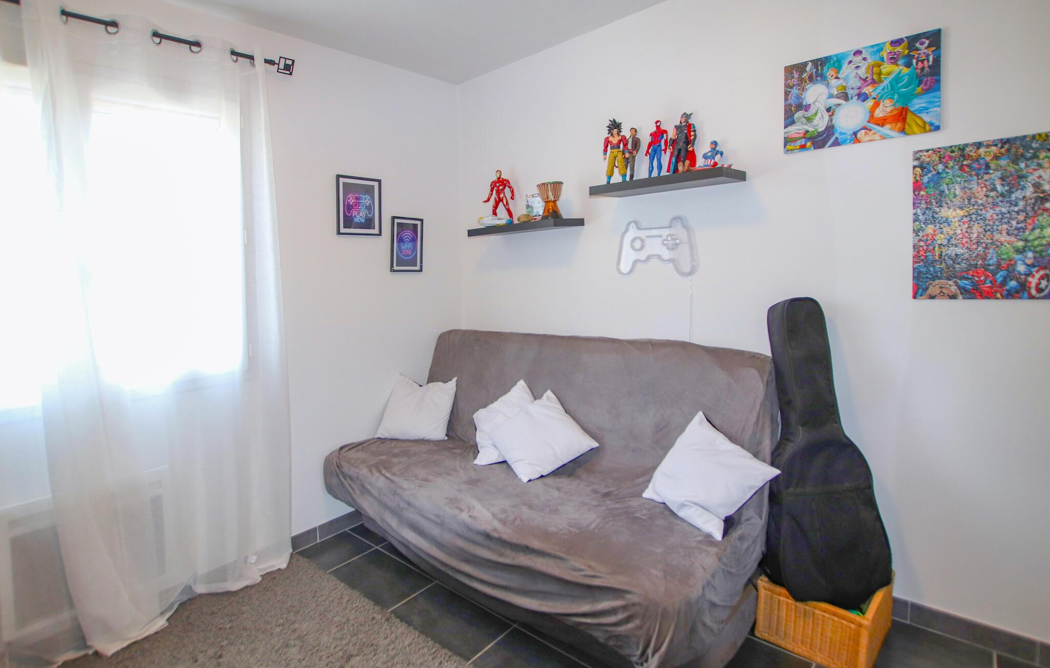 Dette roligt beliggende feriehus nær den fortryllende fæstningsby Avignon lægger op til at tage en afslappende pause i dens lyse, provencalske atmosfære. Tilbered lækre retter i det moderne køkken og tag plads ved det stilfulde spisebord. Find jer godt til rette i det indbydende sofaområde, tænd brændeovnen på kølige dage, se en film eller lyt til jeres yndlingsmusik.