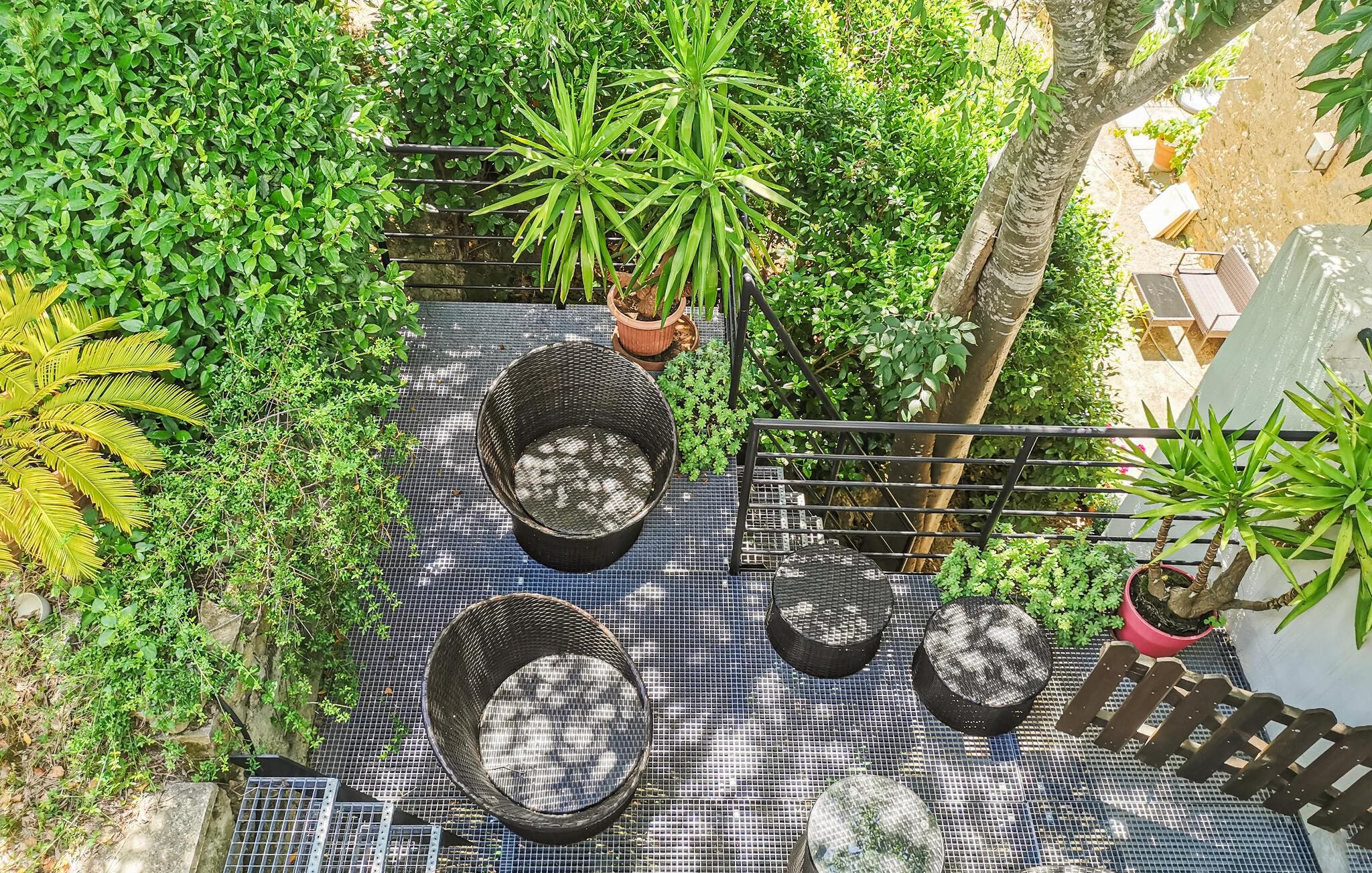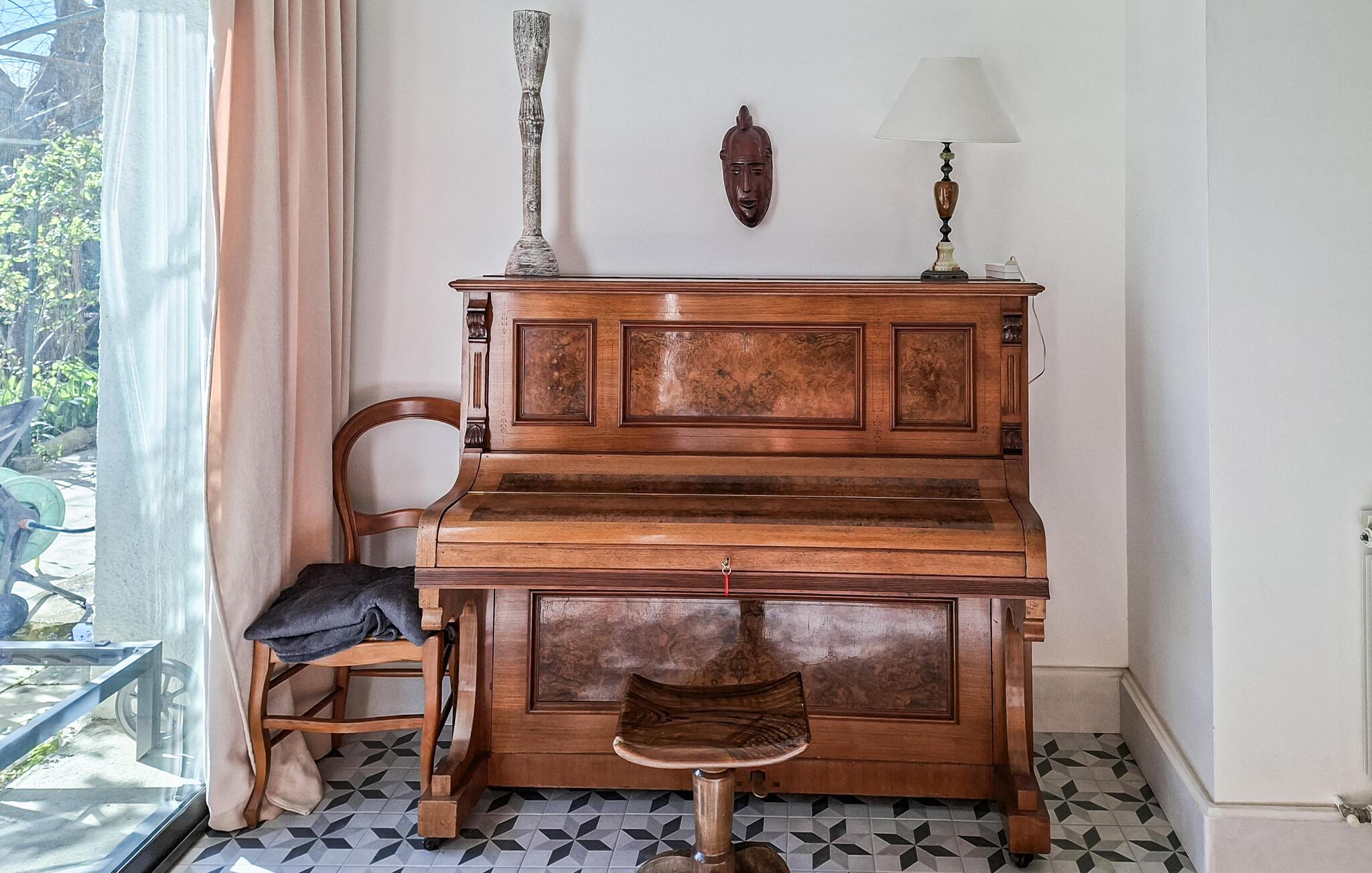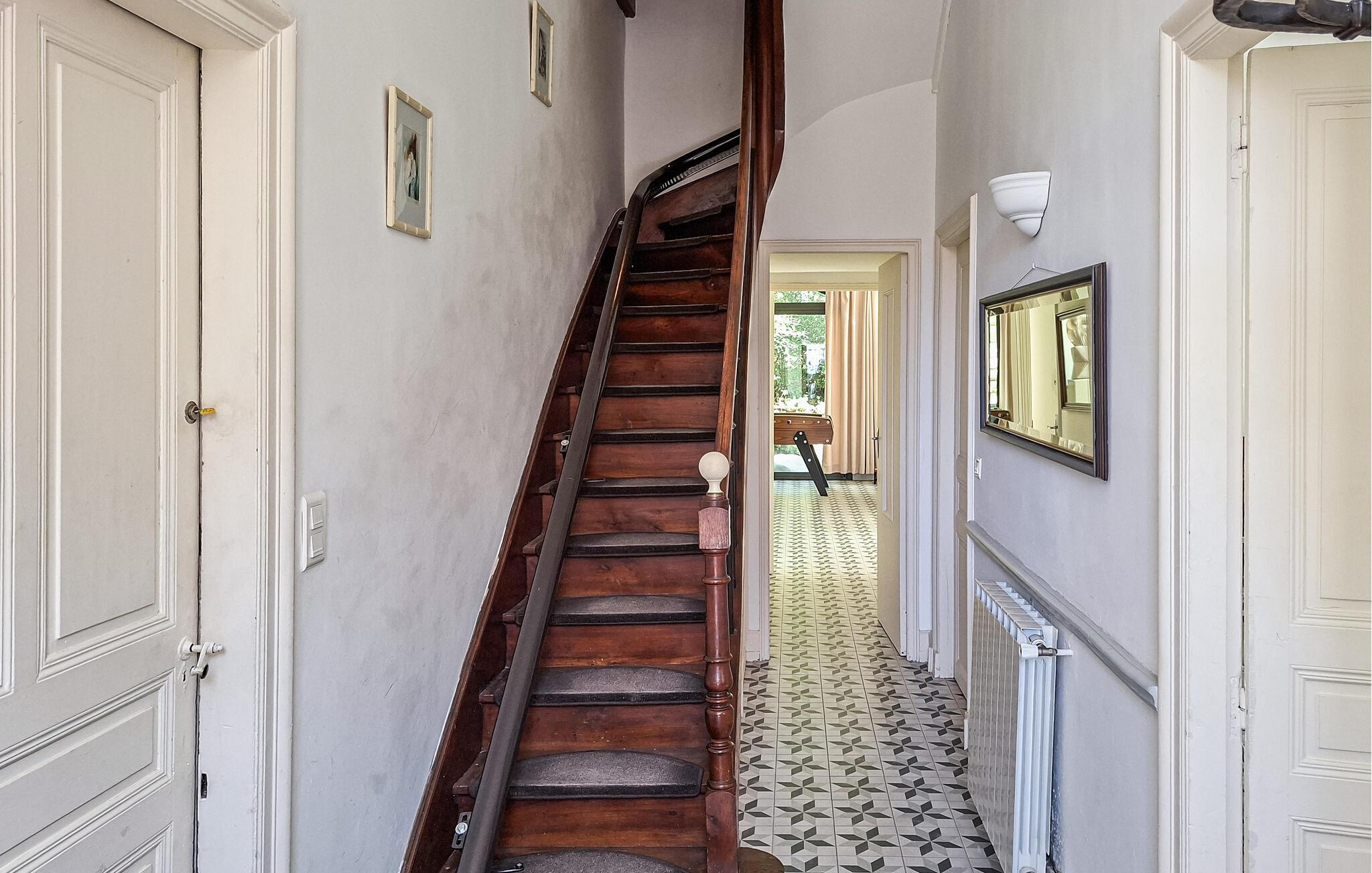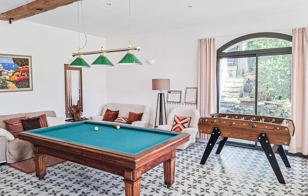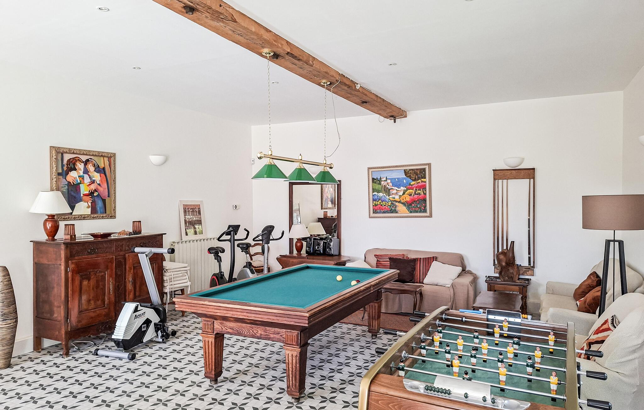 Saltvandspoolen med en romersk trappe er 1,55 m dyb, og ligger midt i den frodige, solrige have. Huset er smagfuldt indrettet med højt til loftet og synlige bjælker. Stuen åbnes ud mod terrassen, hvorfra I har en dejlig udsigt - helt perfekt til afslapning og hyggeligt samvær. Første etage kommer I til via trappen eller elevatoren. Her findes også en stor spisesal med tv-område, billard og bordfodbold.