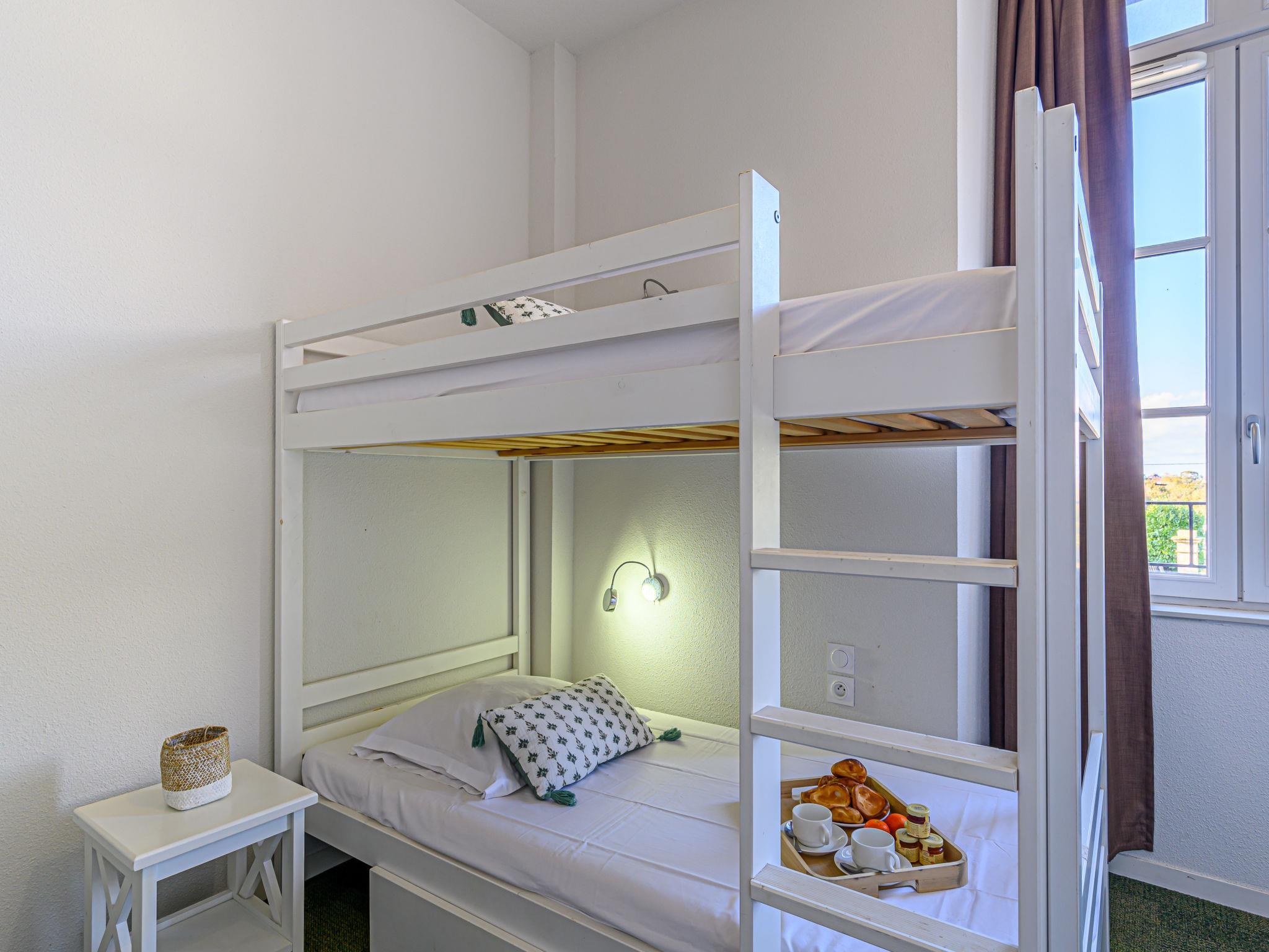 "Château De Kergonano,", 3-room apartment 56 m2 on 1st floor. Practical and beautiful furnishings: living/dining room with 1 double sofabed and TV (flat screen). Exit to the balcony. 1 room with 1 french bed (1 x 140 cm, length 190 cm). 1 room with 1 x 2 bunk beds (90 cm, length 190 cm). Kitchenette (dishwasher, 4 ceramic glass hob hotplates, toaster, kettle, microwave, electric coffee machine). Shower, sep. WC. Electric heating. Balcony. View of the swimming pool and the garden. Facilities: Internet (WiFi, extra). Parking. Please note: non-smokers only. Smoke alarm. Daily cleaning and change of linen possible on request and extra. Offer by a private individual according to Art. 155, IV of CGI. LOGEMENT A19