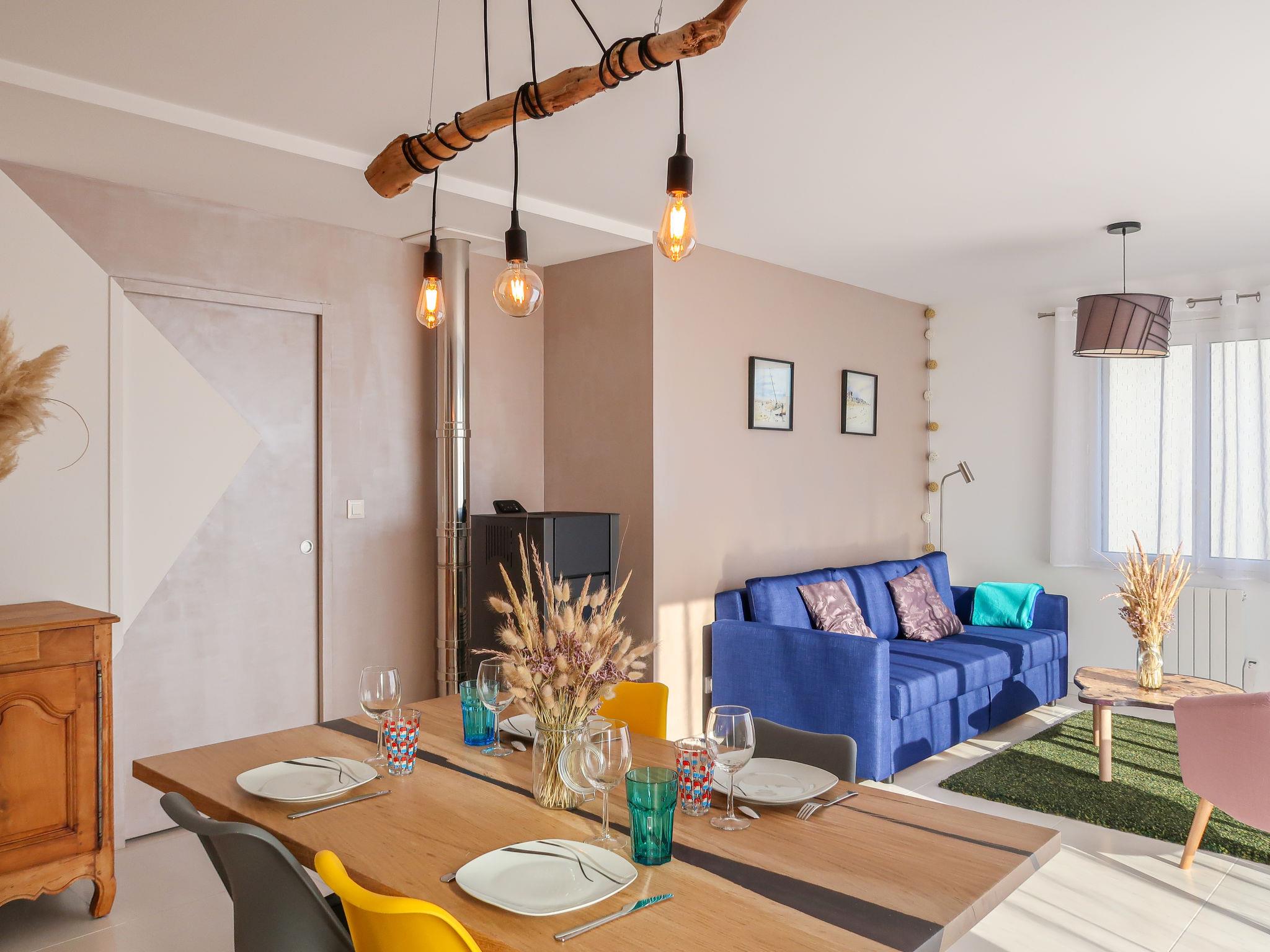 "Océane", 3-room house 70 m2. Bright, beautiful and tasteful furnishings: living/dining room with 1 double sofabed (1 x 140 cm, length 200 cm), TV and international TV channels (flat screen), wood-burning stove. 1 room with 1 french bed (1 x 160 cm, length 200 cm), bath/WC. 1 room with 2 beds (90 cm, length 190 cm). Open kitchen (oven, dishwasher, 4 ceramic glass hob hotplates, toaster, kettle, electric coffee machine). Bathroom, sep. WC. Electric heating. Large terrace 25 m2. Barbecue, deck chairs (6). Facilities: washing machine, baby cot. Internet (WiFi, free). Garage. Please note: non-smoking house. Maximum 1 pet/ dog allowed. Smoke alarm.