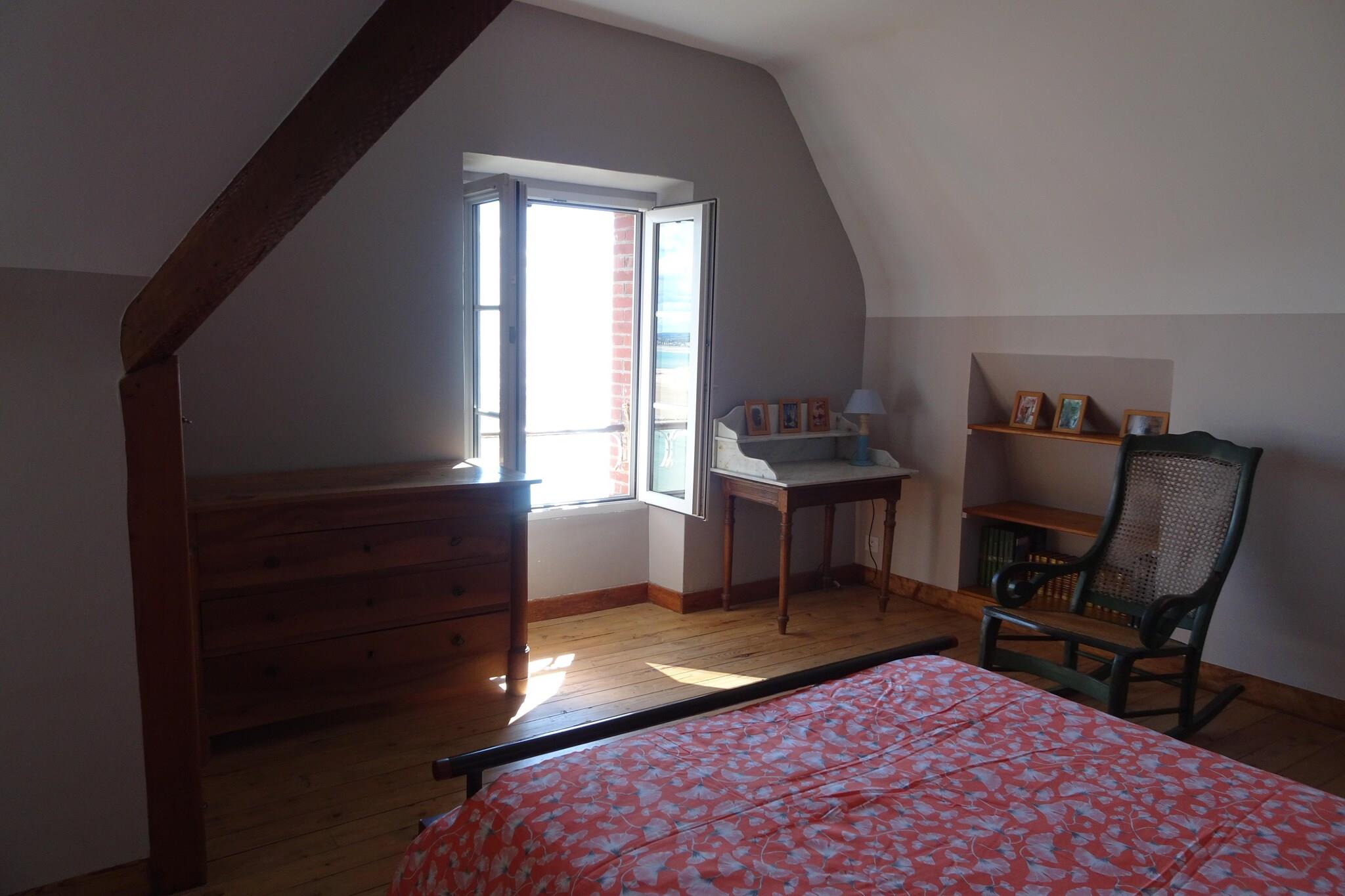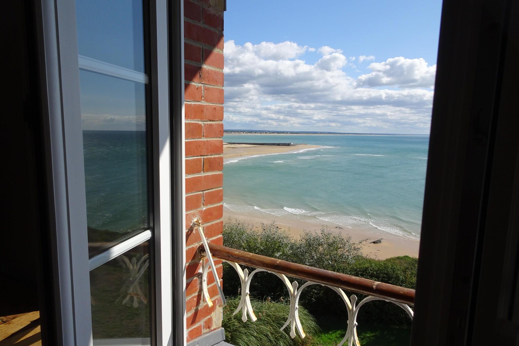 Højdepunktet ved dette feriehus er den fantastiske beliggenhed over stranden i La Potinière i det populære badested. Fra den rummelige have og næsten alle værelser i huset kan du nyde en vidunderlig udsigt over havet og kystområdet. Interiøret i feriehuset er meget enkelt og rustikt, men det giver tilstrækkelig komfort til en kølig ferie i Normandiet. Trappen og gangens vægge er pt. ikke renoveret endnu. På væggene er der inskriptioner, korrespondance fra amerikanere under krigen.Den store, smukt bevoksede have med grillplads indbyder til hyggelige måltider udendørs. For de vandrotter, der kommer tilbage fra stranden, er bruseren i stueetagen særlig praktisk, og især i højsæsonen sætter du stor pris på de 3 parkeringspladser på din egen ejendom. Den populære langdistance vandresti GR 233 passerer under ejendommen og giver dig direkte adgang til den hvide sandstrand foran den.