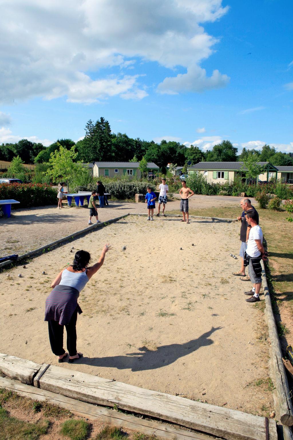 Child friendly resort "Les Hameaux de Miel". 3 km from the centre of Beynat, 25 km from the centre of Brive, 500 m from the lake, 500 m from the beach, in the countryside. For shared use: property 9 ha (fenced) with plants and trees, meadow, lawn for sunbathing, 2 swimming pools fenced (16 x 8 m, depth 90 - 190 cm, seasonal availability: 15.Apr. - 27.Sep. and 31.May. - 31.Aug.). Outdoor shower, table tennis, boccia, children's playground. In the complex: reception, WiFi, washing machine, tumble dryer (for shared use, extra). On request. Central parking spaces. Supermarket 3 km, bus stop 3 km. Nearby attractions: Accès au Lac payant (Juillet-août), Baignade surbveillée (10-17h). Please note: the photograph shows a typical example.