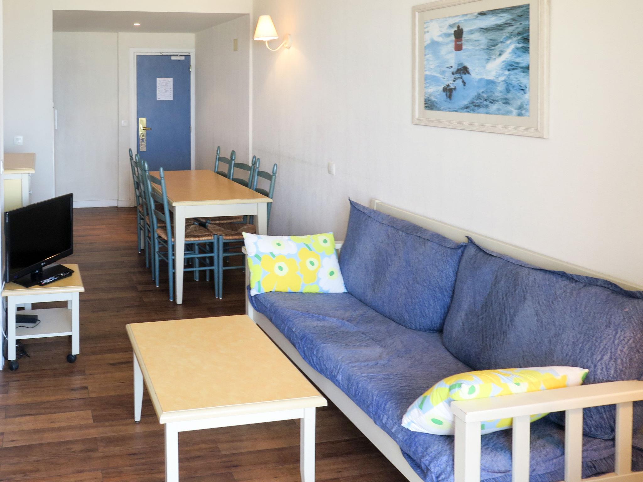 "Le Grand Large", 2-room apartment 45 m2, on the upper floor. Practical furnishings: living/sleeping room with curtain with 1 french bed (160 cm), dining table and TV. Exit to the balcony. 1 room with 2 beds. Alcove with 1 x 2 bunk beds. Kitchenette (4 ceramic glass hob hotplates, microwave, electric coffee machine). Shower, sep. WC. Oil heating. Balcony. Balcony furniture. Beautiful view of the sea. Facilities: safe. Internet (WiFi, free). Please note: maximum 1 small pet/ dog allowed. Smoke alarm, fire extinguisher. Animal max 8 kg. Instead of an enclosed bedroom, some sleeping areas are located in an open-plan area (gallery, alcove, etc.).