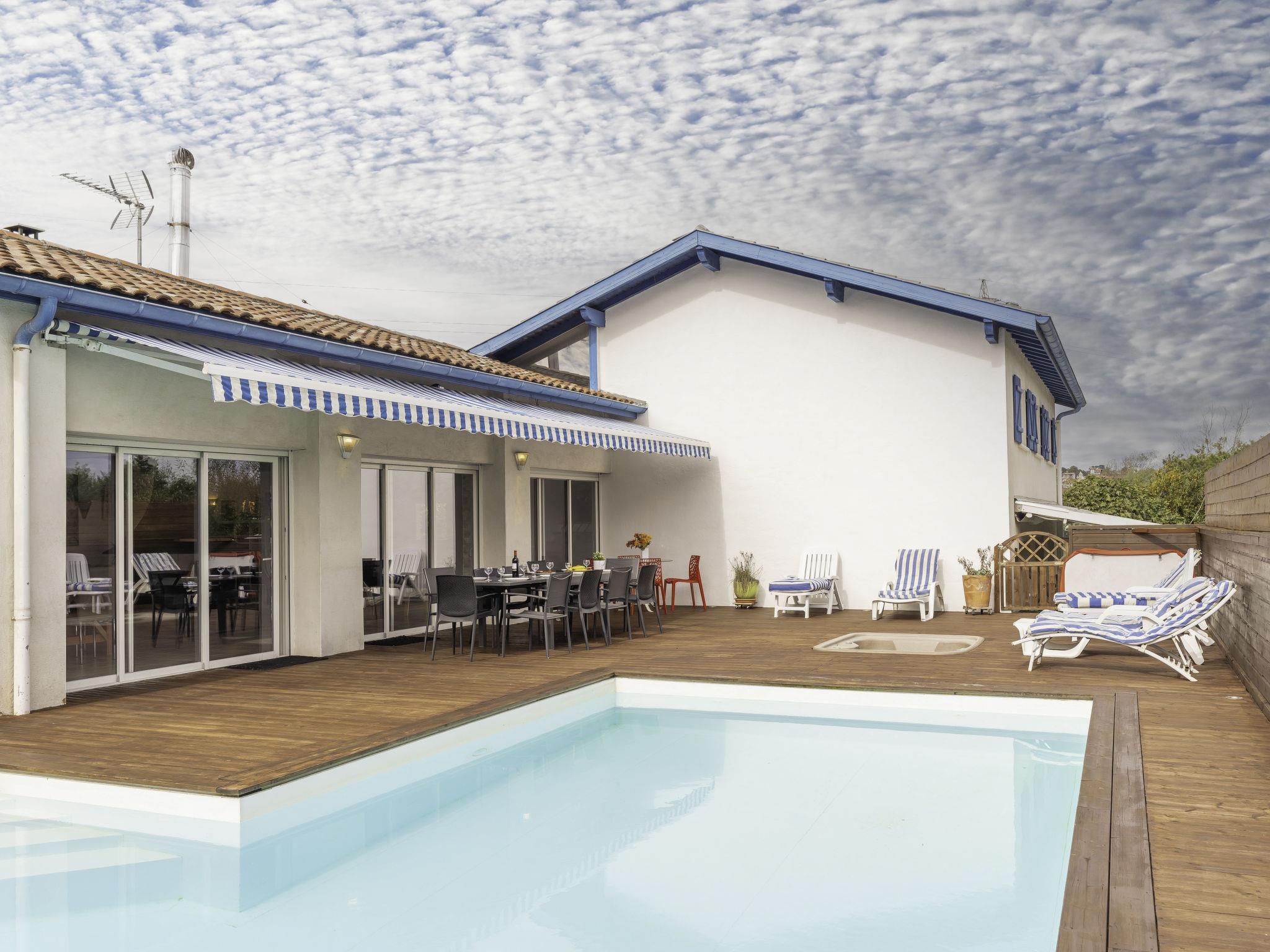 Bidart: Large villa "Villa Suerte", 3 storeys. In the district of Maribel, in a quiet position, from the sea, 650 m from the beach, in a cul-de-sac. Private: swimming pool heated (8 x 6 m, depth 180 cm, seasonal availability: 01.Jun. - 31.Dec.). Outdoor shower, hot tub, table tennis, barbecue. In the house: fitness room. Shop 600 m, grocery 1.3 km, supermarket 5 km, shopping centre 5 km, restaurant 600 m, bar, bakery 1.3 km, café, bus stop "Uhabia" 550 m, railway station "Biarritz" 7 km, sandy beach "Uhabia" 650 m, thermal baths "Helianthal" 7 km. Sports harbour 2.4 km, golf course (18 hole) 9 km, surf school 650 m. Nearby attractions: Bidaparc 1.5 km, Musée Saraleguinea 2.7 km, Citée de l'Océan 5.4 km, Pointe de Sainte Barbe 8.4 km. Hiking paths: la Rhune.
