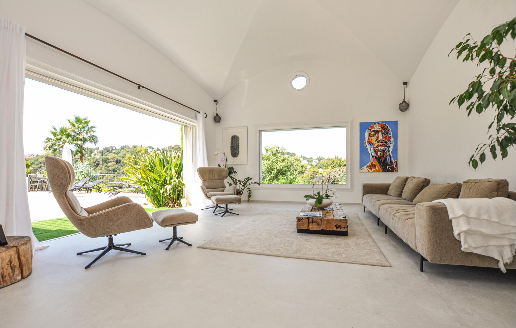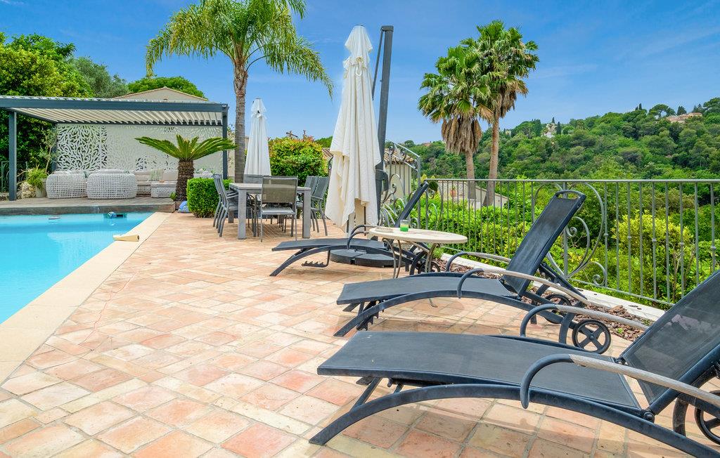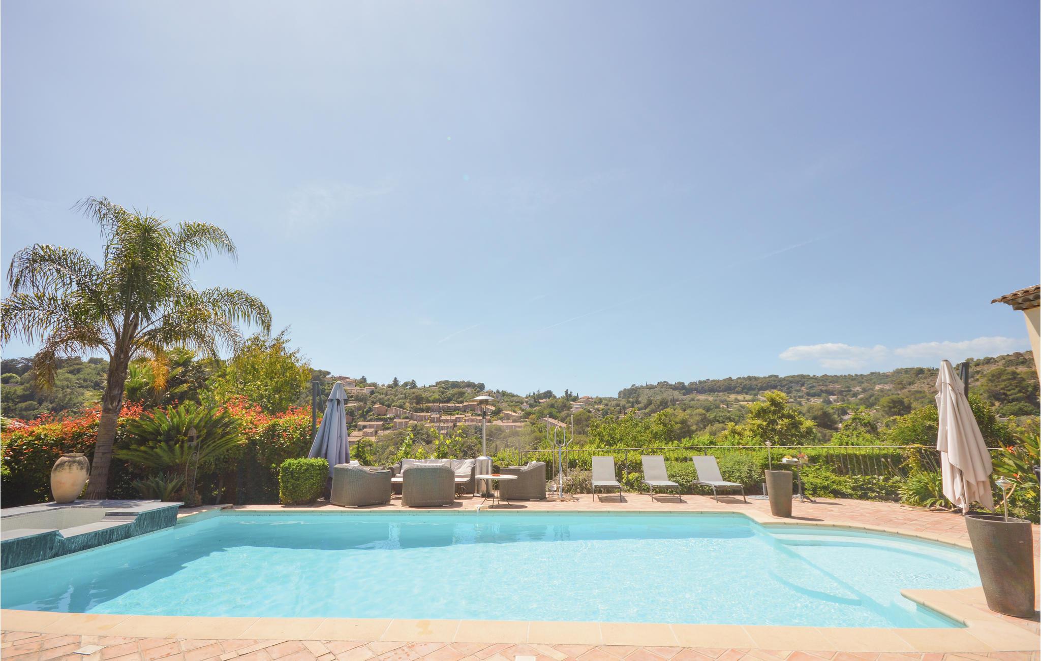 Feriehuset har en stor privat pool og en smuk terrasse med havemøbler og spiseplads. Stuen åbner ud mod poolområdet og er behageligt lys takket være de store vinduesfronter. Se frem til en luksuriøs og levende atmosfære, der også udstråler en behagelig ro. Et meget flot soveværelse i stueetagen har et tilstødende badeværelse og et af soveværelserne ovenpå har sin egen solterrasse. I kælderen er der et charmerende soveværelse med eget badeværelse.