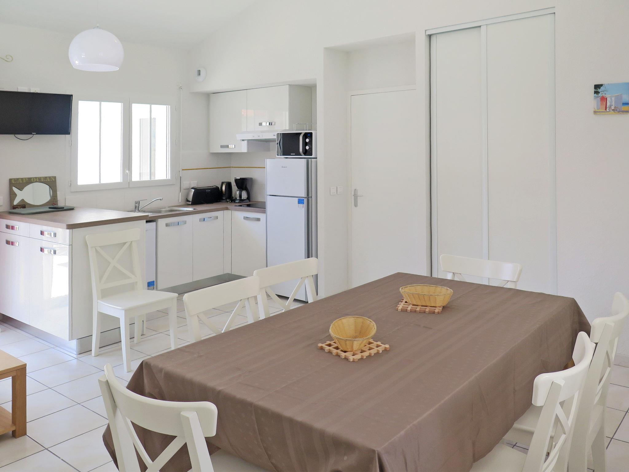 "Résidence Plage Océane", 5-room terraced house 80 m2 on 2 levels. Comfortable and beautiful furnishings: living/dining room with dining table and TV (flat screen). Exit to the terrace. 1 room with 2 beds (90 cm, length 190 cm). Exit to the terrace. 1 room with 1 pull-out bed (2 x 90 cm, length 190 cm). Kitchenette (dishwasher, 4 ceramic glass hob hotplates, toaster, kettle, freezer, electric coffee machine, Capsules for coffee machine (Nespresso) extra, combination microwave). Shower/WC. Upper floor: 1 room with 1 french bed (140 cm, length 190 cm). 1 room with 1 pull-out bed (2 pers. 2 x 90 cm, length 190 cm). Bathroom, sep. WC. Electric heating. Terrace. Terrace furniture. Facilities: washing machine, iron, children's high chair, baby cot (extra). Internet (WiFi, free). Please note: non-smokers only. Maximum 1 pet/ dog allowed. Smoke alarm.