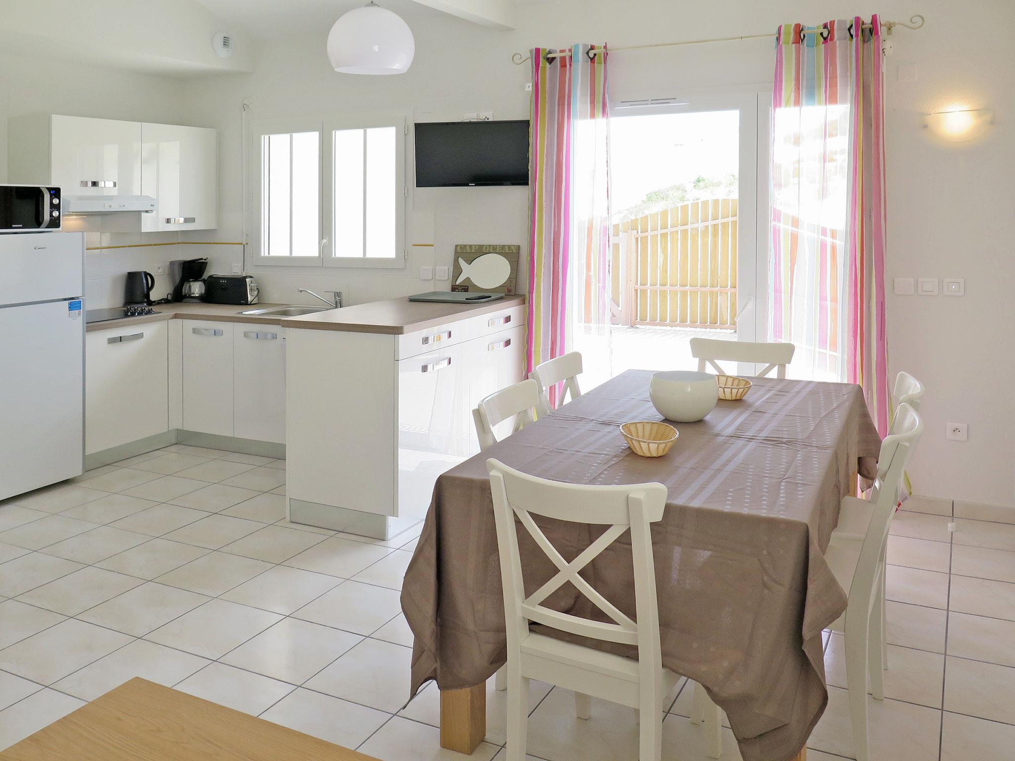 "Résidence Plage Océane", 3-room terraced house 57 m2. Comfortable and beautiful furnishings: living/dining room with dining table and TV (flat screen). Exit to the terrace. 1 room with 1 french bed (140 cm, length 190 cm). Exit to the terrace. 1 room with 1 pull-out bed (1 pers. 2 x 90 cm). Kitchenette (dishwasher, 4 ceramic glass hob hotplates, toaster, kettle, freezer, electric coffee machine, combination microwave). Bathroom, shower/WC. Electric heating. Terrace. Terrace furniture. Facilities: washing machine, iron, children's high chair, baby cot (extra). Internet (WiFi, free). Please note: non-smokers only. Maximum 1 pet/ dog allowed. Smoke alarm.