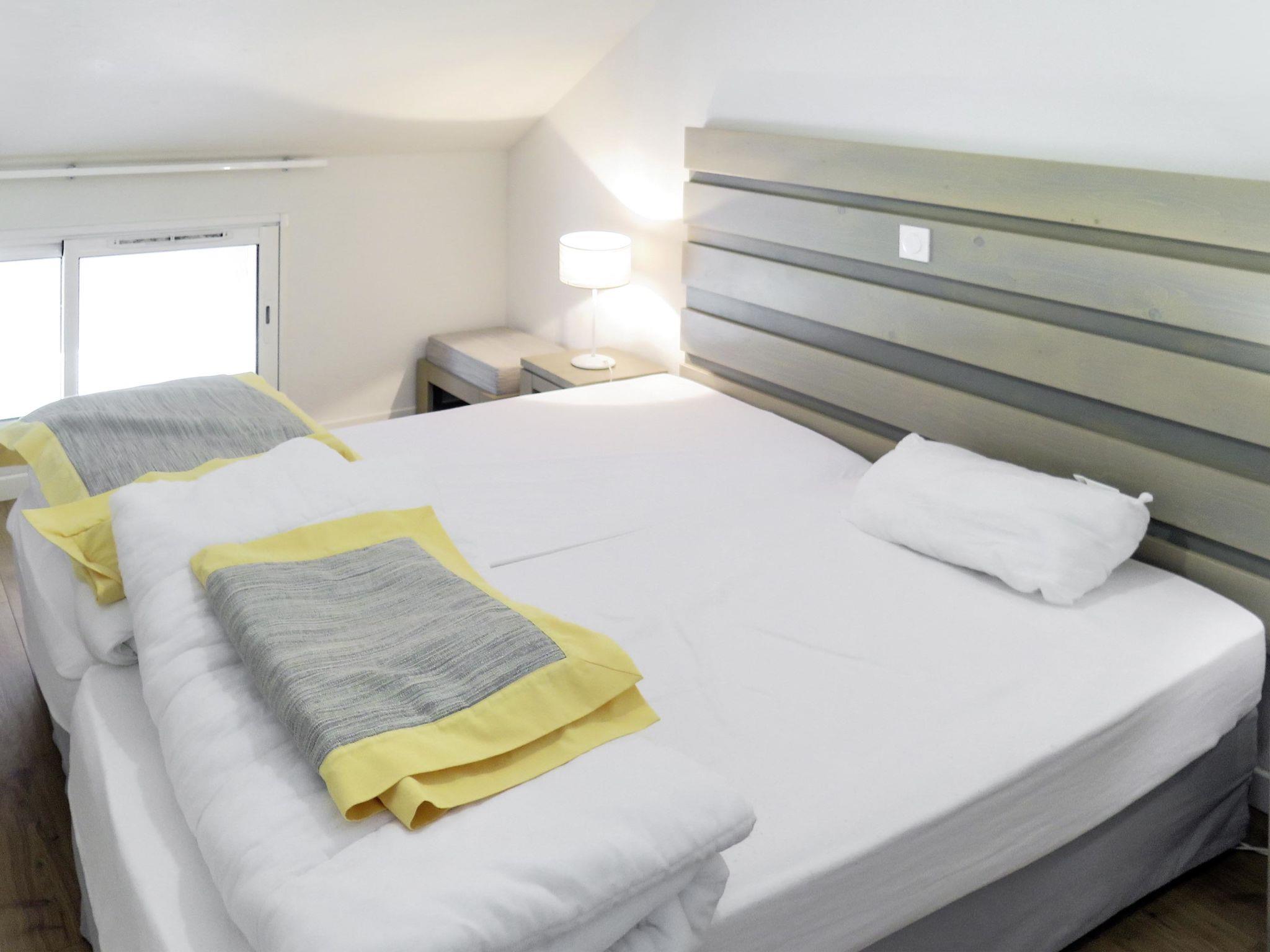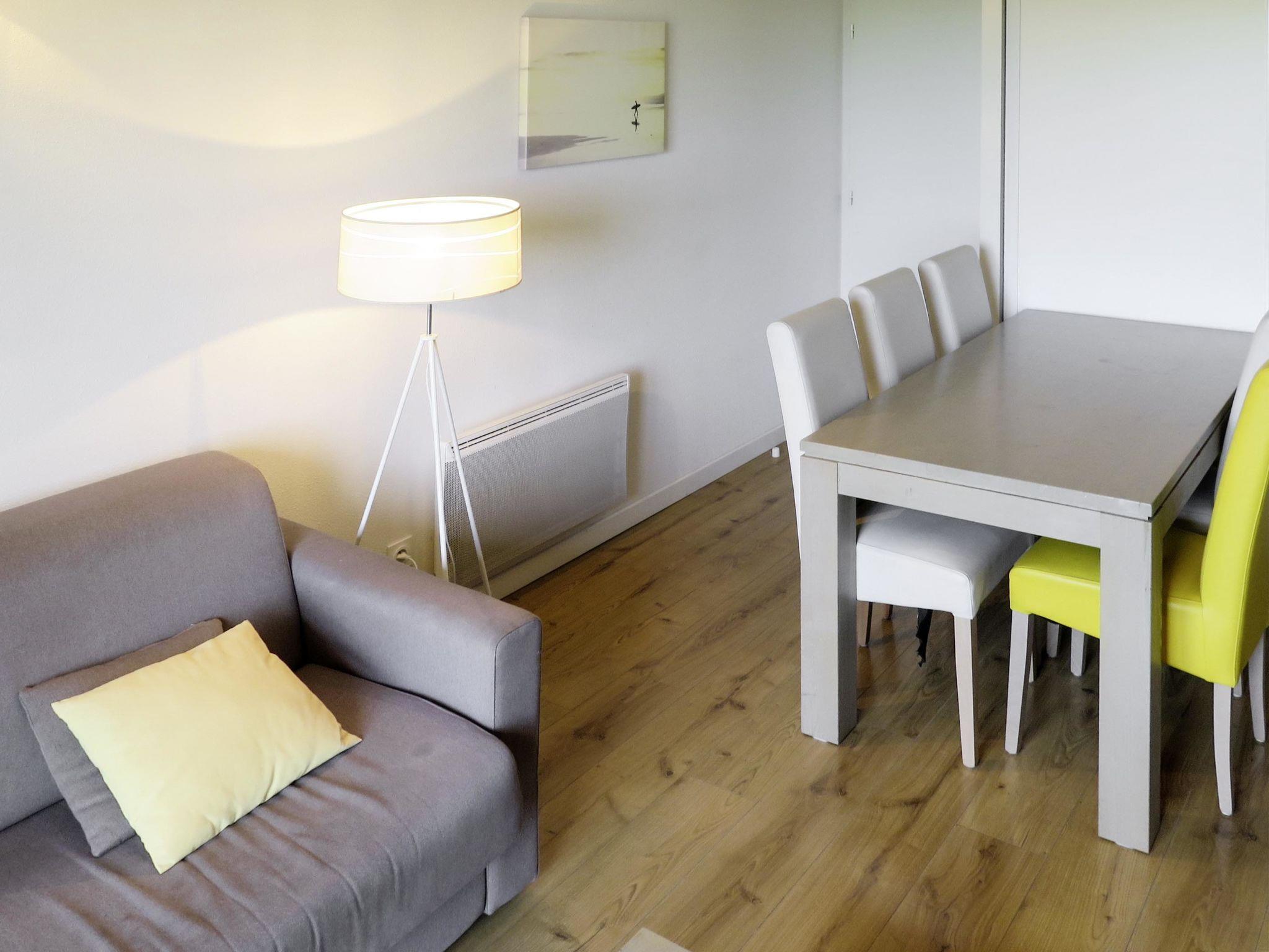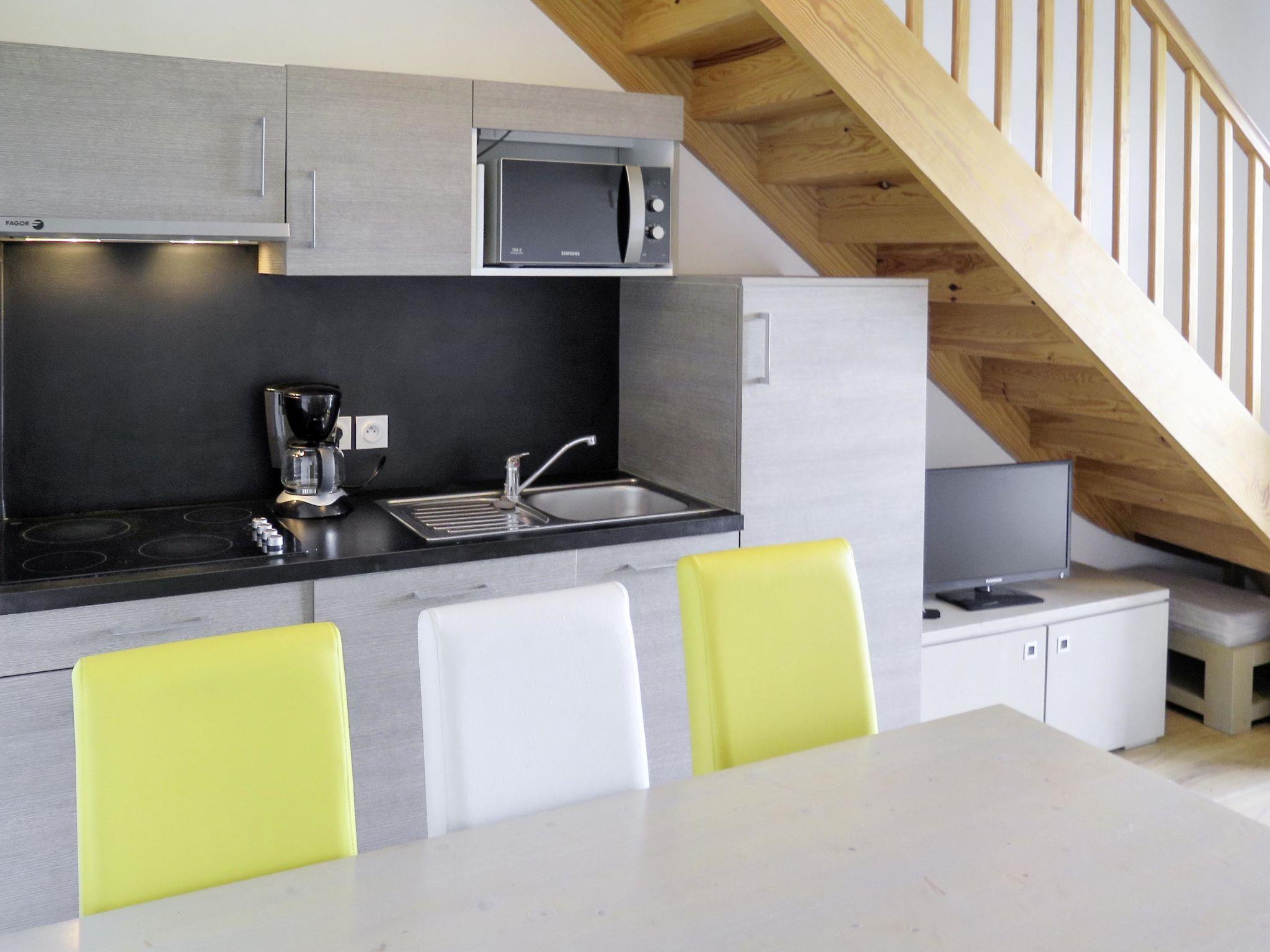 "Les Balcons de l’Océan", 3-room terraced house 43 to 47 m2 on 2 levels. Bright, cosy furnishings: living/sleeping room with 1 double sofabed, dining table and TV. Exit to the balcony, to the terrace. Kitchenette (dishwasher, 2 ceramic glass hob hotplates, combination microwave). Bathroom, sep. WC. Upper floor: 2 rooms, each room with 2 sleeping facilities. Electric heating. Balcony or terrace. Facilities: children's high chair, baby cot (extra). Internet (WiFi, extra). Please note: maximum 2 pets/ dogs allowed. Smoke alarm, fire extinguisher.