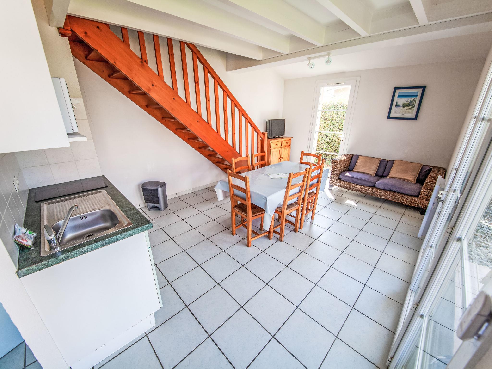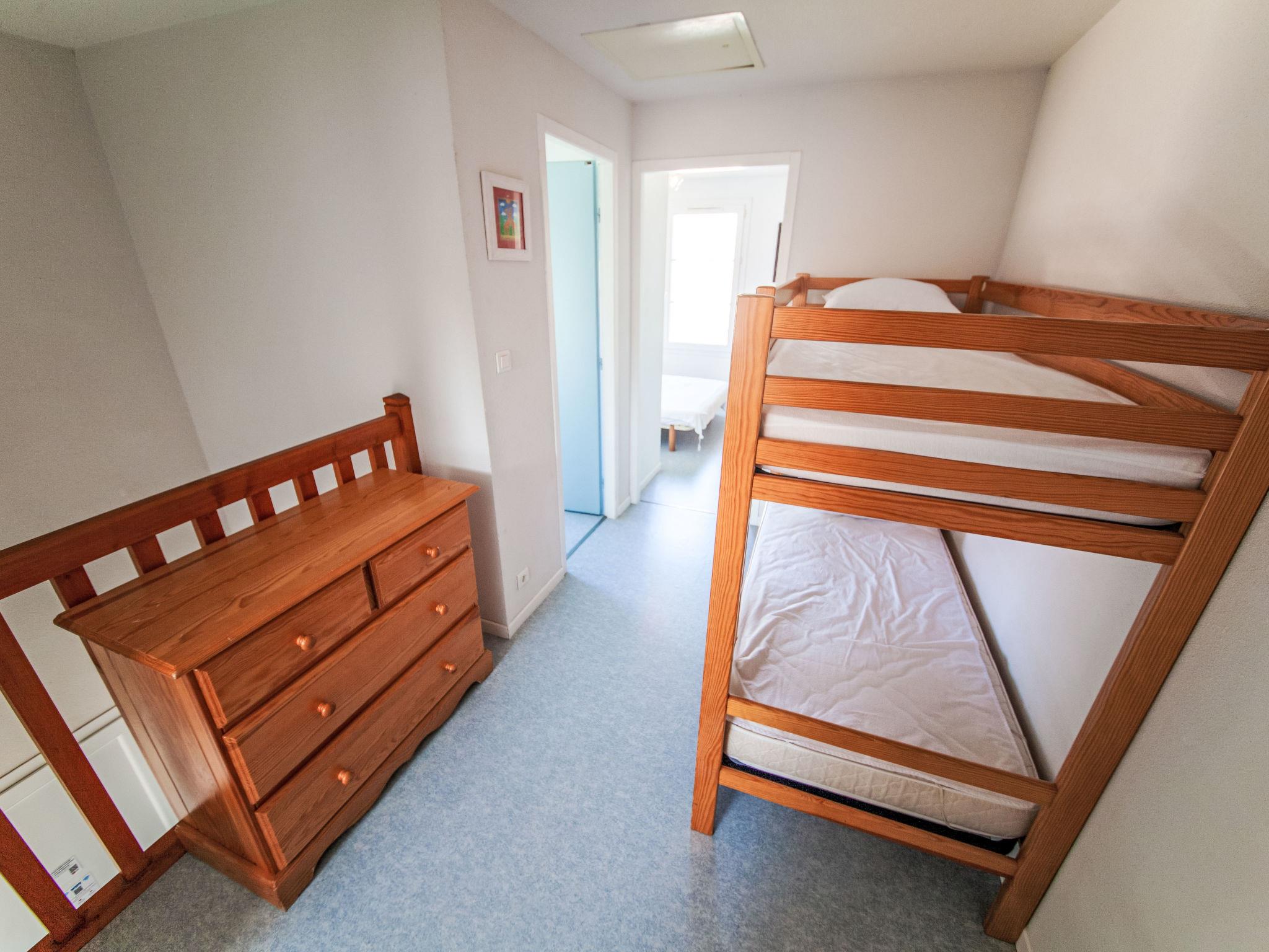 "Résidence Dune Blanche - Océan1", 4-room semi-detached house 64 m2 on 2 levels. Practical and cosy furnishings: living/dining room with dining table and TV (flat screen). Exit to the terrace. 1 room with 2 beds (90 cm, length 190 cm). Kitchenette (dishwasher, 2 ceramic glass hob hotplates, toaster, kettle, microwave, freezer, electric coffee machine). Bathroom, sep. WC. Upper floor: open small gallery with 1 x 2 bunk beds (80 cm, length 190 cm). 2 rooms, each room with 1 french bed (140 cm, length 190 cm). Shower/WC. Electric heating. Terrace. Terrace furniture. Facilities: washing machine, iron, children's high chair, baby cot (extra). Internet (WiFi, free). Parking (1 car). Please note: non-smokers only. Maximum 1 pet/ dog allowed. Smoke alarm. Instead of an enclosed bedroom, some sleeping areas are located in an open-plan area (gallery, alcove, etc.).