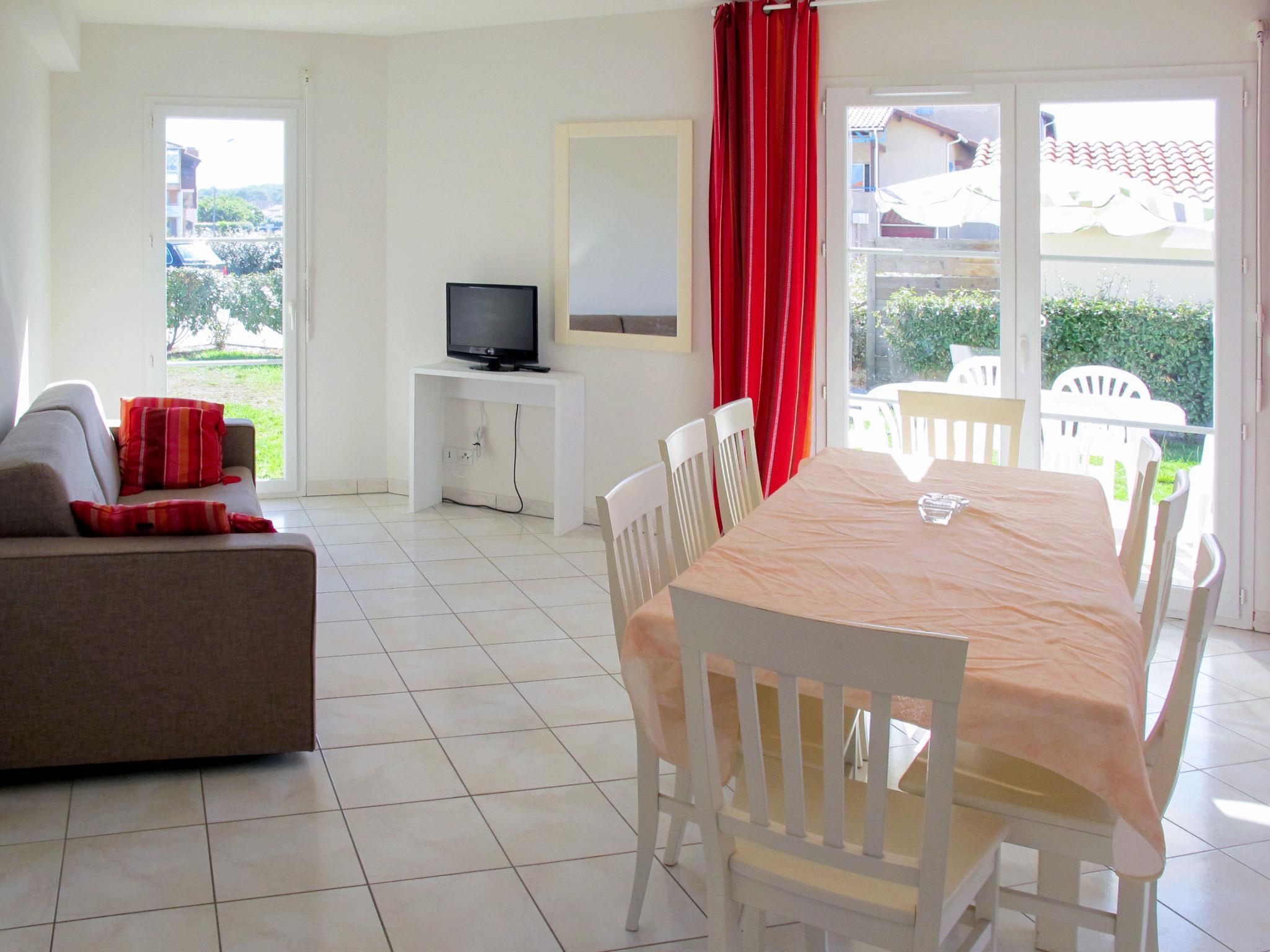 "Résidence Indigo II", 5-room house 90 m2 on 2 levels. Bright, practical and cosy furnishings: living/dining room with dining table and TV (flat screen). Exit to the terrace. 1 room with 1 french bed (140 cm, length 190 cm). Exit to the garden. Kitchenette (dishwasher, 4 ceramic glass hob hotplates, toaster, kettle, microwave, freezer, electric coffee machine). Shower/WC. Upper floor: 1 room with 1 french bed (140 cm, length 190 cm). 1 room with 2 beds (90 cm, length 190 cm). Exit to the balcony. 1 room with 2 beds (90 cm, length 190 cm). Bathroom, sep. WC. Electric heating. Balcony, terrace partly roofed. Terrace furniture. Facilities: washing machine, iron, children's high chair, baby cot (extra). Internet (WiFi, free). Please note: maximum 1 pet/ dog allowed. Smoke alarm.