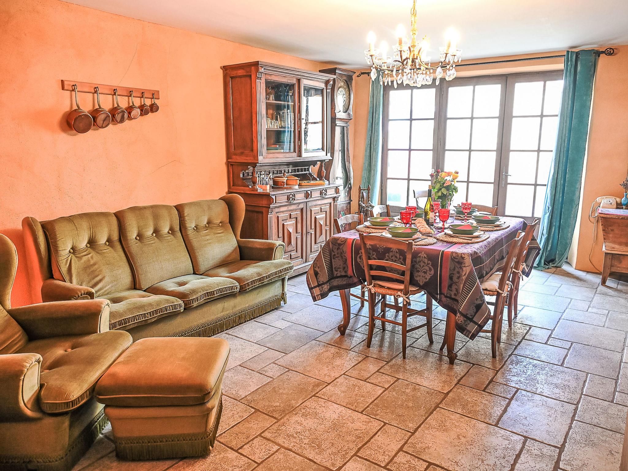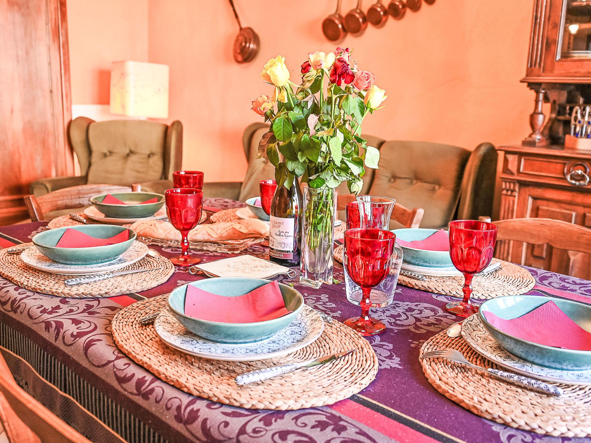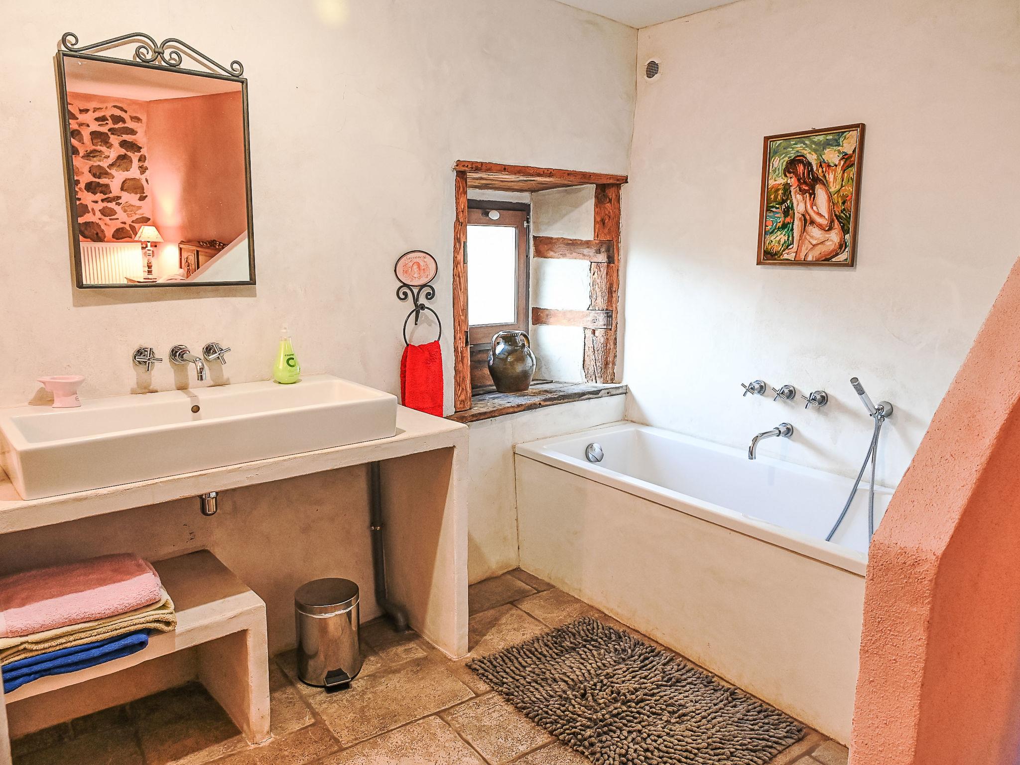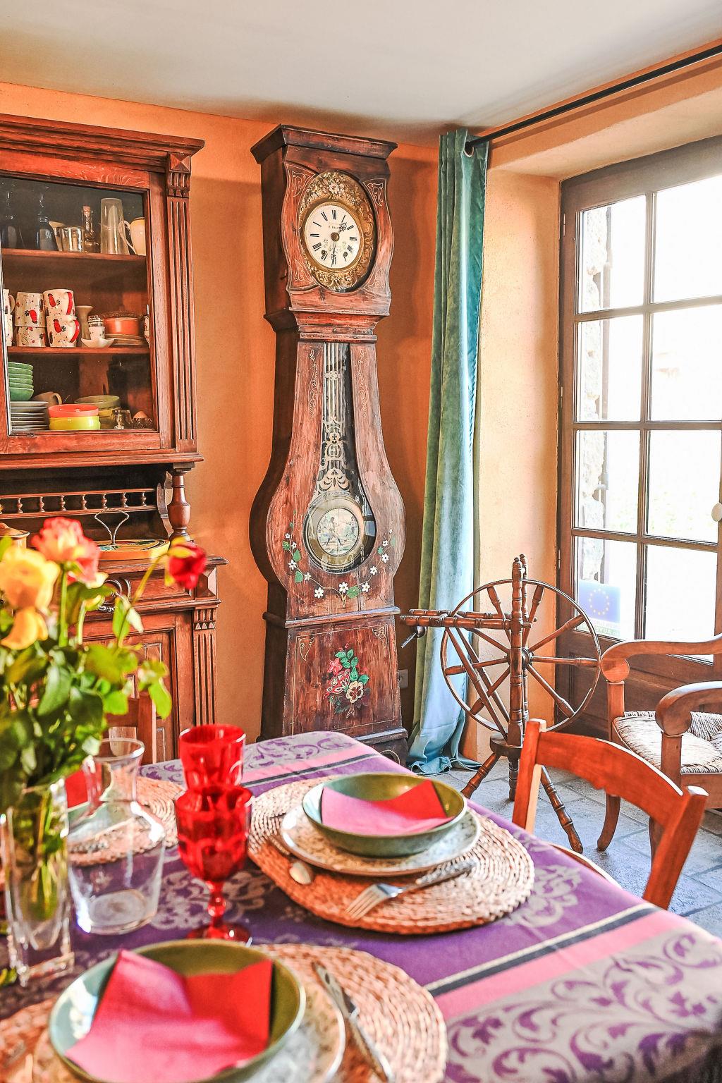 "Varenne", 4-room house 120 m2 on 2 levels. Tasteful and cosy furnishings: 1 room with 1 bed (120 cm, length 190 cm), 1 french bed (140 cm, length 190 cm), bathroom and double hand-basin. Dining room with dining table. Exit to the terrace. Open kitchen (5 hot plates, oven, dishwasher, toaster, kettle, microwave, freezer, electric coffee machine). Sep. WC. Upper floor: living room with TV, hi-fi system and DVD. Exit to the balcony. 1 room with Dressing room with 1 bed (120 cm, length 190 cm), 1 french bed (140 cm, length 190 cm). Shower/WC, double hand-basin. Solar energy heating, oil heating. Natural stone floors. Facilities: washing machine, iron, children's high chair. Internet (WiFi, free). Please note: non-smoking house. Maximum 2 pets/ dogs allowed. Smoke alarm.