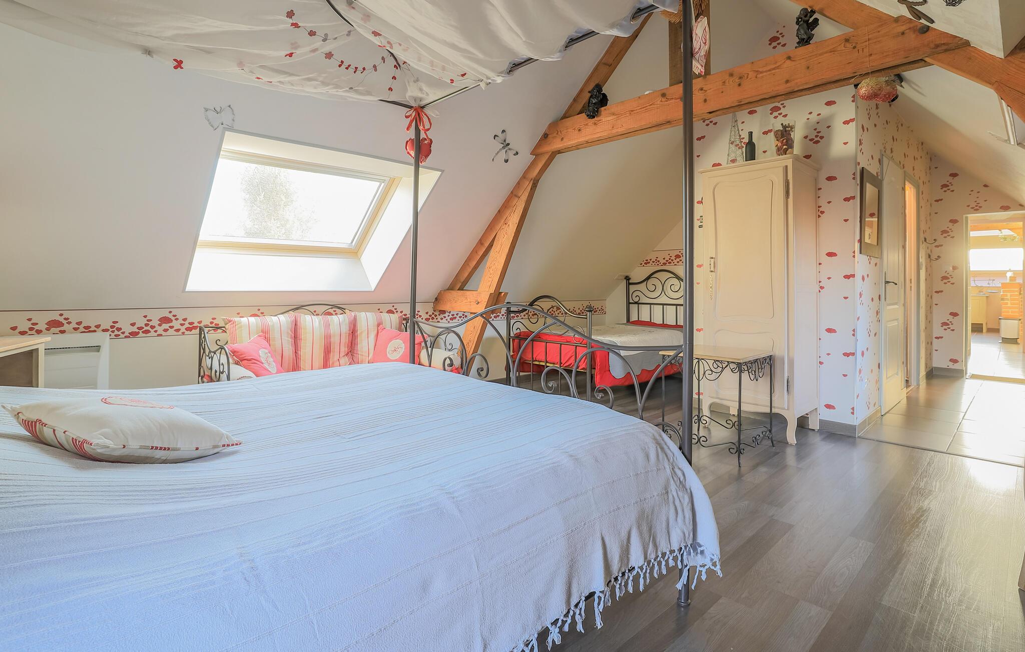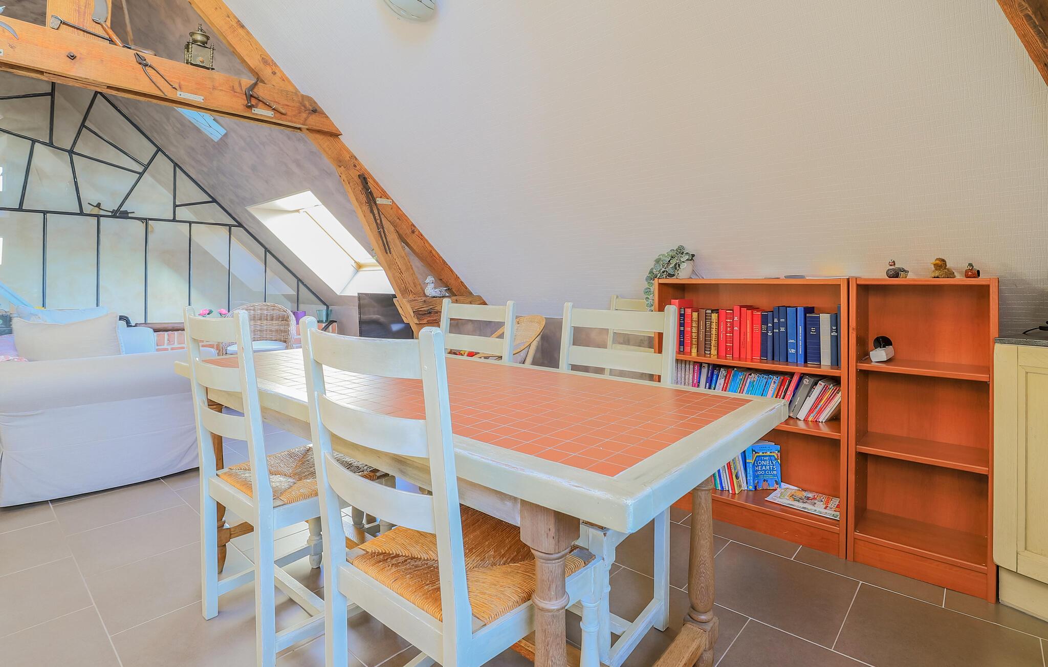Dette indbydende feriehus er en del af en nænsomt renoveret gård og er noget særligt med en hyggelig, original indretning. Tilbered jeres yndlingsmåltider i det åbne køkken og tag plads ved det store spisebord under de charmerende træbjælker. Tilbring afslappende aftener i det hyggelige sofaområde og organiser selskabelige spilleaftener med familien.