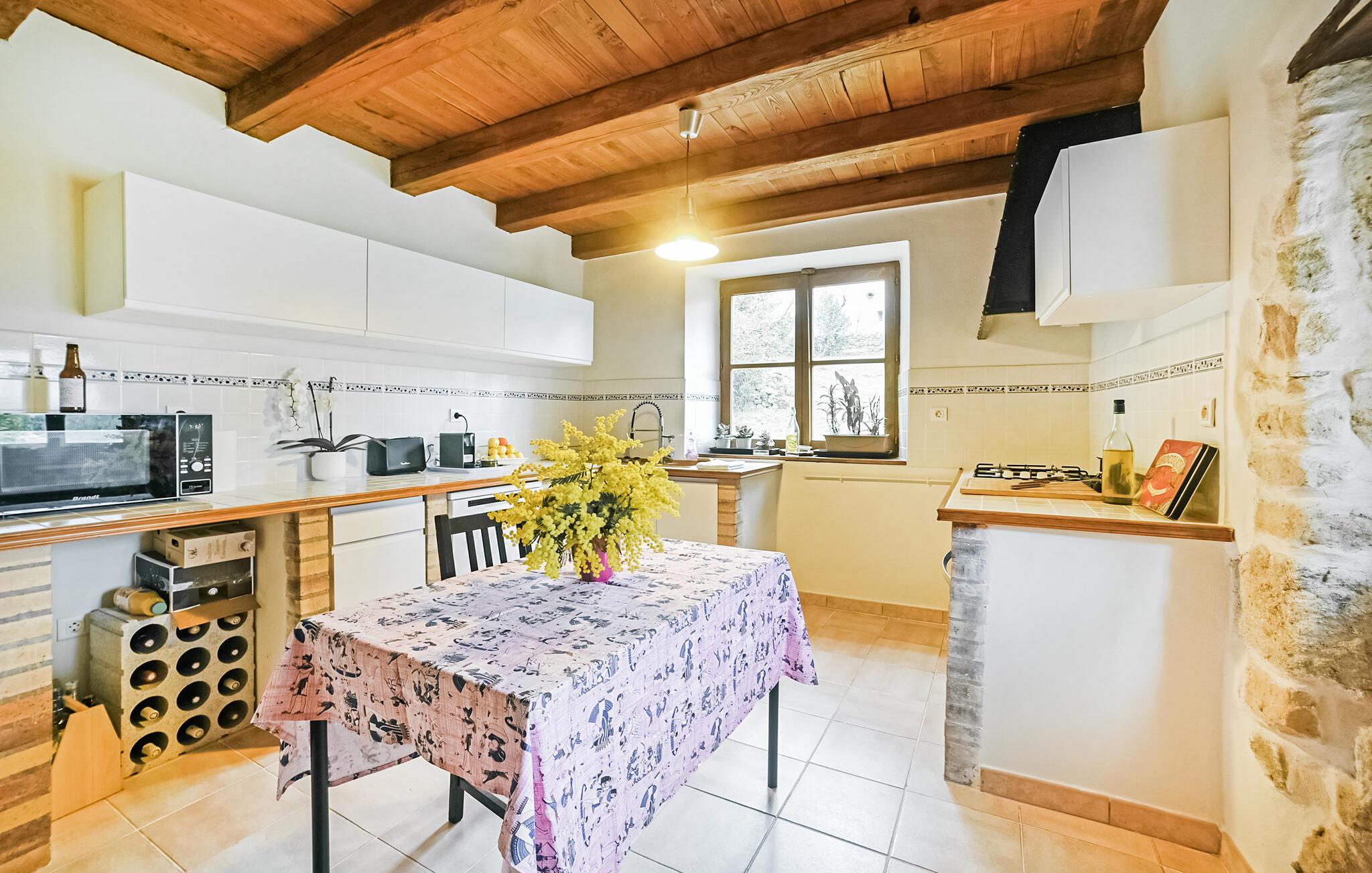 Velkommen til dette attraktive feriehus, der ligger i absolut skønne omgivelser, og hvor I får de bedste rammer for en fantastisk ferie med familien. Huset er ganske rummeligt, og indretningen fremtræder rustikt og hyggeligt med fine træmøbler, tunge trælofter og delvist fritlagte murværk, der skaber en særlig atmosfære, hvor skuldrene ikke kan undgå at sænke sig med det samme, I ankommer. Efter en begivenhedsrig feriedag kan I dække op til en lækker aftensmad ved spisebordet, hive brætspillene frem og hygge jer til langt ud på aftenen.