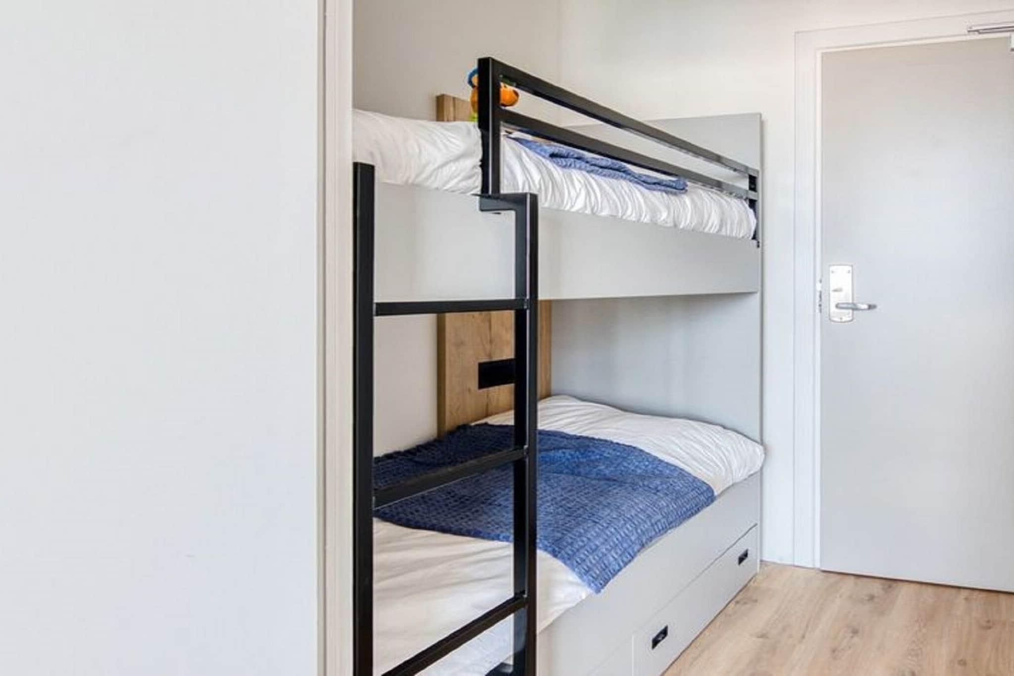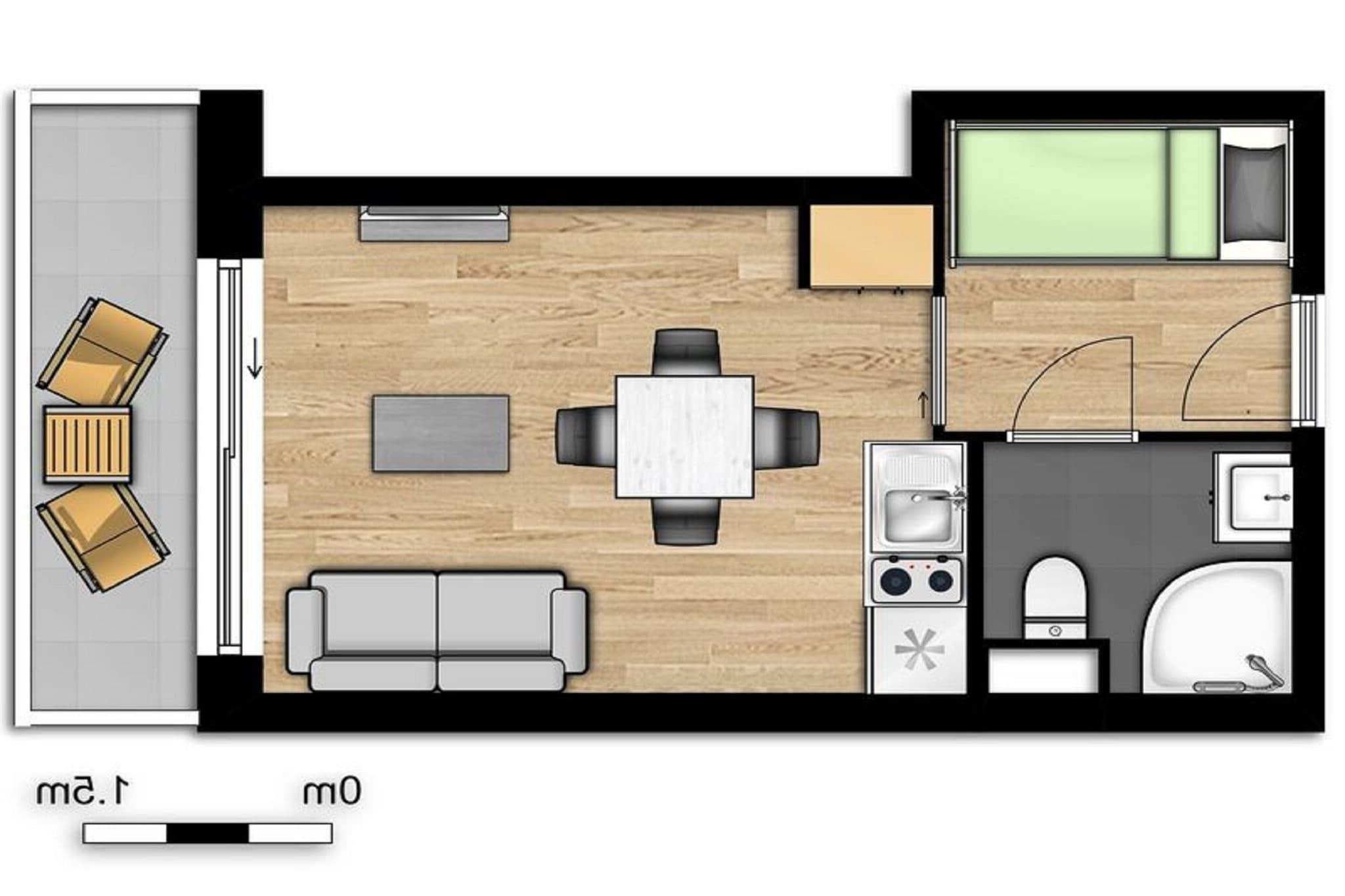 Stue(Fjernsyn), åbent køkken(combi-mikroovn, opvaskemaskine , køle-fryseskab), soveværelse(dobbeltseng eller 2 enkeltsenge Senge), soveværelse(køjeseng), badeværelse(bruser, håndvask), toilet, balkon, havemøbler
