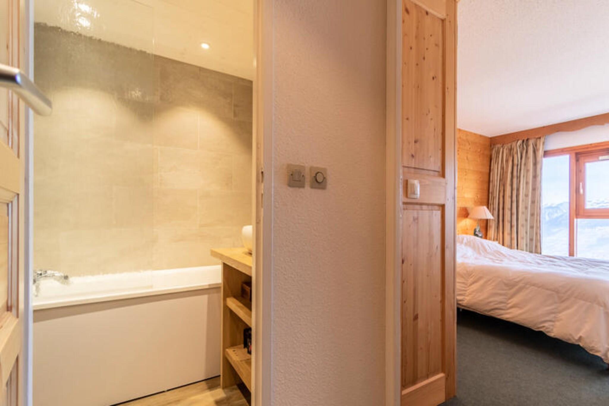 Denne charmerende 4-værelses duplex lejlighed i hjertet af Les Arcs 1800 tilbyder et behageligt ophold for op til 8 personer. Lejligheden indeholder en stue med en 140 cm sovesofa til 2 personer, et soveværelse med 2 enkeltsenge, et andet soveværelse med en dobbeltseng og en kahyt med et sæt 80 cm køjesenge (den høje seng er ikke egnet til børn under 6). Lejligheden er røgfri, kæledyrsfri og har tv med dvd/usb. Sengetøj og håndklæder er til rådighed mod et tillægsgebyr, og lejligheden er udstyret med varme. Der kræves et depositum på 700 euro. Lejligheden ligger i landsbyen Charmettoger, kun 3 minutters gang fra Transarc-skiliften, som giver nem adgang til pisterne. Et bageri, en købmand og en restaurant er bekvemt placeret ved foden af ??boligen. Det nærmeste supermarked og ESF ligger kun 7 minutters gang væk, og turistkontoret og lægekontoret ligger inden for 20 minutters gang eller shuttle-tur. For dem, der ønsker at udforske, er der et busstoppested 20 meter væk, som kører hvert 20. minut om vinteren og hver time om sommeren. Det fuldt udstyrede køkken er åbent til stuen og byder på induktionskogeplader, en ovn, en mikrobølgeovn, en opvaskemaskine, et køleskab med fryser, en kaffemaskine, en kedel og en brødrister. Lejligheden har desuden brusebad og separat toilet samt badeværelse med badekar og toilet ovenpå. Gæsterne kan nyde en stor vestvendt altan med en dejlig udsigt over dalen og Mont Blanc.