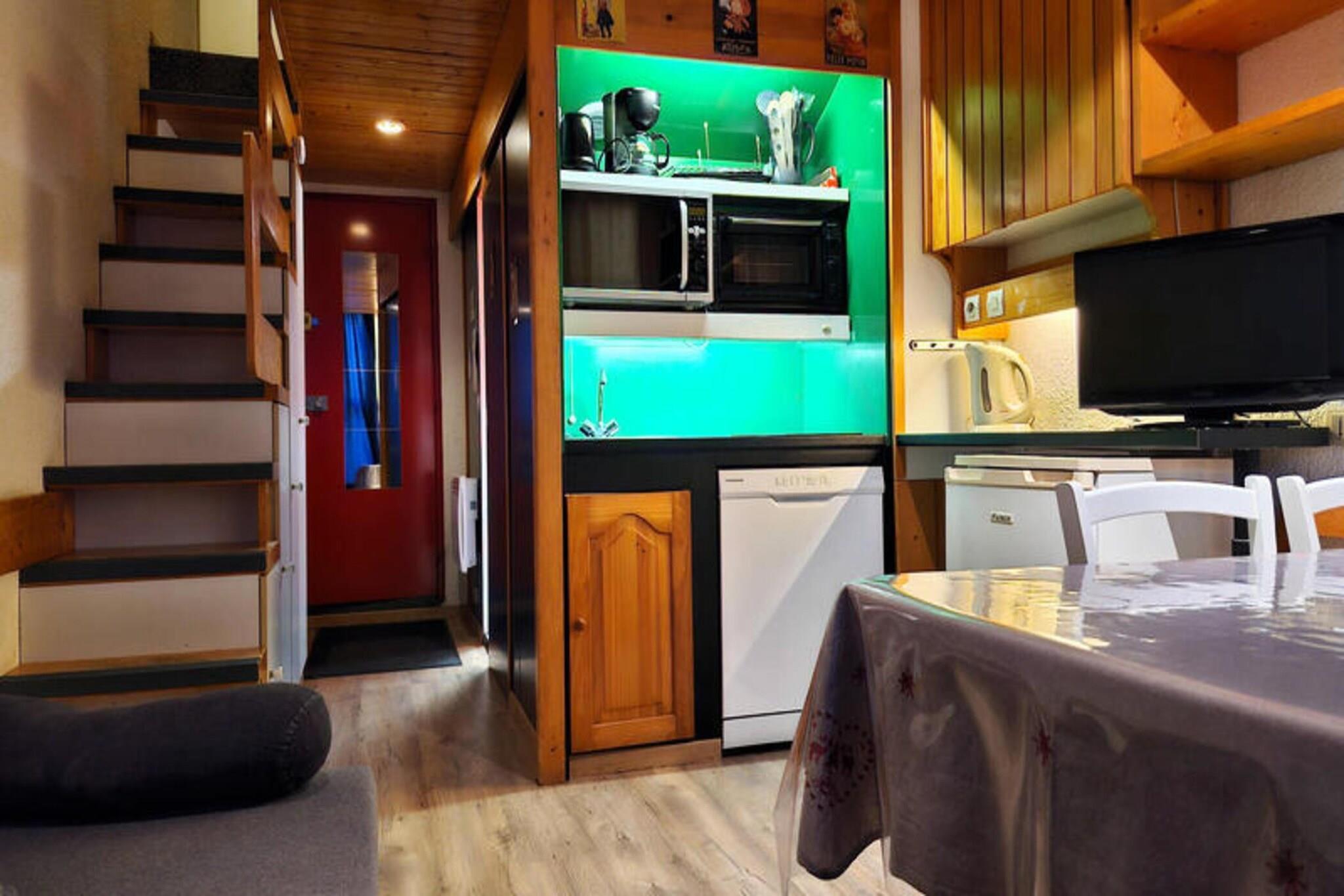 Denne hyggelige 2-værelses duplex lejlighed i Aiguille Grive 1 boligen kan komfortabelt rumme op til 5 gæster, hvilket gør den perfekt til små familier eller grupper. Beliggende på 5. sal med en nordøstvendt balkon, lejligheden har et mezzanin-soveværelse med en dobbeltseng (140x190 cm) og et ekstra soveområde med en enkeltseng (80x190 cm) og en udtrækssovesofa (120x190 cm) . Det er også kæledyrsvenligt, så du kan medbringe dine lodne ledsagere mod et ekstra gebyr. Lejligheden er udstyret med alle de nødvendige faciliteter, herunder et fjernsyn i stuen, gratis Wi-Fi og en babyseng efter anmodning. Beliggende ved foden af ??"Charmettoger"-bakken og kun 3 minutters gang fra Transarc-skiliften, er denne lejlighed perfekt for skielskere. En gratis shuttleservice stopper i nærheden hvert 20. minut, som giver adgang til resortet. Et bageri, en købmand og en restaurant ligger få skridt væk, med et supermarked og ESF-skiskole 7 minutters gang derfra. Læge- og turistkontorerne er 20 minutter til fods eller med shuttle. Lejligheden har et fuldt udstyret køkken med elektriske kogeplader, ovn, køleskab, opvaskemaskine, brødrister, kedel og kaffemaskine. Badeværelset har badekar og toilet. Yderligere faciliteter omfatter varme, tv og en babyseng. Sengetøj og håndklæder er tilgængelige mod et ekstra gebyr, og der kræves et depositum ved indtjekning. Ideel til både vinter- og sommerophold..