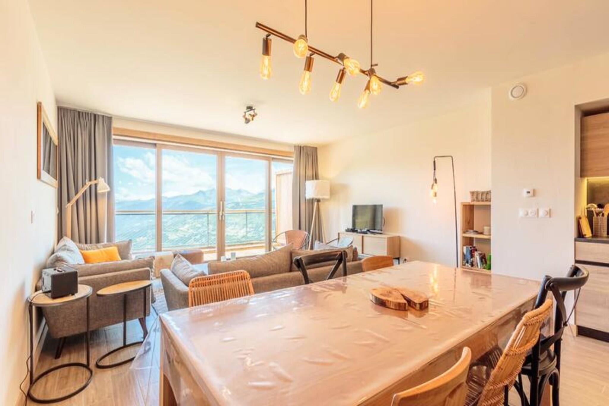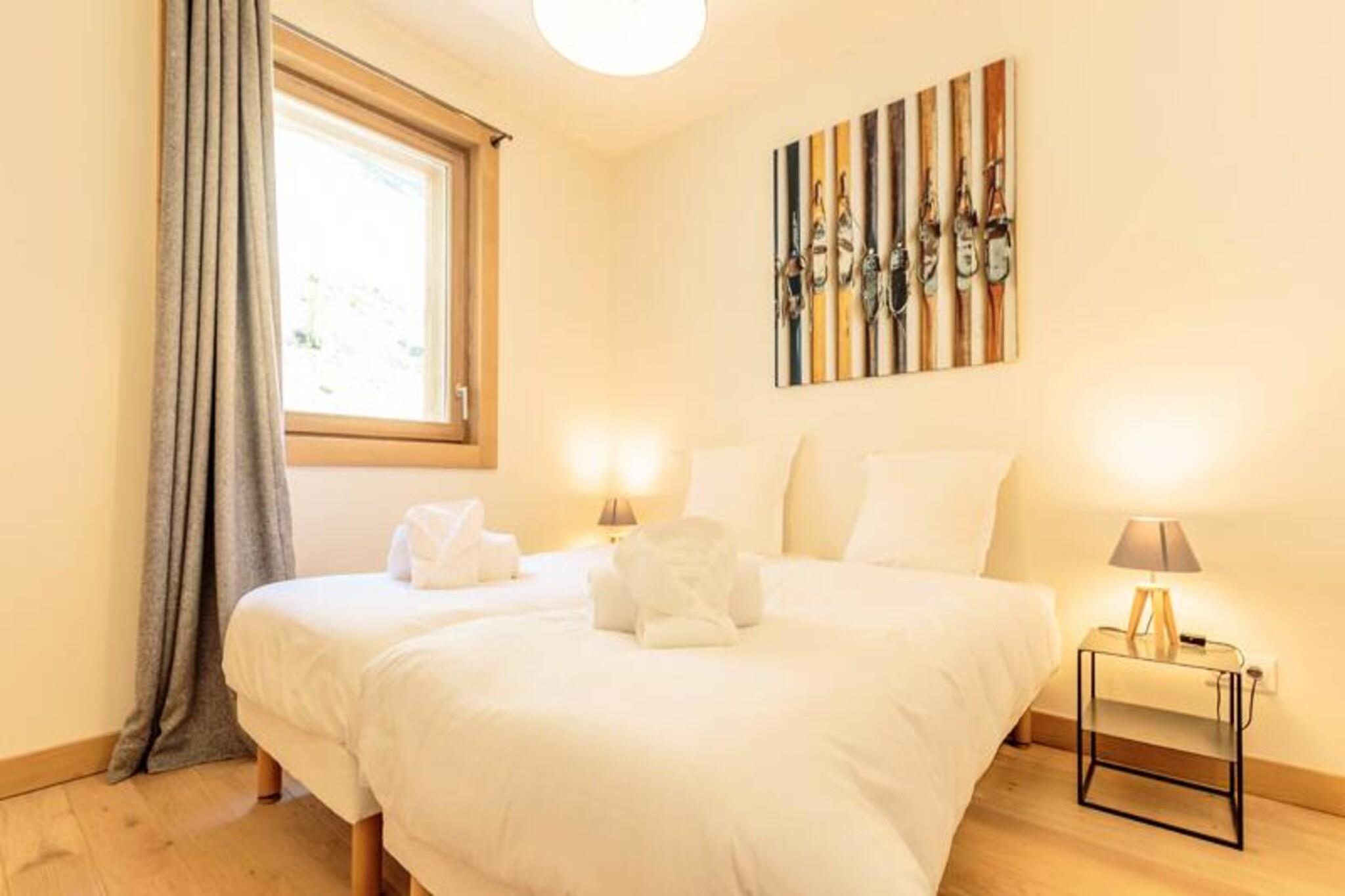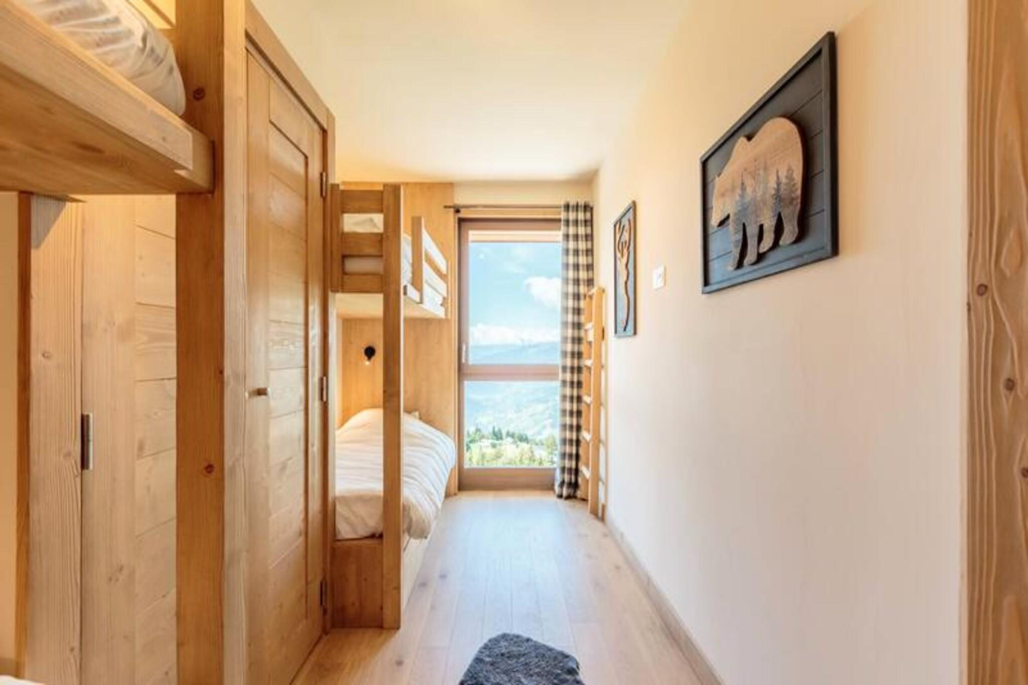 Denne luksuriøse duplex-lejlighed, beliggende ved foden af ??pisterne, rummer komfortabelt 8 til 10 gæster med tre soveværelser og et hyggeligt bjerghjørne. Lejligheden har høj finish og hyggelig, moderne indretning. Sovearrangementerne omfatter et hovedsoveværelse med en dobbeltseng, et værelse med to enkeltsenge (som kan laves om til en dobbeltseng), og et værelse med to sæt køjesenge og en udtræksseng. Lejligheden er ikke-ryger, og kæledyr er ikke tilladt. Det tilbyder to overdækkede parkeringspladser (med en maksimal højde på 2,05m) og direkte adgang til skiløjperne med et skiskab. Beliggende i hjertet af Les Arcs 1600, tilbyder boligen nem adgang til pisterne, med direkte adgang til ski-in og ski-out lige fra døren. Ejendommen ligger 1730 meter over havets overflade og tilbyder panoramaudsigt over Tarentaise-dalen og enestående solnedgange. I nærheden finder du Cachette-bakken sammen med caféer, markeder og en ny French Touch-koncept købmandsbutik, der tilbyder catering og takeaway-måltider. Derudover ligger feriestedet Arcs 1600 tæt på, med gratis transport mellem stationen og en kabelbane, der forbinder dig til Bourg Saint Maurice station. Inde i lejligheden finder du et fuldt udstyret køkken, en rummelig stue med et tilsluttet tv og en terrasse og flere badeværelser med moderne bekvemmeligheder. Wellness-området har en indendørs swimmingpool, sauna, hammam og fitnesscenter, hvilket sikrer afslapning efter en dag på pisterne. Andre tjenester omfatter et skirum med støvle- og handsketørrere, concierge-service og rengøring.
