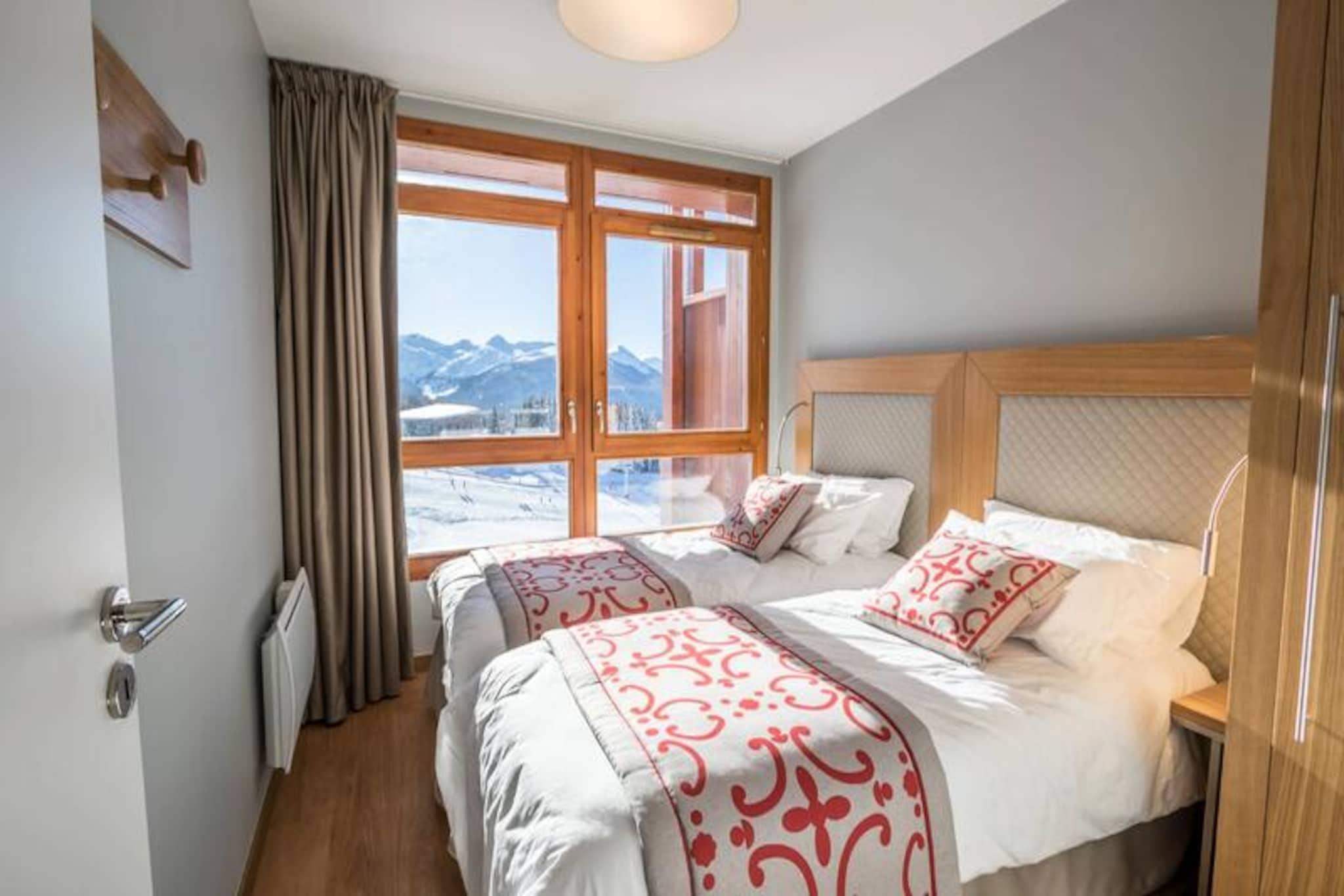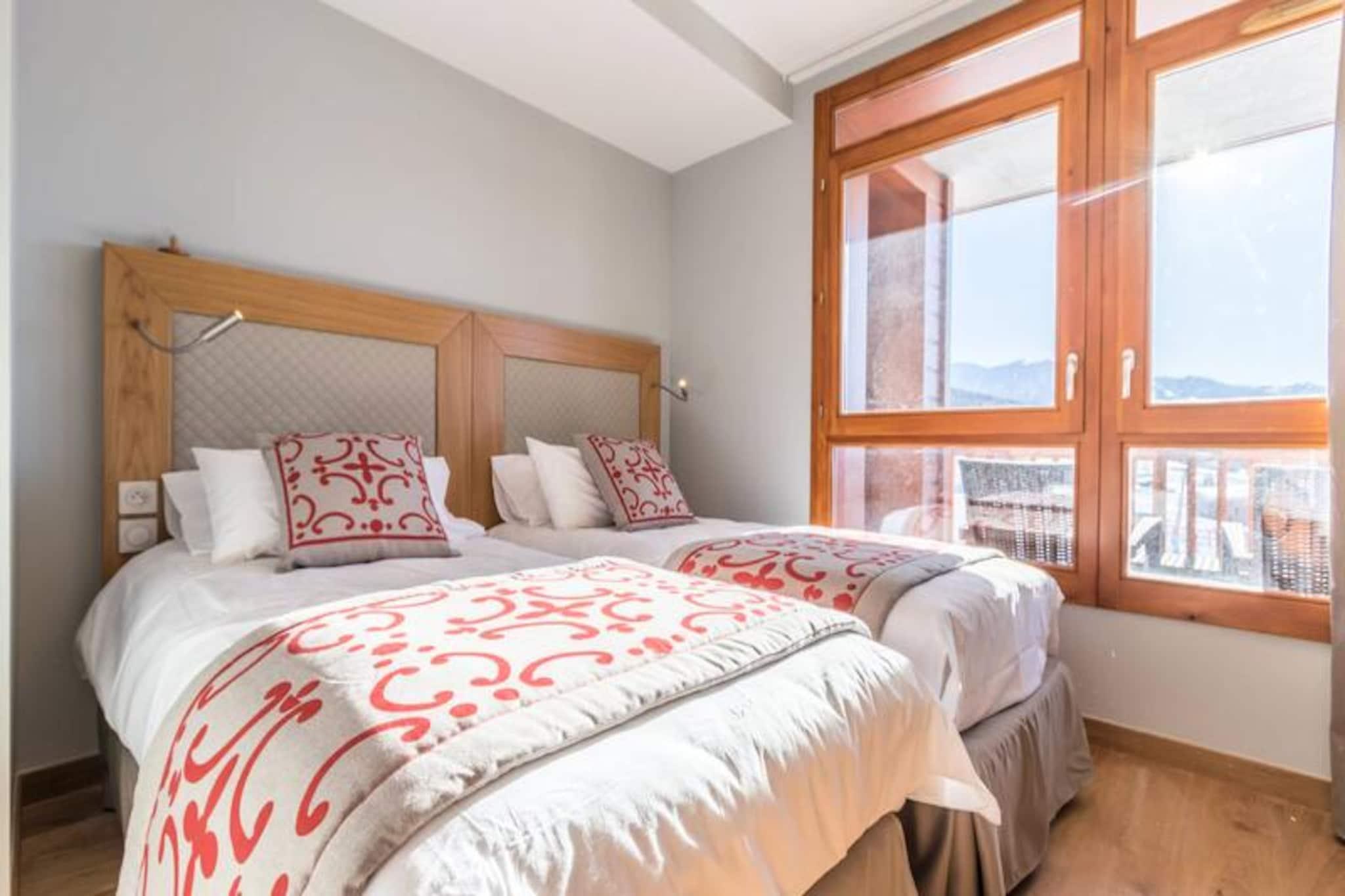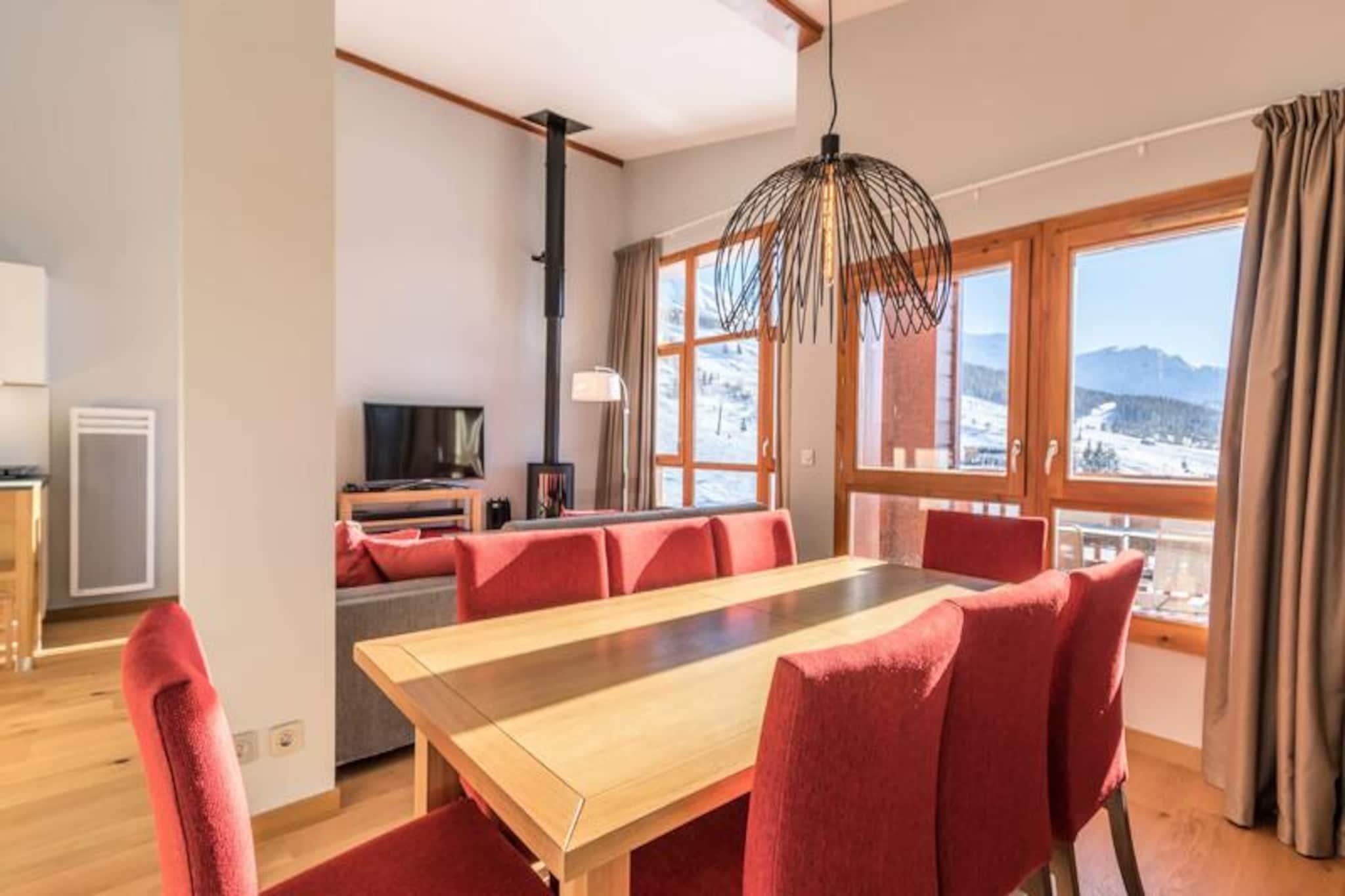 Højt over den maleriske Tarentaise-dal tilbyder denne luksuriøse duplexlejlighed i den prestigefyldte Les Monarques-residens et uovertruffent alpint tilflugtssted. Med en betagende udsigt mod sydvest og direkte adgang til skiområdet Paradiski kombinerer denne 107 m² store ejendom moderne elegance med charmen ved bjerglivet. Uanset om du er her for vintersport eller sommervandreture, lover den rolige atmosfære og de førsteklasses faciliteter et uforglemmeligt ophold. Forestil dig at slappe af i spaen eller tage en forfriskende dukkert i poolen efter en dag med eventyr, omgivet af de majestætiske tinder i de franske alper. \n\nLejligheden har komfortabel plads til op til otte gæster fordelt på fire soveværelser, inklusive en master suite med eget badeværelse. Den åbne opholdsstue har en hyggelig pejs, et fuldt udstyret køkken og en stilfuld lounge, der er perfekt til afslappende aftener. Yderligere bekvemmeligheder såsom Wi-Fi, et Bose Hi-Fi-system og en overdækket parkeringsplads sikrer en problemfri oplevelse. Den gennemtænkte inkludering af håndklæder, opredte senge ved ankomst og slutrengøring tilføjer et strejf af hotellignende service til din ferie. \n\nBeliggende i det eksklusive Edenarc au Chantel-område kan denne residens prale af ski-in/ski-out om vinteren og nærhed til en golfbane om sommeren. I nærheden finder du Nama Springs Spa, gourmet-købmandsforretninger og Dahu-svævebanen, som forbinder dig til det pulserende Arc 1800-resortcenter på få minutter. En gratis shuttle-service sikrer nem udforskning af de omkringliggende landsbyer og attraktioner. \n\nUanset om du søger spændende pister, rolige vandrestier eller blot et øjebliks afslapning i spaen, er denne førsteklasses residens din indgang til det bedste af Les Arcs. Omfavn bjergenes magi og skab minder, der vil vare hele livet.