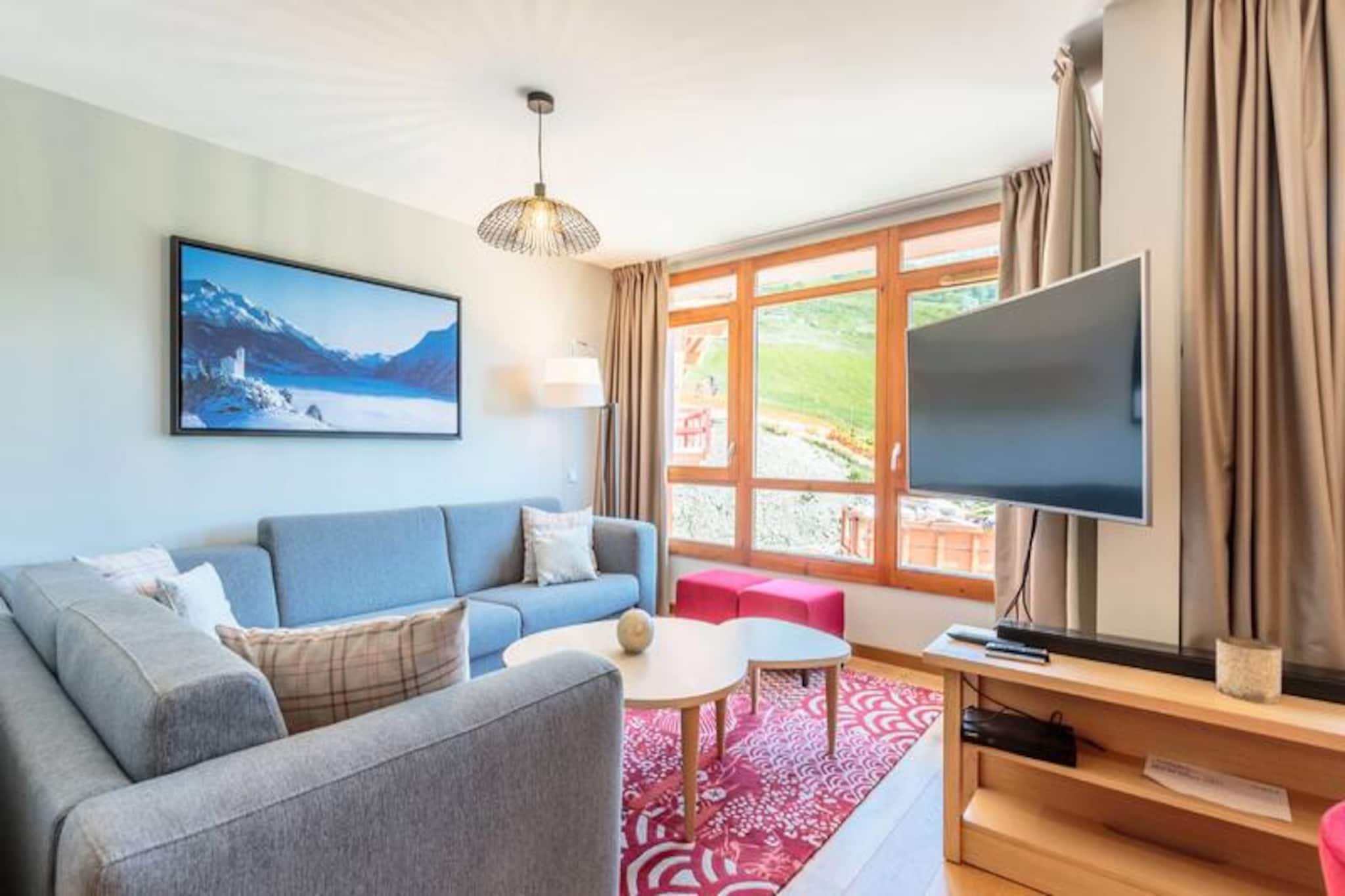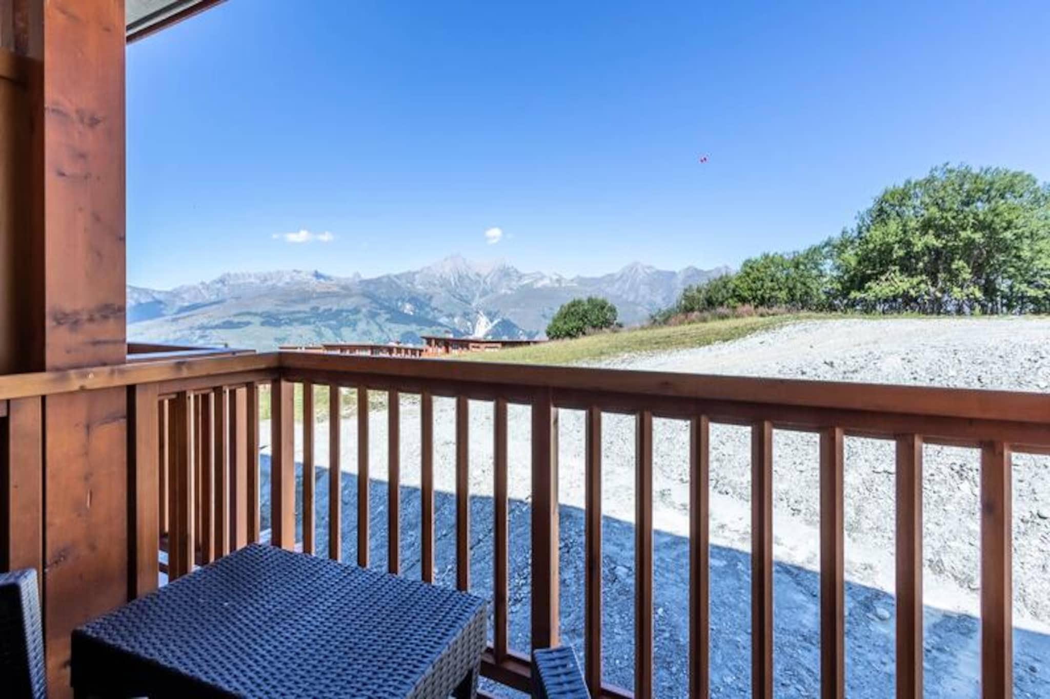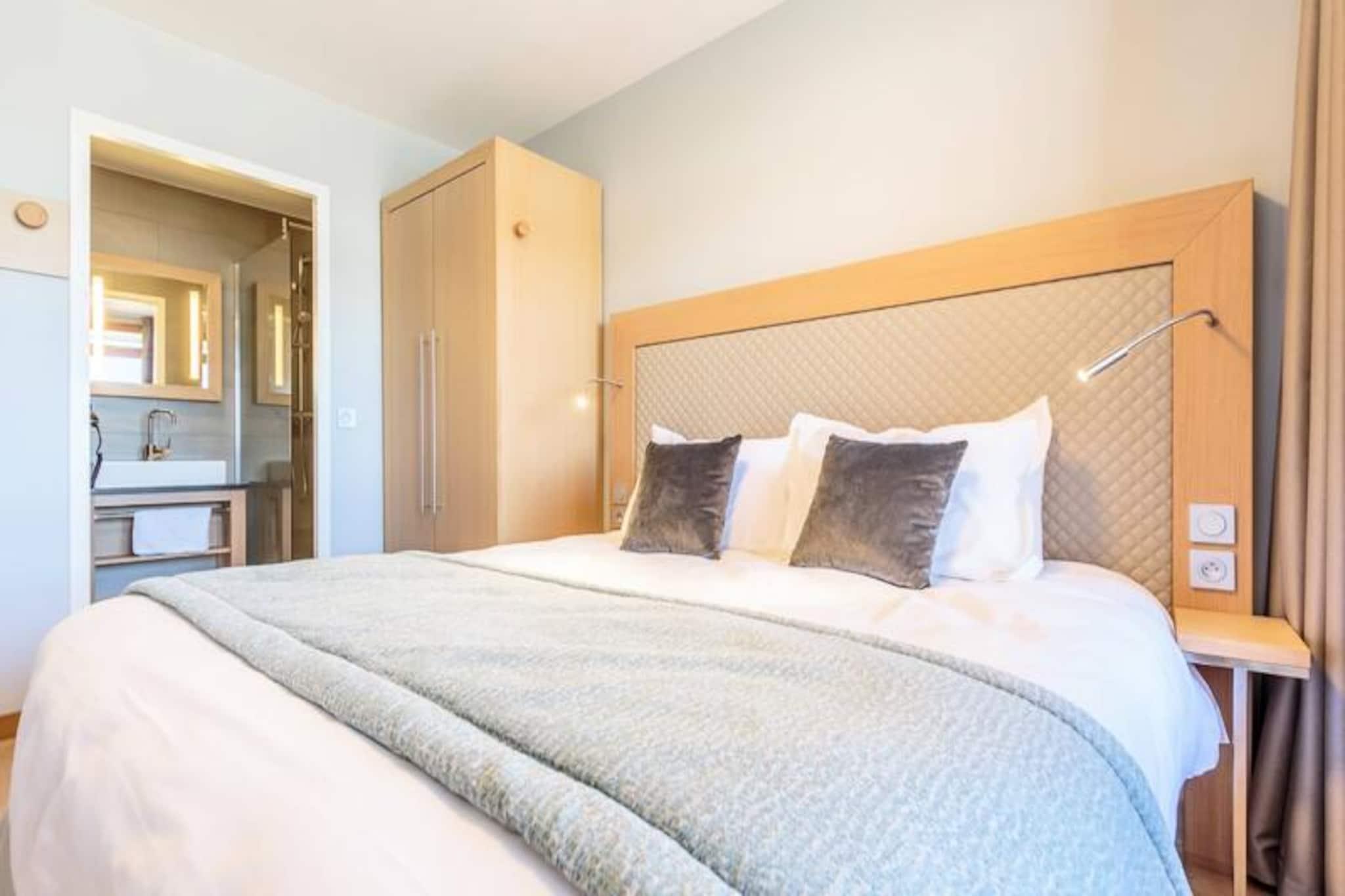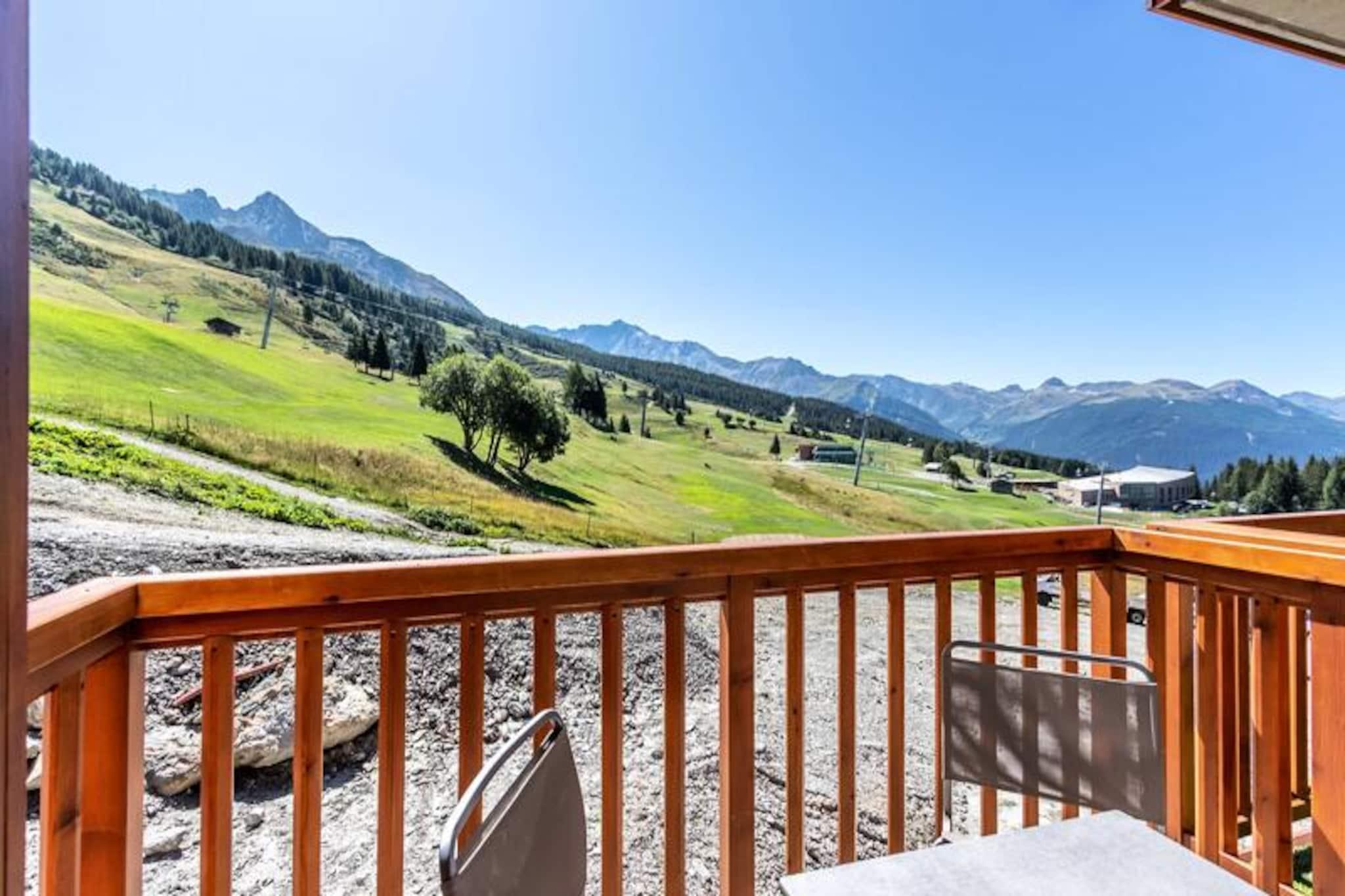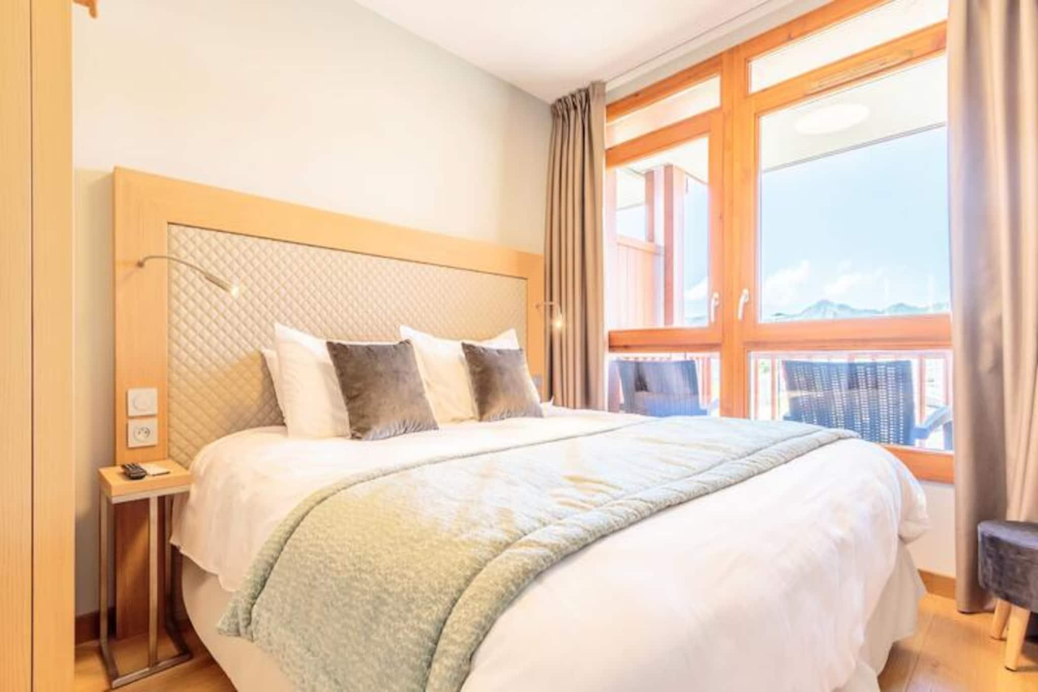 Beliggende i de fredfyldte højder af Arc 1800, tilbyder denne luksuriøse 4-værelses lejlighed i den prestigefyldte residens Les Monarques et uovertruffent alpint tilflugtssted. Med en betagende udsigt over Tarentaise-dalen og direkte ski-in/ski-out adgang, er det den perfekte base for at udforske det verdensberømte Paradiski-område. Uanset om du er her for vinterens pudrede pister eller sommerens frodige golfbaner, tilbyder denne ejendom en problemfri blanding af komfort og eventyr. \n\nLejligheden strækker sig over 86 kvadratmeter og har plads til op til syv gæster med tre elegant designede soveværelser, herunder en master suite med eget bad og toilet. Den åbne opholdsstue har en hyggelig hjørnesofa, fladskærms-tv og en sydvendt balkon, der inviterer dig til at nyde bjergudsigten. Det fuldt udstyrede køkken med Nespresso-maskine, ovn og opvaskemaskine gør det til en fornøjelse at spise derhjemme. Yderligere faciliteter inkluderer højhastigheds-Wi-Fi, et Bose Hi-Fi-system, en vaskemaskine og en tørretumbler, hvilket sikrer et ophold lige så bekvemt som det er luksuriøst. \n\nUd over lejligheden kan du forkæle dig selv med boligens førsteklasses faciliteter, herunder en opvarmet swimmingpool, spa med hammam og sauna samt et fitnessrum. Kun få skridt væk finder du Nama Springs Spa, gourmet-købmandsforretninger og Dahu-svævebanen, som tager dig til feriestedets centrum på få minutter. Om sommeren lokker den nærliggende golfbane og vandrestier, mens vinteren forvandler området til et skiløberparadis med 425 km pister lige uden for døren. \n\nUanset om du søger afslapning eller eventyr, tilbyder denne lejlighed den ultimative bjergflugt, der kombinerer moderne luksus med den tidløse charme i de franske alper.