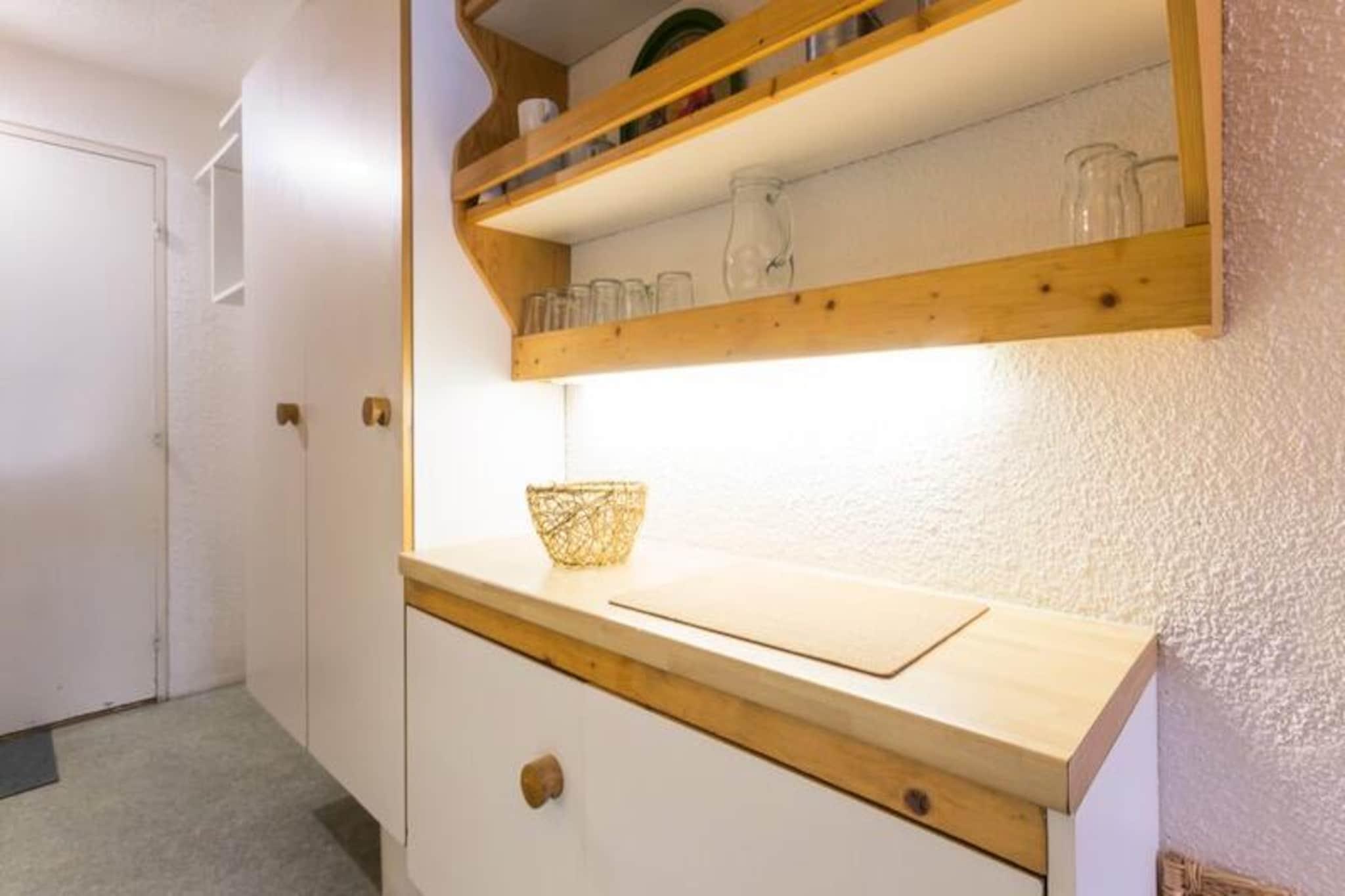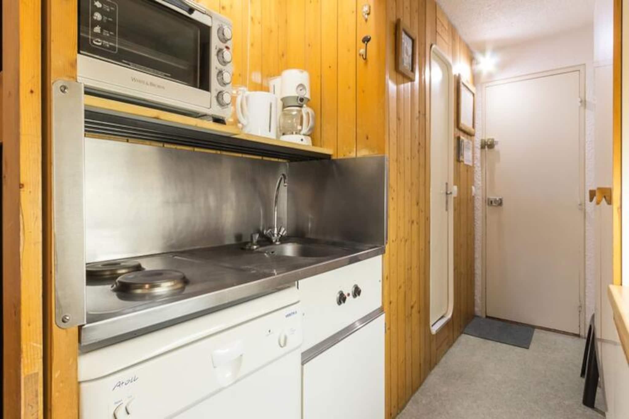 Over det travle Charvet-indkøbscenter tilbyder denne charmerende studiohytte et hyggeligt alpint tilflugtssted i hjertet af Les Arcs 1800. Med sin ski-in/ski-out-bekvemmelighed kan du træde direkte ud på pisterne eller slentre gennem den pulserende landsby fyldt med butikker, restauranter og afterski-oplevelser. Uanset om du er her for en vinterferie eller et sommereventyr, danner den betagende udsigt over Mont Blanc og de omkringliggende fyrretræsklædte bjerge den perfekte baggrund for dit ophold. \n\nDet 24 m² store studio er designet til op til fire gæster og er omhyggeligt indrettet for at maksimere komfort og funktionalitet. Opholdsstuen har en alkove med en sovesofa, der kan adskilles med et skydegardin, samt to enkeltsofaer, hvilket gør den ideel til familier eller små grupper. Et fuldt udstyret tekøkken inkluderer elektriske kogeplader, en miniovn, en opvaskemaskine og essentielle apparater som en kaffemaskine og brødrister, hvilket sikrer, at du har alt, hvad du behøver for at tilberede måltider efter en dag med udforskning. Den sydvestvendte balkon inviterer dig til at slappe af med udsigt over det livlige feriested, mens de nordøstvendte balkoner tilbyder fredfyldte udsigter over bjergene og Mont Blanc.\n\nBekvemmelighed er nøglen med faciliteter såsom elevator, nærliggende overdækket og udendørs parkering (mod gebyr om vinteren) og gratis Wi-Fi i hele feriestedet. Boligen er miljøbevidst og tilbyder valgfrit sengetøj og slutrengøring mod et ekstra gebyr. Med sin uovertrufne beliggenhed over Charvet-shuttlestoppestedet kan du nemt udforske hele Les Arcs-området eller bevæge dig længere ind i Paradiski-området.\n\nUanset om du er tiltrukket af spændingen ved skiløb, tiltrækningen af ??bjergstier eller blot charmen ved en hyggelig alpin ferie, tilbyder denne studiohytte en mindeværdig flugt i hjertet af de franske alper.