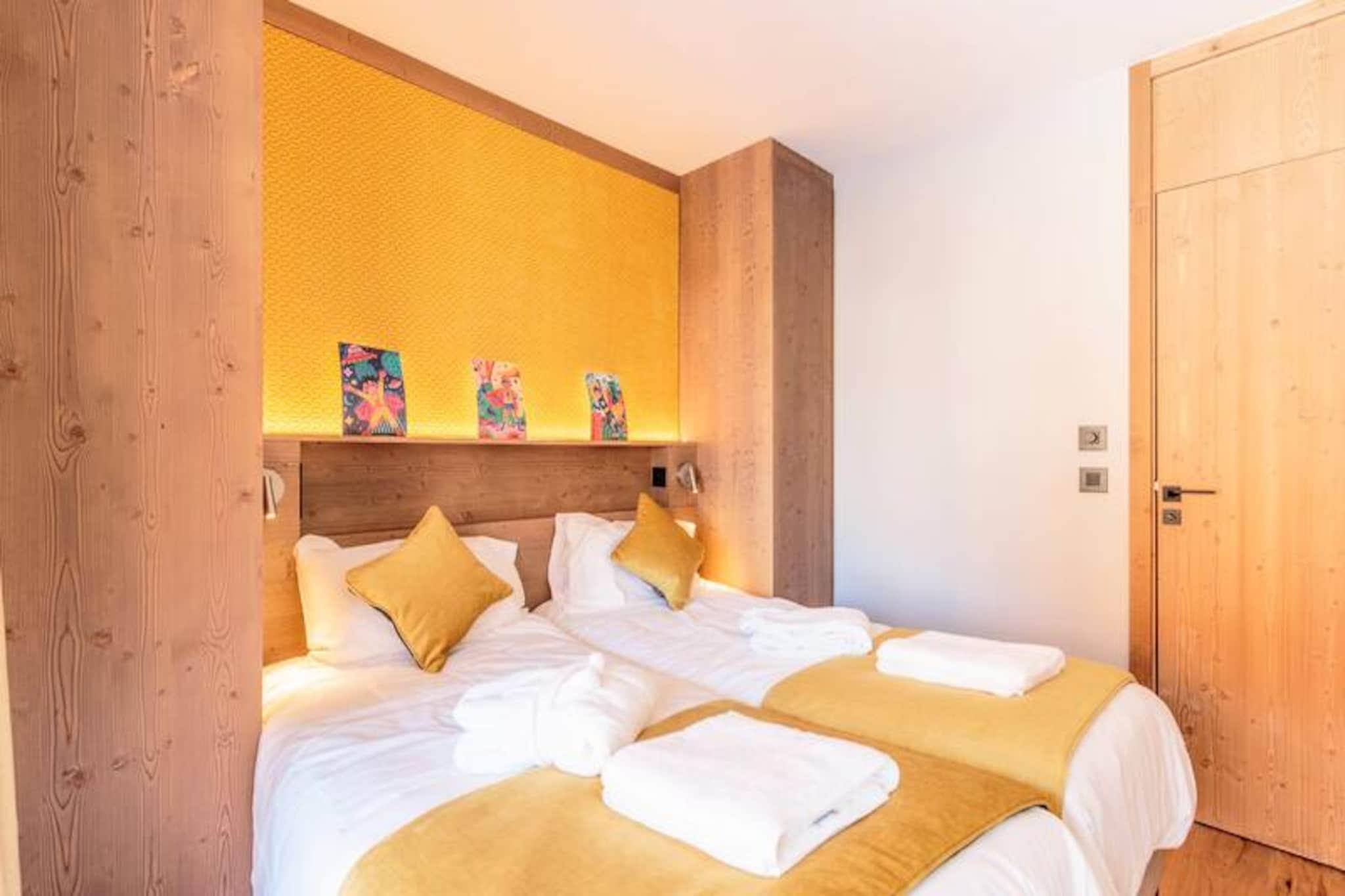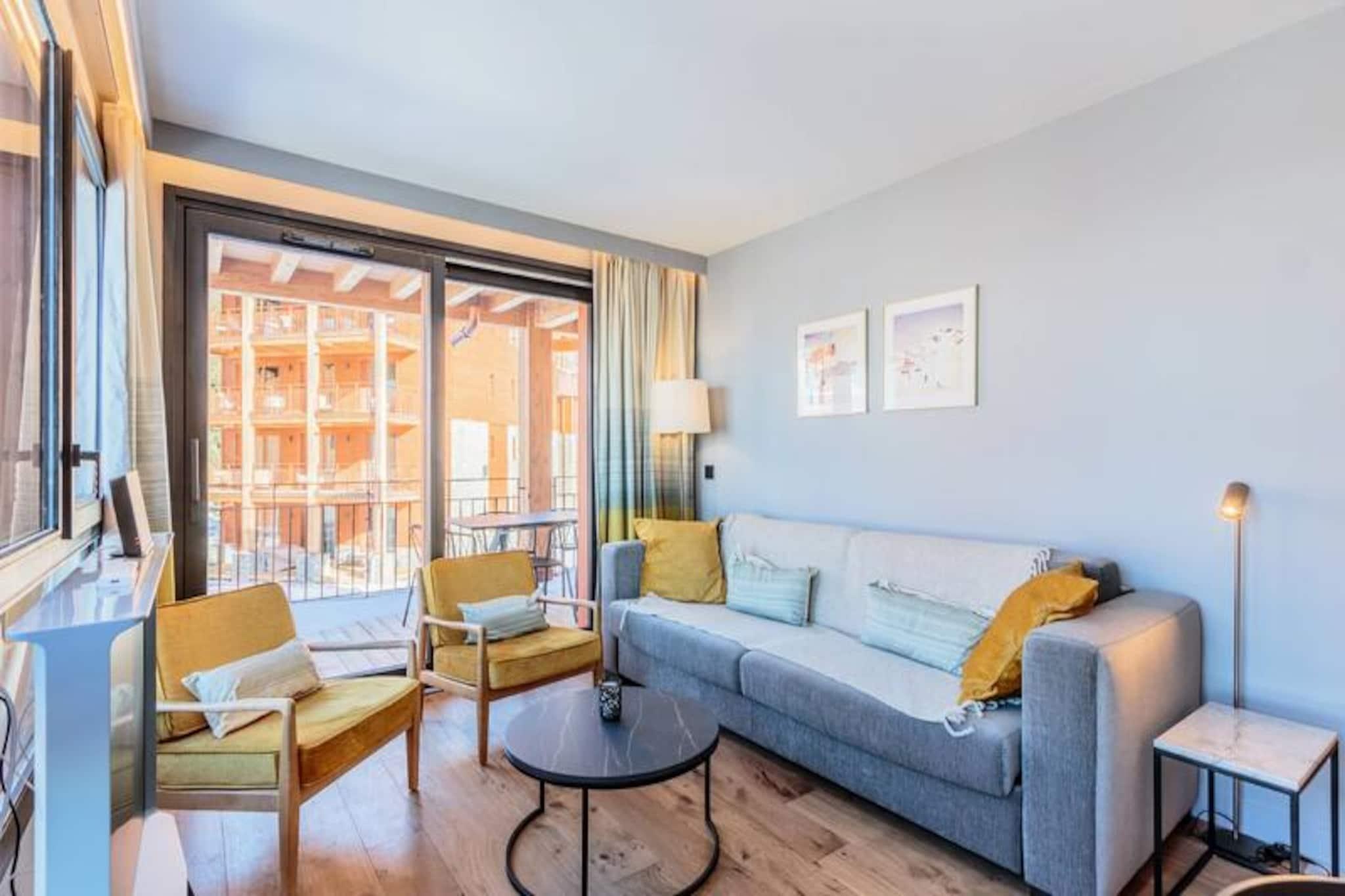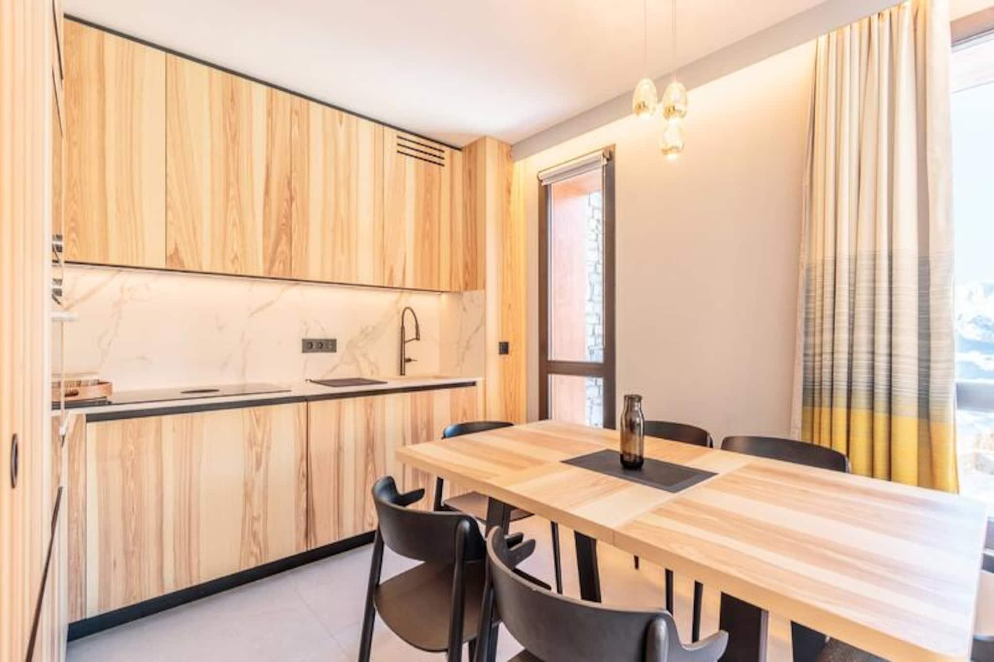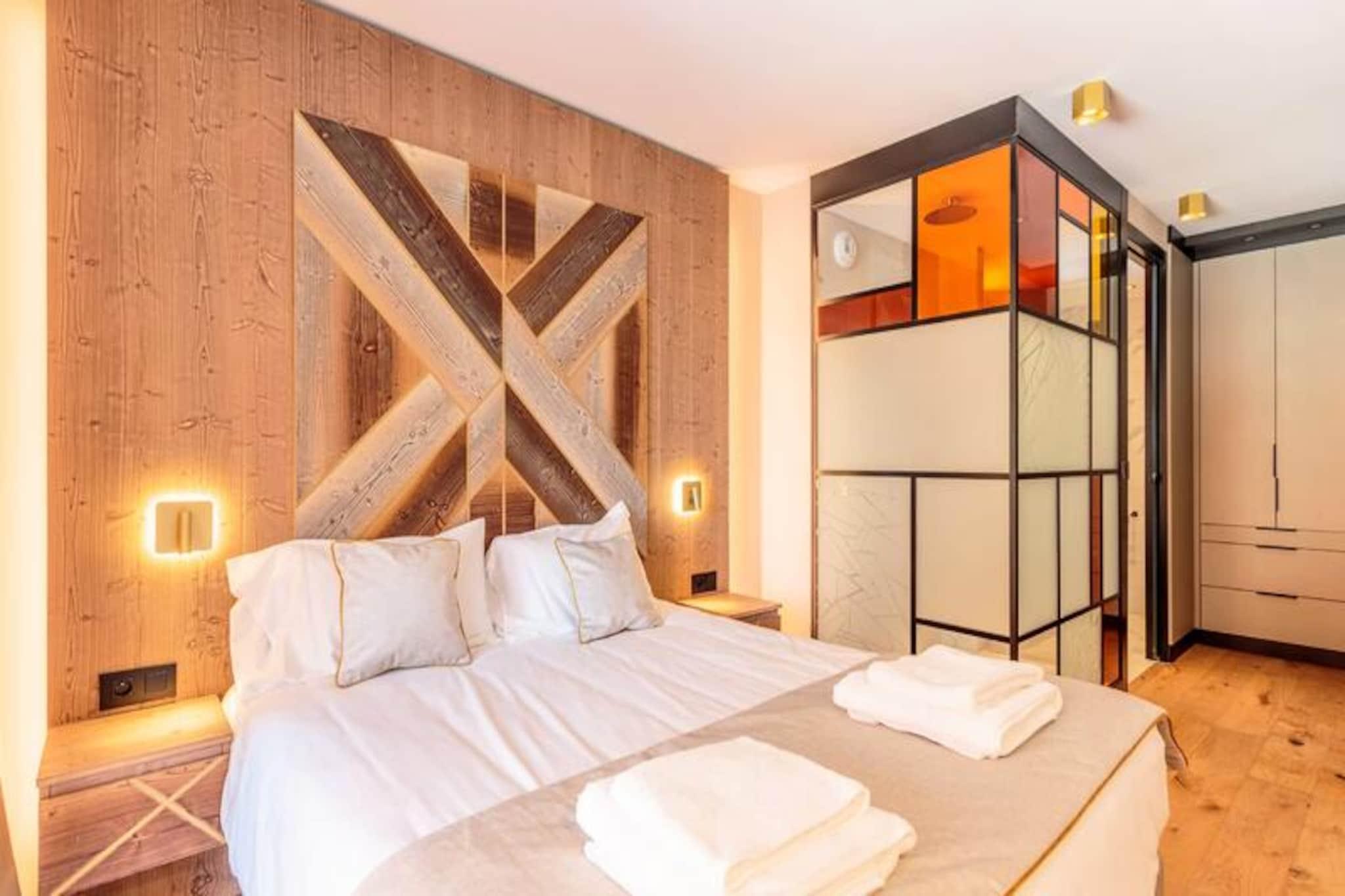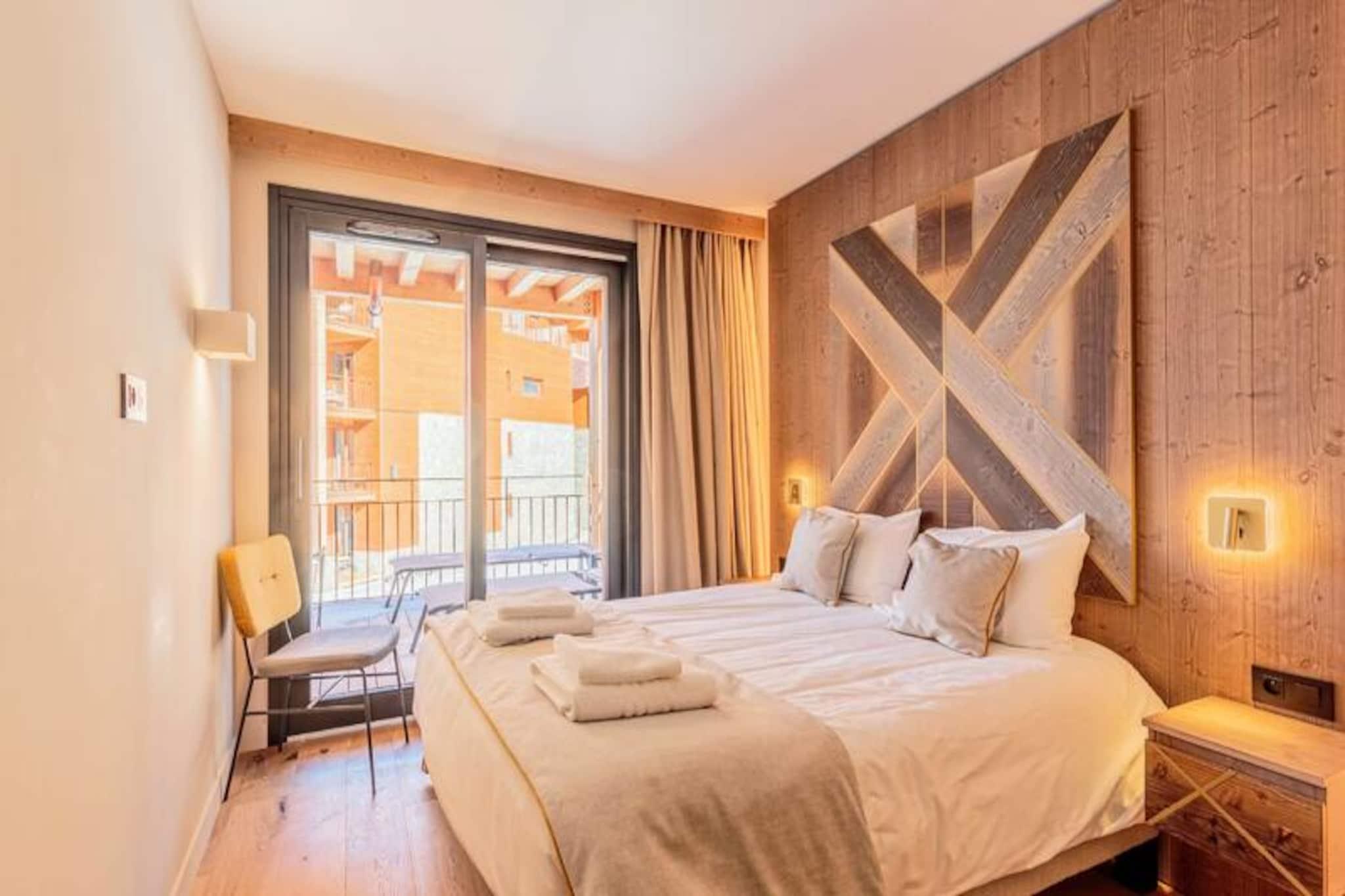 Højt over Tarentaise-dalen tilbyder denne luksuriøse 4-stjernede lejlighed i den helt nye Les Cristaux-residens et uovertruffent alpint tilflugtssted. Med sin elegante, moderne indretning og syd-sydvestlige orientering kan ejendommen prale af en betagende panoramaudsigt over Mont Blanc og de omkringliggende tinder, hvilket gør den til et paradis for både naturelskere og eventyrlystne. Uanset om du besøger den om vinteren for at stå på ski i verdensklasse eller om sommeren for at udforske den legendariske Vanoise Nationalpark, er denne lejlighed den perfekte base for uforglemmelige bjergoplevelser. \n\nLejligheden er på 75 kvadratmeter og har komfortabel plads til op til seks gæster fordelt på tre elegant designede soveværelser. Master-suiten har en dobbeltseng, eget brusebad og direkte adgang til den møblerede terrasse, mens de to andre soveværelser tilbyder fleksible sovearrangementer med dobbeltsenge og enkeltsenge. Det åbne køkken og opholdsstue er udstyret med moderne faciliteter, herunder induktionskogeplade, espressomaskine og en hyggelig lounge med tv. Træd ud på den rummelige terrasse for at nyde din morgenkaffe eller et solnedgangsmåltid, mens du nyder den fantastiske alpine udsigt. Yderligere bekvemmeligheder inkluderer Wi-Fi, et opvarmet skirum, en overdækket parkeringsplads med en elektrisk ladestation og adgang til boligens vaskeri.\n\nLejligheden ligger i det rolige Le Chantel-område i Arc 1800, kun en kort gåtur fra Edenarc-komplekset, hvor du finder Nama Springs Spa, gourmet-købmandsforretninger og Dahu-svævebanen, der forbinder dig til feriestedets centrum på få minutter. Der er også et gratis shuttlebusstoppested i nærheden, hvilket sikrer nem adgang til det pulserende hjerte af Les Arcs med dets restauranter, butikker og afterski-muligheder. Efter en aktiv dag på pisterne eller vandrestierne kan du slappe af i boligens spa med hammam, sauna og jacuzzi for et øjebliks ren afslapning.\n\nUanset om du er her for spændingen ved Paradiskis 425 kilometer pister eller roen i den alpine sommer, lover Les Cristaux et ophold fyldt med komfort, elegance og uforglemmelige minder.