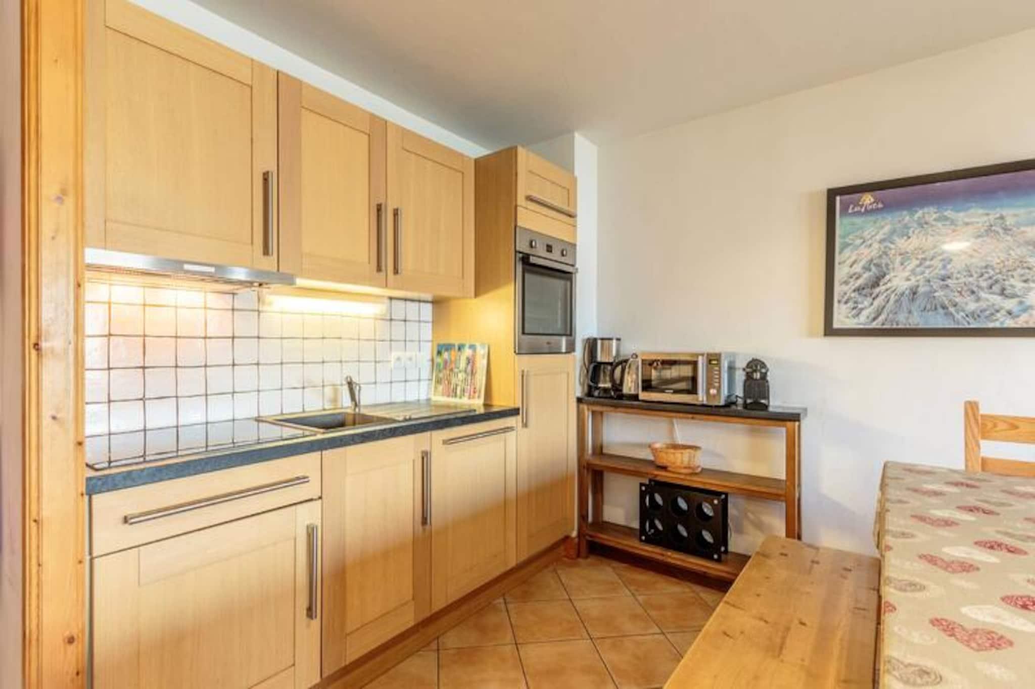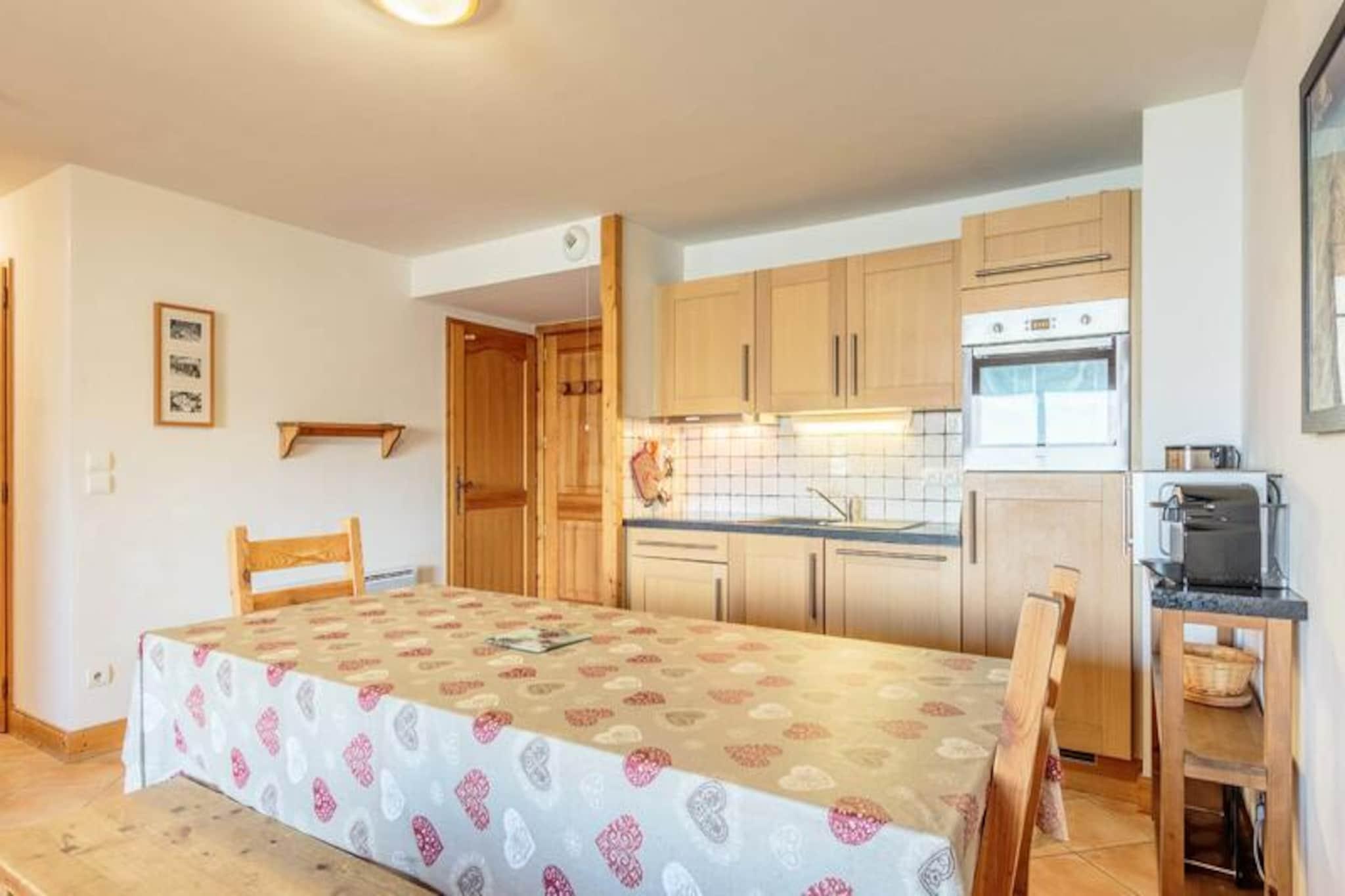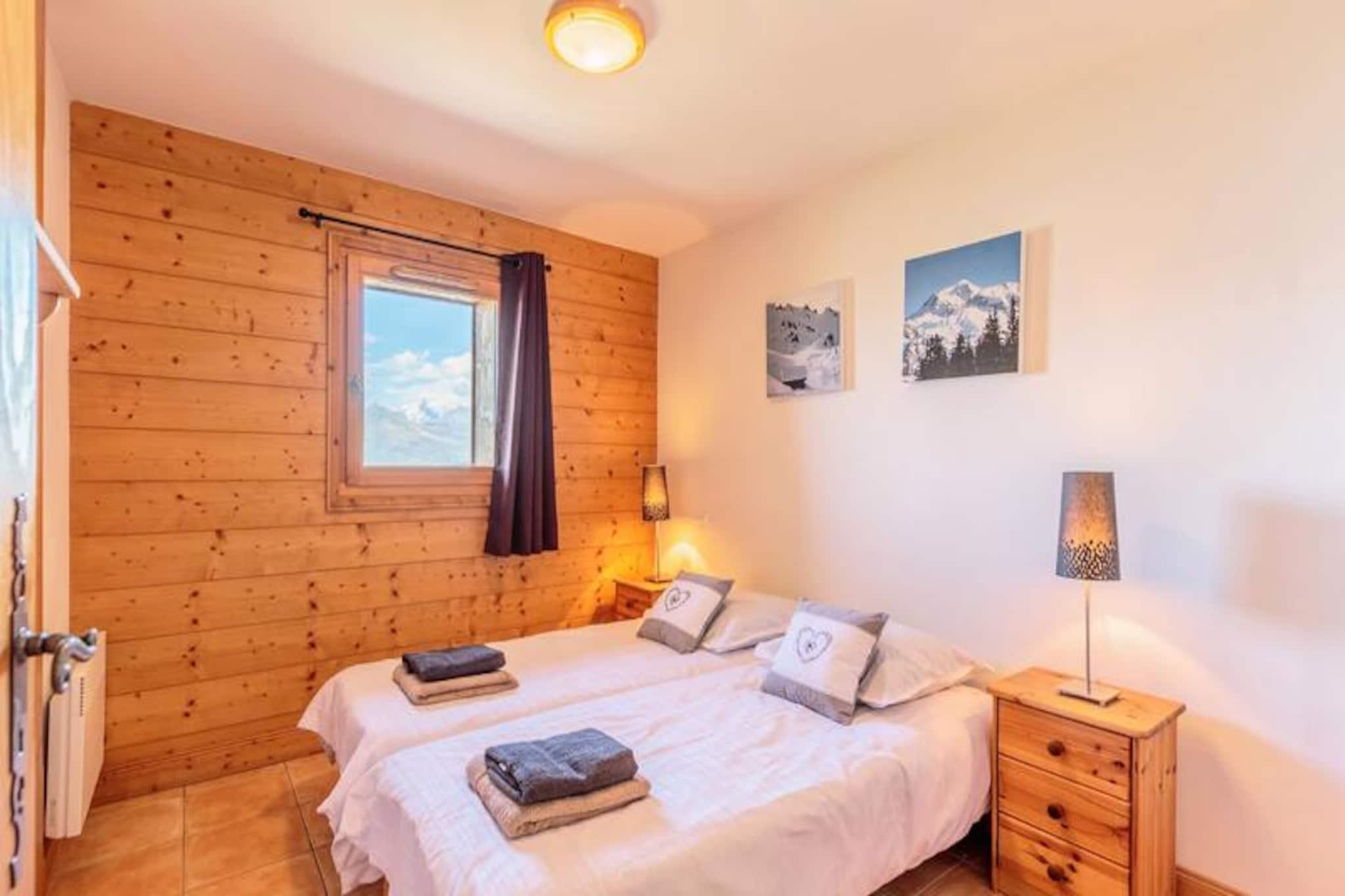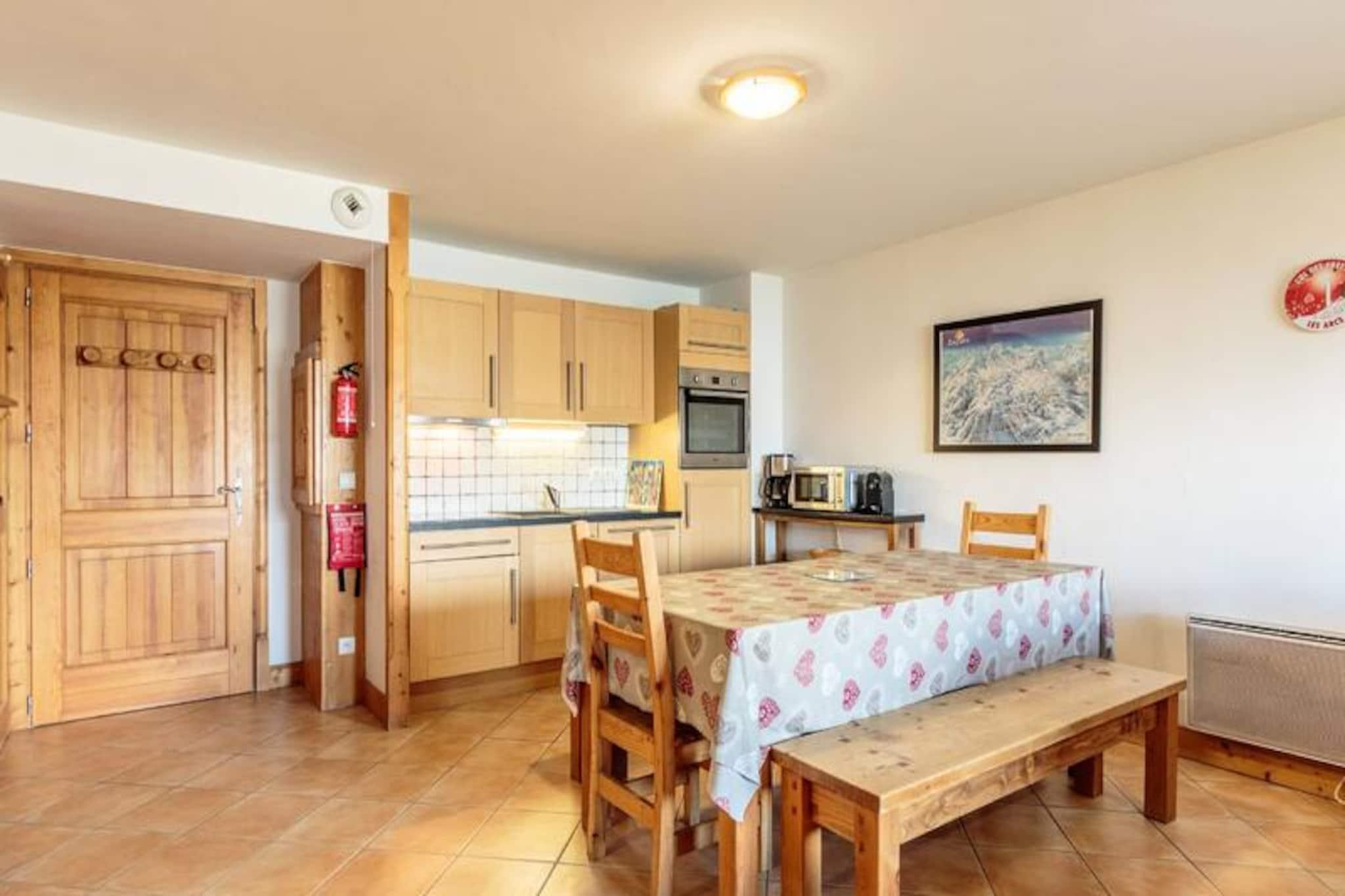 Med udsigt over den majestætiske Mont Blanc tilbyder denne elegante 4-værelses lejlighed i den prestigefyldte L'Iseran-residens et uforglemmeligt alpint tilflugtssted. Beliggende i det rolige Le Chantel-kvarter i Arc 1800 kombinerer denne ski-in/ski-out-ejendom luksus med bekvemmelighed, hvilket gør den til det perfekte valg for familier og grupper, der søger en raffineret bjergferie. Residensen kan prale af en opvarmet indendørs pool og solarium, der tilbyder et afslappende tilflugtssted efter en dag på pisterne eller udforskning af de betagende omgivelser. \n\nLejligheden er på 70 m² og har komfortabel plads til op til syv gæster. Det gennemtænkte interiør har en hyggelig stue med en blød sofa og tv, et åbent køkken udstyret med moderne apparater såsom en Nespresso-maskine og opvaskemaskine samt tre indbydende soveværelser. Soveværelset har en dobbeltseng og eget brusebad, mens de ekstra værelser tilbyder fleksible sovearrangementer, herunder køjesenge og enkeltsenge. Gæsterne vil sætte pris på bekvemmeligheden ved en vaskemaskine/tørretumbler, Wi-Fi og et skiskab samt den ekstra fordel ved en overdækket parkeringsplads. \n\nEjendommen ligger kun få minutter fra feriestedets centrum og har gode forbindelser med Dahu-svævebanen og en gratis shuttle-service. I nærheden finder du ESF-skiskolen, butikker og den charmerende restaurant Voga Goga. Om vinteren kan du nyde adgangen til Paradiskis 425 km pister, mens sommeren inviterer dig til at udforske de uberørte stier i Vanoise Nationalpark. Uanset om du står på ski, vandrer eller blot nyder den alpine atmosfære, placerer denne bolig dig i hjertet af det hele. \n\nMed sin panoramaudsigt, førsteklasses faciliteter og uovertrufne beliggenhed lover denne lejlighed et mindeværdigt ophold i et af de mest maleriske hjørner af de franske alper.