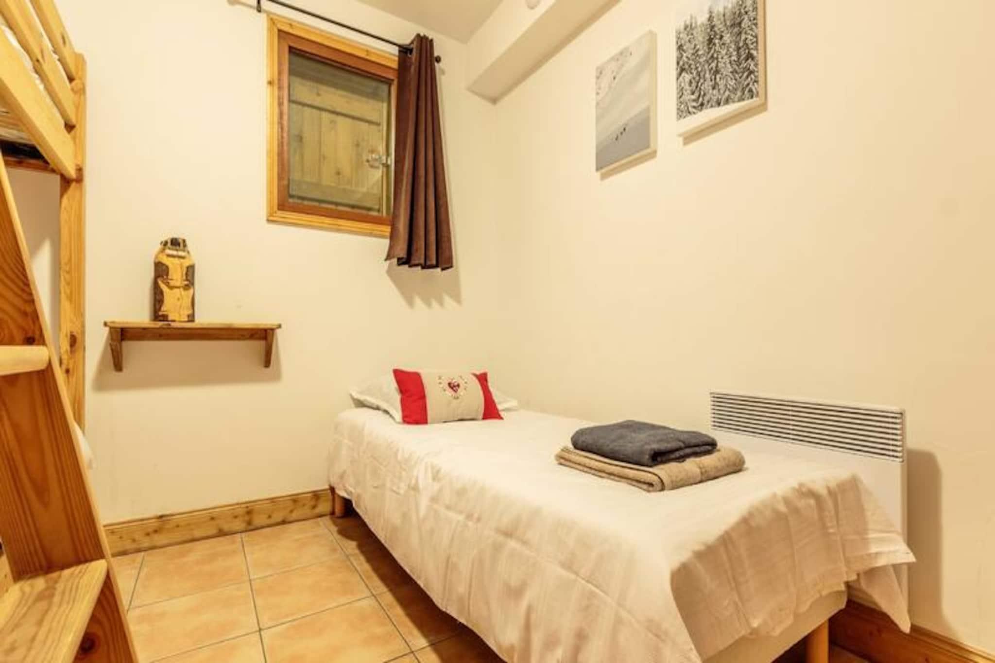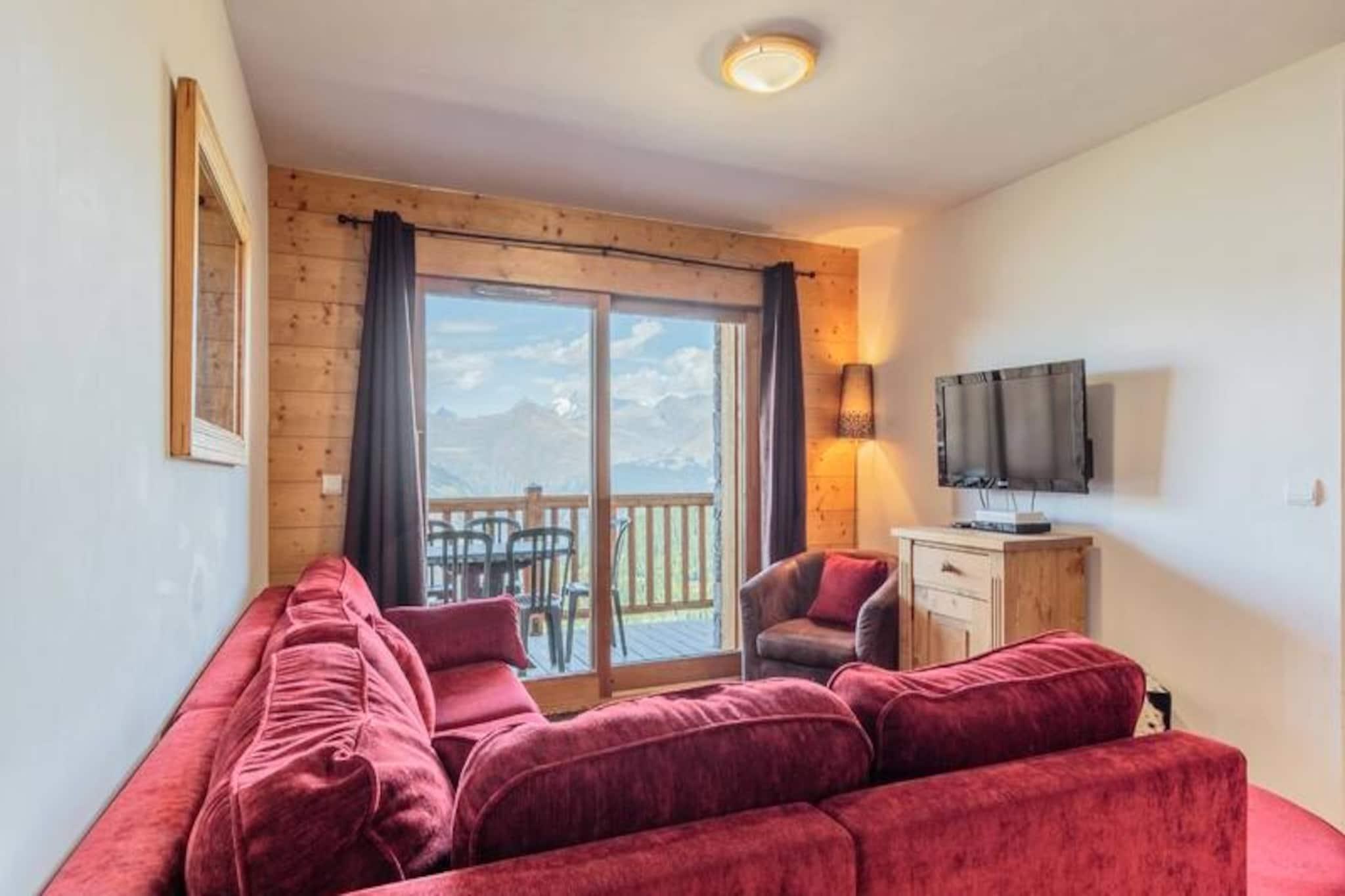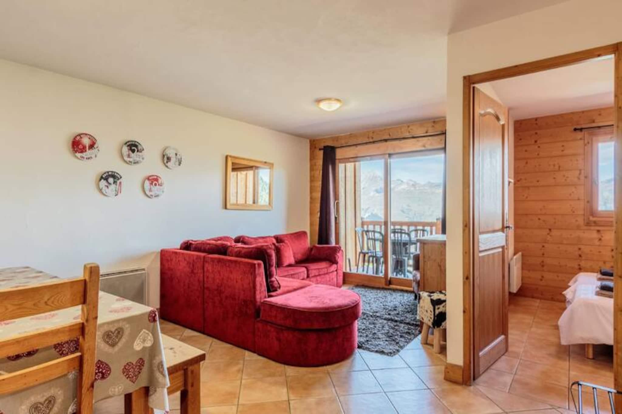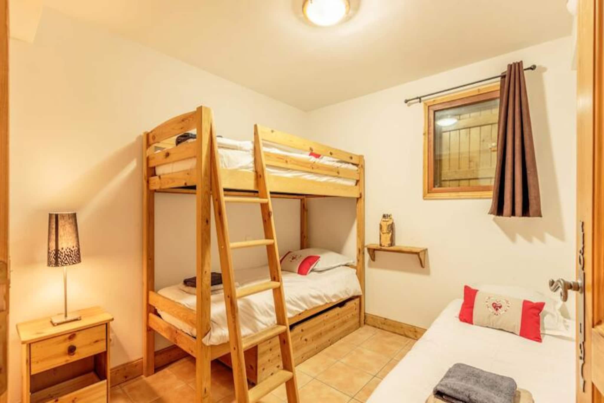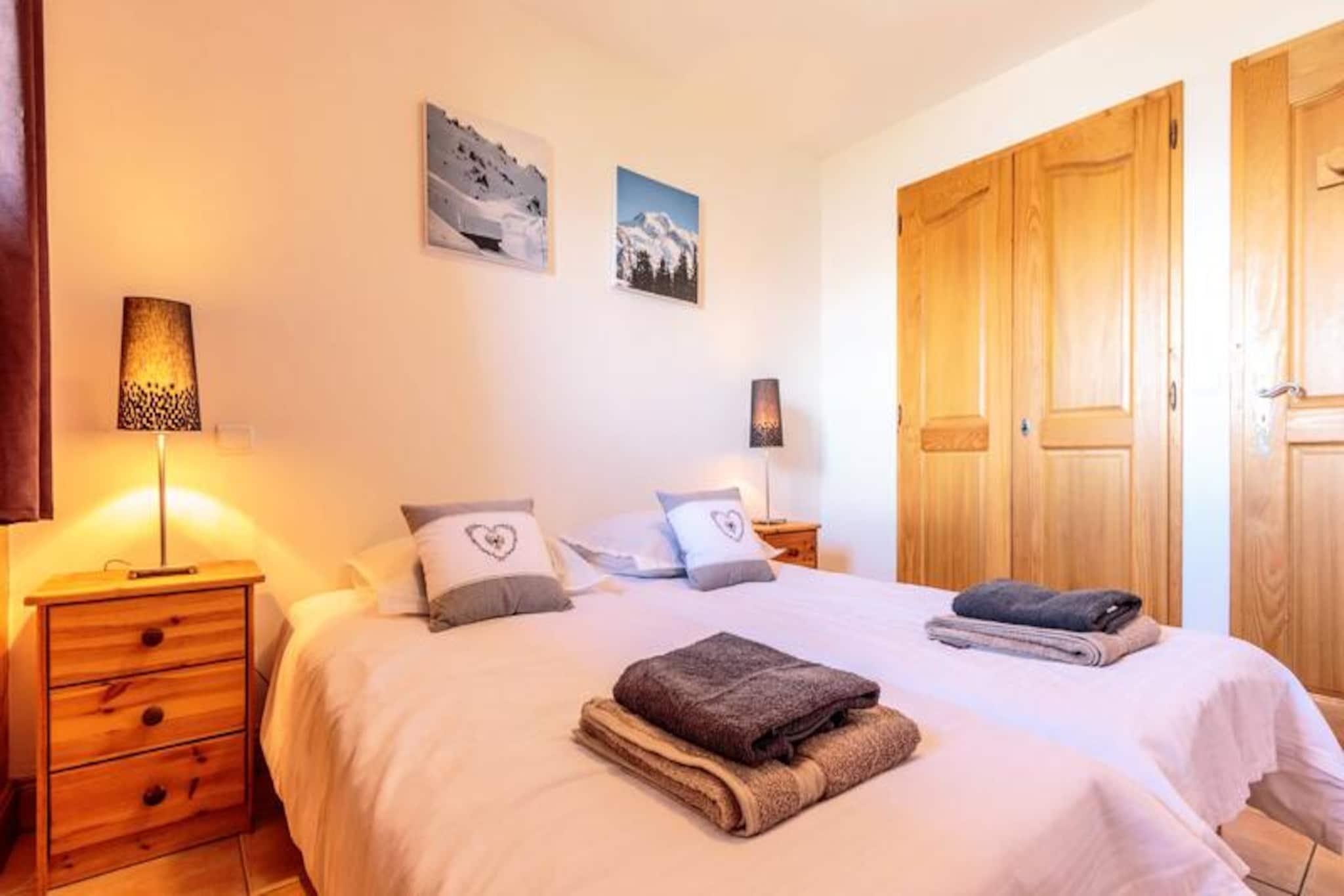 Med udsigt over den majestætiske Mont Blanc tilbyder denne elegante 4-værelses lejlighed i den prestigefyldte L'Iseran-residens et uforglemmeligt alpint tilflugtssted. Beliggende i det rolige Le Chantel-kvarter i Arc 1800 kombinerer denne ski-in/ski-out-ejendom luksus med bekvemmelighed, hvilket gør den til det perfekte valg for familier og grupper, der søger en raffineret bjergferie. Residensen kan prale af en opvarmet indendørs pool og solarium, der tilbyder et afslappende tilflugtssted efter en dag på pisterne eller udforskning af de betagende omgivelser. \n\nLejligheden er på 70 m² og har komfortabel plads til op til syv gæster. Det gennemtænkte interiør har en hyggelig stue med en blød sofa og tv, et åbent køkken udstyret med moderne apparater såsom en Nespresso-maskine og opvaskemaskine samt tre indbydende soveværelser. Soveværelset har en dobbeltseng og eget brusebad, mens de ekstra værelser tilbyder fleksible sovearrangementer, herunder køjesenge og enkeltsenge. Gæsterne vil sætte pris på bekvemmeligheden ved en vaskemaskine/tørretumbler, Wi-Fi og et skiskab samt den ekstra fordel ved en overdækket parkeringsplads. \n\nEjendommen ligger kun få minutter fra feriestedets centrum og har gode forbindelser med Dahu-svævebanen og en gratis shuttle-service. I nærheden finder du ESF-skiskolen, butikker og den charmerende restaurant Voga Goga. Om vinteren kan du nyde adgangen til Paradiskis 425 km pister, mens sommeren inviterer dig til at udforske de uberørte stier i Vanoise Nationalpark. Uanset om du står på ski, vandrer eller blot nyder den alpine atmosfære, placerer denne bolig dig i hjertet af det hele. \n\nMed sin panoramaudsigt, førsteklasses faciliteter og uovertrufne beliggenhed lover denne lejlighed et mindeværdigt ophold i et af de mest maleriske hjørner af de franske alper.