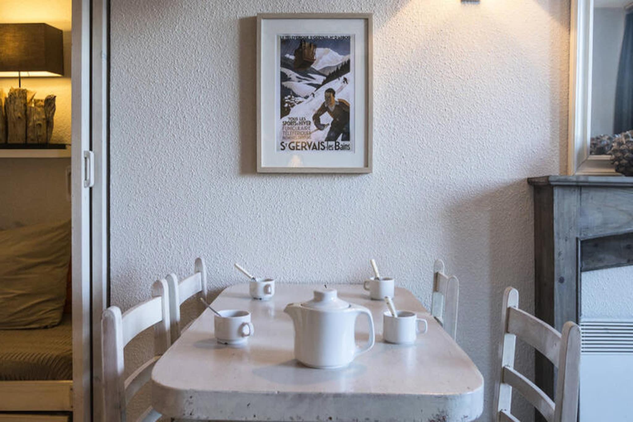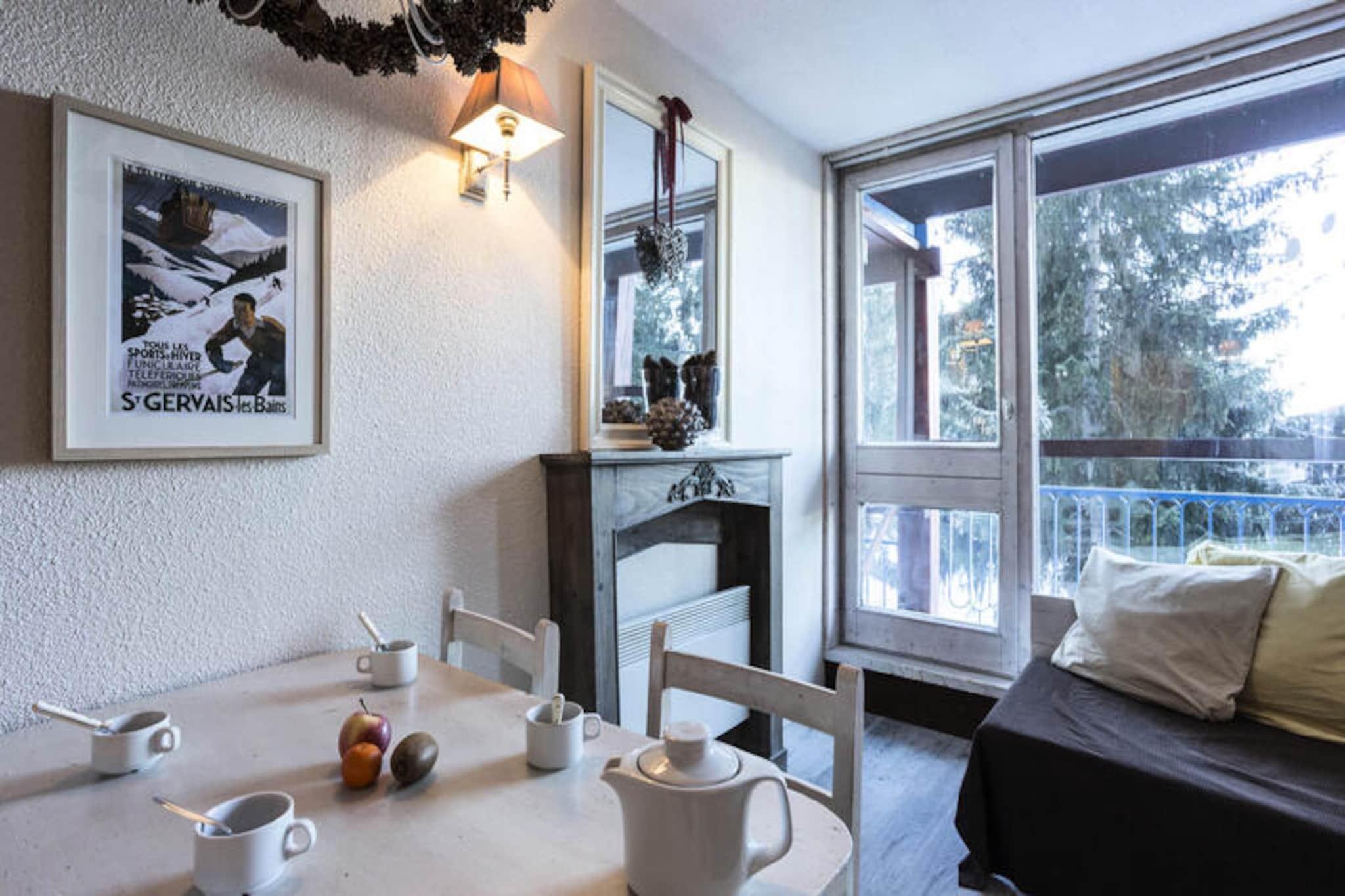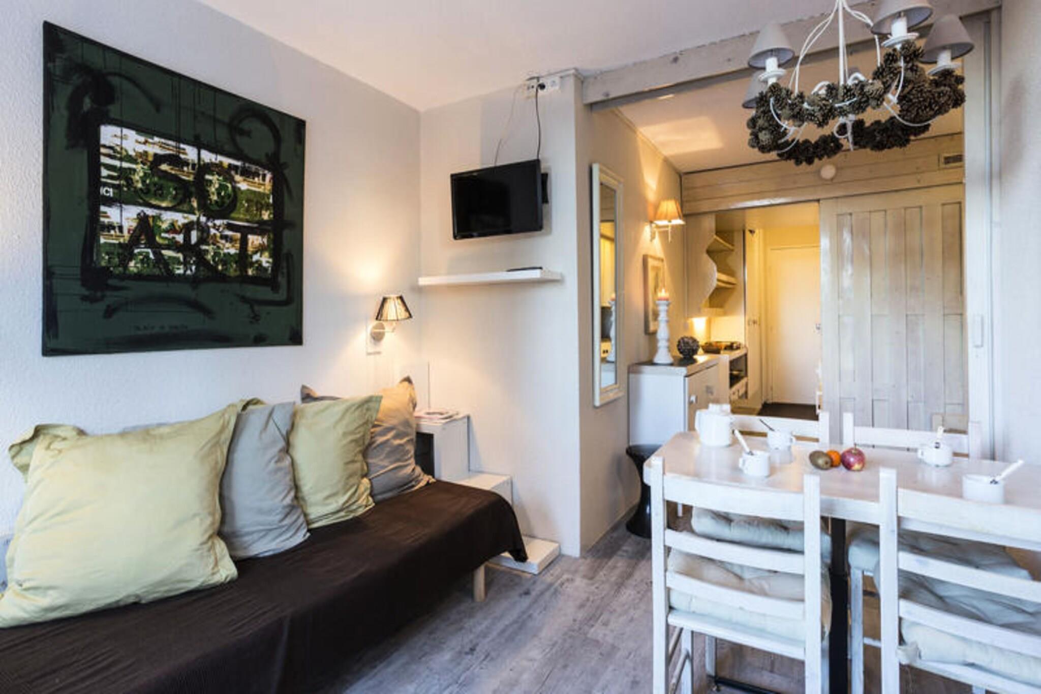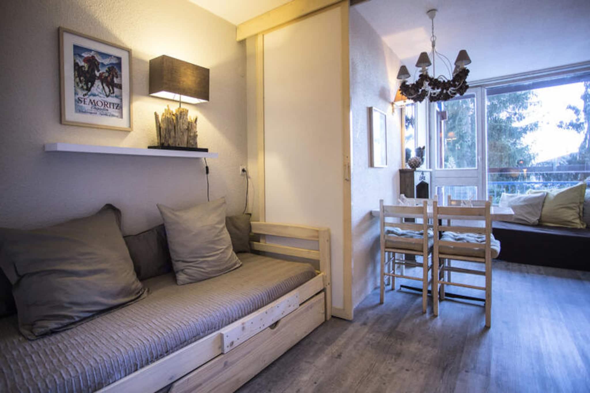 Højt over det charmerende Charvet-indkøbscenter tilbyder denne hyggelige studiohytte et roligt alpint tilflugtssted med direkte ski-in/ski-out-adgang til Les Arcs' pister. Forestil dig at vågne op til den friske bjergluft og træde ud på din sydvestvendte balkon for at nyde den livlige feriestedsatmosfære eller kigge mod nordøst mod det majestætiske Mont Blanc og de rolige pister omkransede af grantræer. Denne ejendom, der ligger på 6. sal i Belles Challes du Charvet-residensen, er en perfekt blanding af bekvemmelighed og komfort til din bjergferie. \n\nStudiohytten på 25 m² er designet til at rumme op til fire gæster og har et gennemtænkt opholdsrum med parketgulv, en alkove, en sovesofa, en udtræksseng og to enkeltsofaer. Tekøkkenet er fuldt udstyret med moderne apparater, herunder en miniovn, mikrobølgeovn, køleskab, opvaskemaskine, brødrister, elkedel og elektrisk kaffemaskine, så du kan tilberede solide måltider efter en dag med eventyr. Badeværelset med toilet er bekvemt placeret ved indgangen, og miljøvenligt sengetøj og rengøringsservice er tilgængelig mod et ekstra gebyr. \n\nTræd udenfor, og du vil finde dig selv i hjertet af begivenhedernes centrum. Boligen ligger over Charvet indkøbscenter og tilbyder nem adgang til butikker, restauranter og afterski-aktiviteter. Shuttle-stoppestedet mellem resorterne ligger kun få skridt væk, hvilket gør det nemt at udforske det bredere Paradiski-område. For dem, der ankommer i bil, er der overdækket parkering ved Le Charvet og udendørs parkering ved Les Lauzières i nærheden mod et gebyr i vintersæsonen. \n\nUanset om du er her for spændingen ved pisterne, Mont Blancs skønhed eller det pulserende resortliv, er denne studiohytte den perfekte base for en uforglemmelig alpin ferie. Med gratis Wi-Fi på resortet og en politik om ingen kæledyr og rygning er det et ideelt valg for par, små familier eller venner, der søger et fredeligt, men alligevel forbundet bjergferiested.