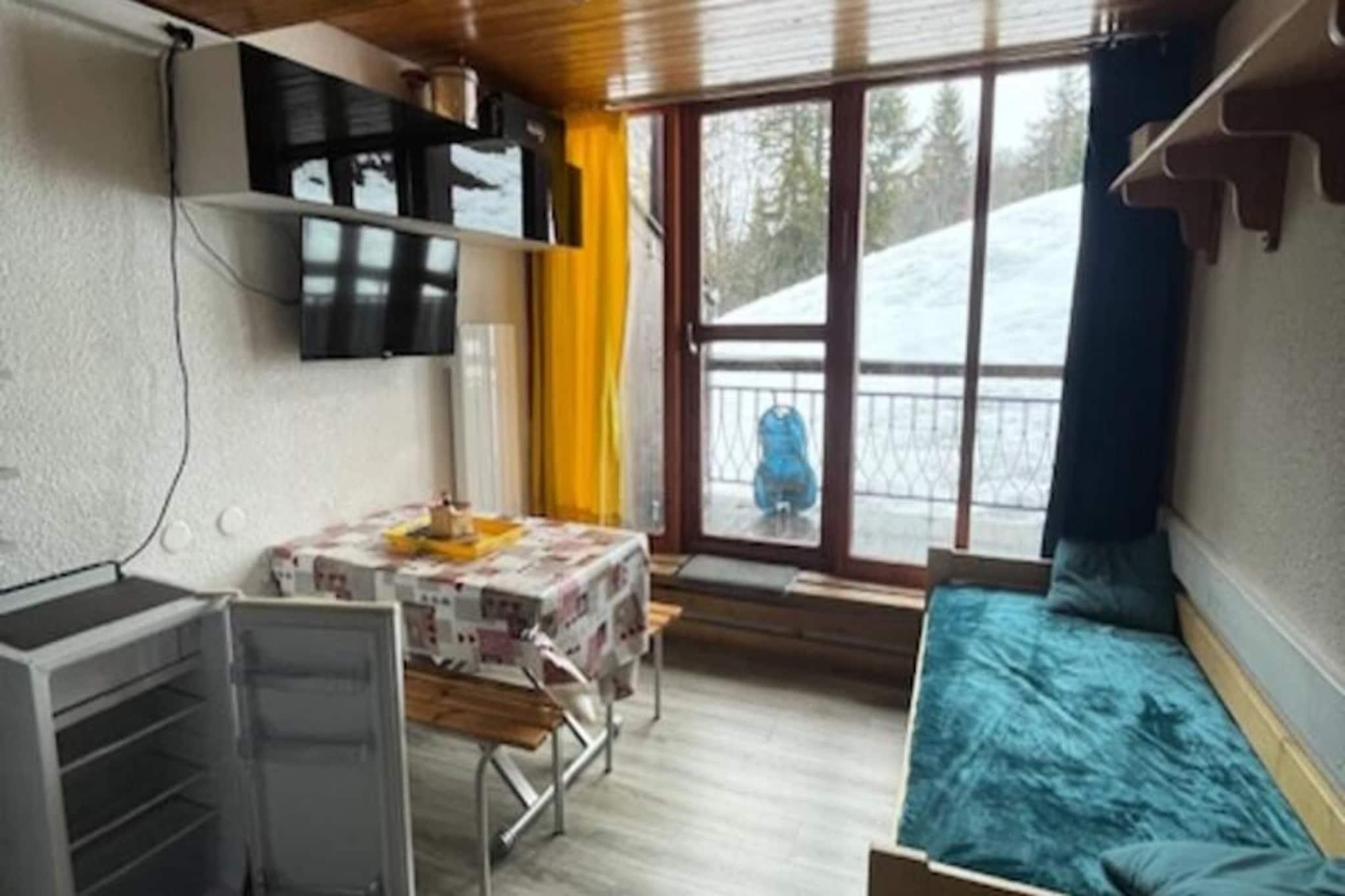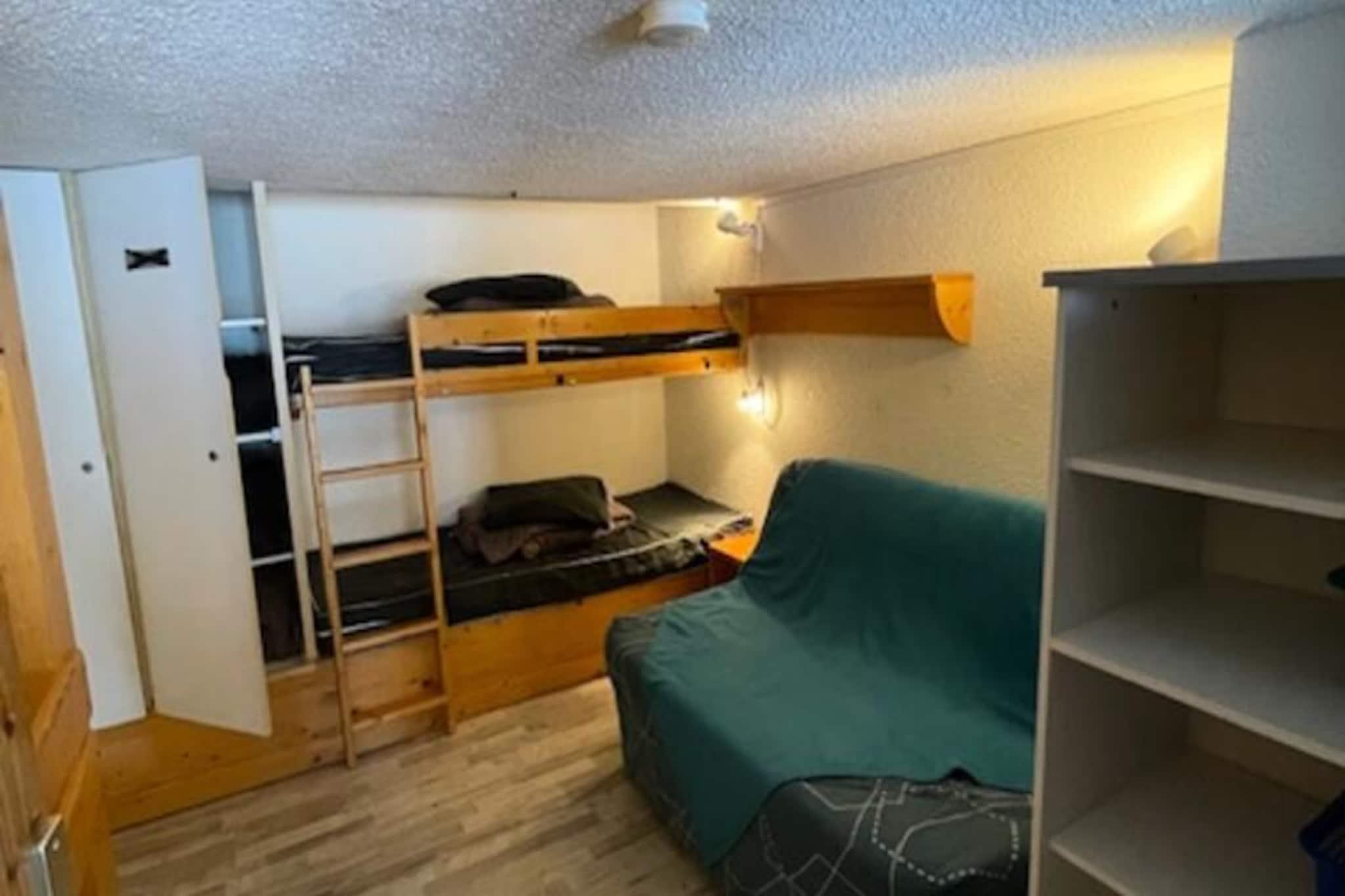 I det fredfyldte Charmettoger-område i Les Arcs 1800 tilbyder denne hyggelige duplexlejlighed et roligt alpint tilflugtssted med direkte adgang til pisterne. Forestil dig at vågne op til den friske bjergluft og træde ud på din nordøstvendte balkon for at beundre den betagende udsigt over Aiguille Grive. Uanset om du er her for vinterskiløb eller sommervandreture, er denne bolig den perfekte base for at udforske de franske alpers skønhed. De fredelige omgivelser sikrer et afslappende ophold væk fra travlheden i de travlere feriesteder. \n\nLejligheden er designet til at rumme op til fem gæster og kombinerer komfort og praktisk anvendelighed. Mezzanin-studiolejligheden omfatter en indbydende stue med spisebord og sovesofa, et fuldt udstyret tekøkken med moderne apparater såsom miniovn, mikrobølgeovn, køleskab og opvaskemaskine samt et badeværelse med badekar og toilet. Ovenpå har mezzaninen to enkeltsenge og en sovesofa, mens et separat soveværelse med dobbeltseng og tv tilbyder ekstra privatliv. Miljøvenligt sengetøj og slutrengøring er tilgængelig for ekstra bekvemmelighed, hvilket sikrer en bæredygtig og stressfri ferieoplevelse. \n\nResidensen er ideelt beliggende ved foden af ??pisterne, hvilket gør det nemt at starte din dag med skiløb eller snowboarding uden forsinkelse. For dem, der søger lokale faciliteter, er der et købmandsforretning bekvemt placeret i boligen, mens overdækket parkering ved Charmettoger og gratis parkering langs vejen giver praktiske muligheder for rejsende. Shuttle-stoppestedet mellem feriestederne ved Charmettoger forbinder dig ubesværet med andre områder af Les Arcs, hvilket forbedrer dit alpine eventyr. \n\nUanset om du er tiltrukket af spændingen ved pisterne, charmen ved bjergstierne eller blot ønsket om at slappe af i fredelige omgivelser, tilbyder denne lejlighed den perfekte blanding af komfort, beliggenhed og tilgængelighed. Skab uforglemmelige minder omgivet af de majestætiske tinder i Tarentaise-dalen.