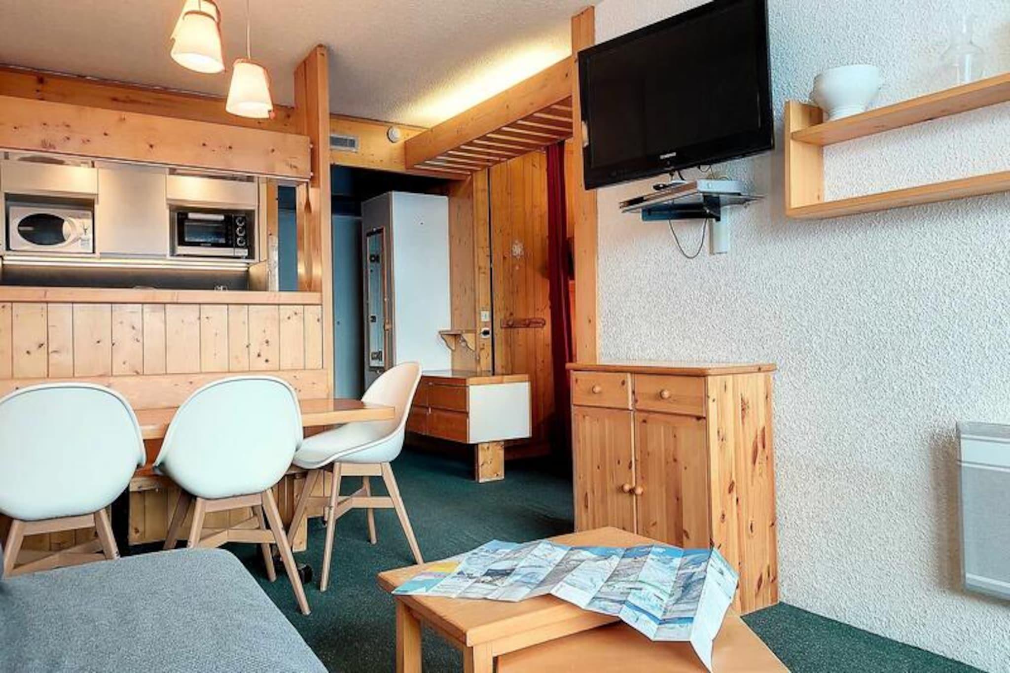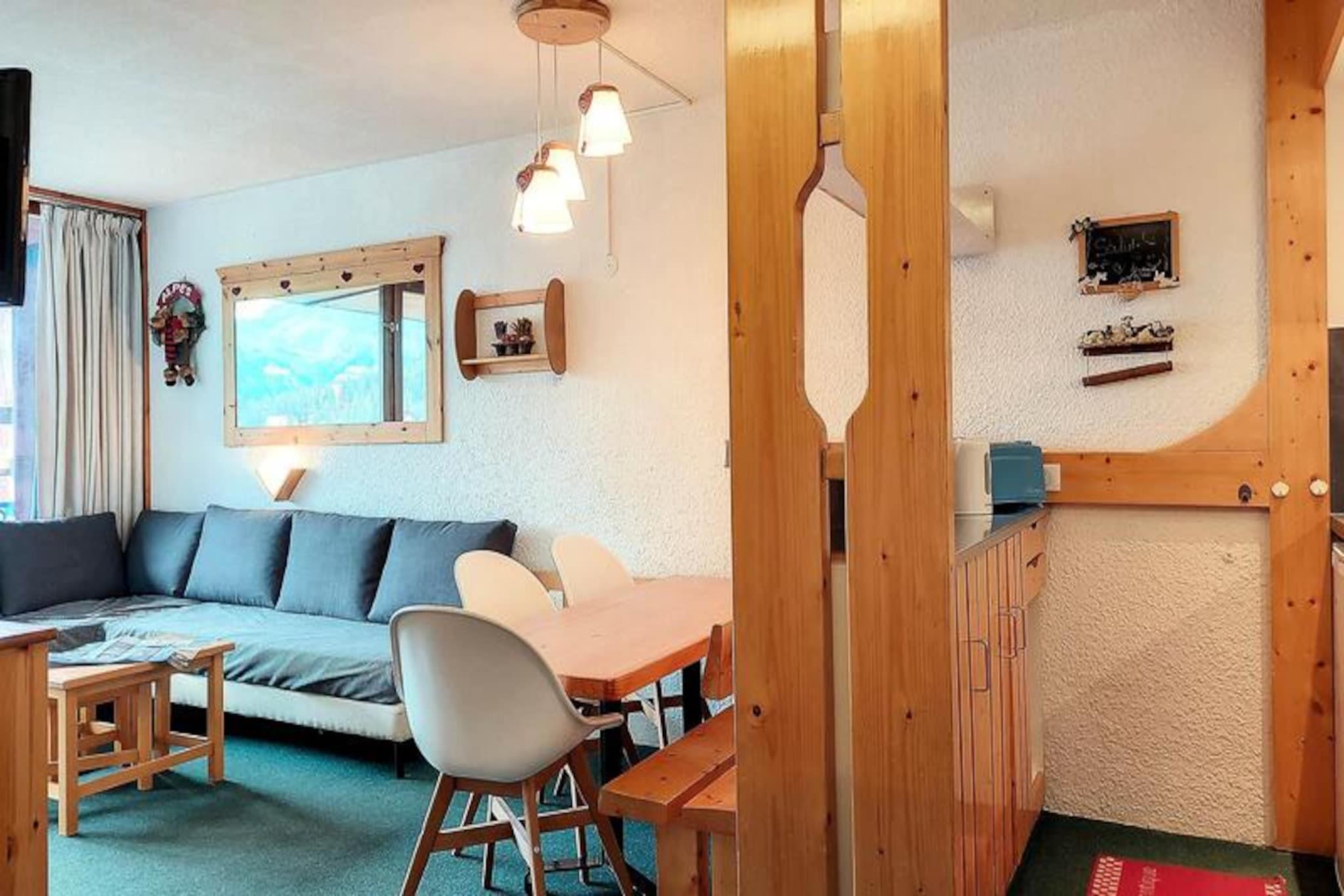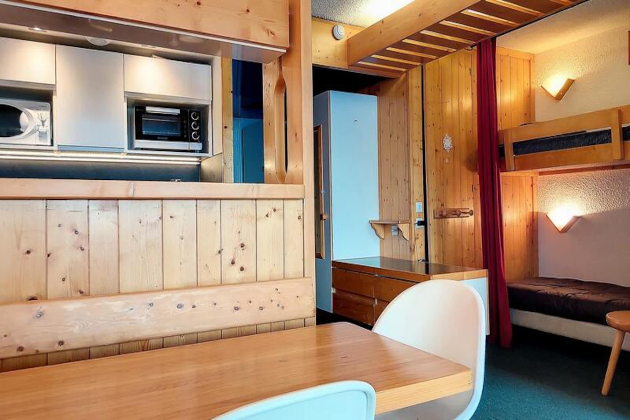 Højt over den glitrende dal tilbyder denne charmerende lejlighed i Nova 3-residensen et perfekt alpint tilflugtssted i hjertet af Villards, Les Arcs 1800. Med pister og butikker kun få skridt væk, vågner du op til en betagende udsigt over solnedgangen over Tarentaise-dalen eller de fredfyldte fyrretræsklædte bakker, afhængigt af din orientering. Uanset om du er her for spændende skieventyr eller rolige sommervandreture, fordyber denne beliggenhed dig i de franske alpers skønhed. \n\nLejligheden er designet til op til seks gæster og har en hyggelig stue med to komfortable sovesofaer og et tv, et privat soveværelse med en blød dobbeltseng og et kahytområde med køjesenge, der er perfekte til børn over seks år. Det veludstyrede køkken inkluderer keramiske kogeplader, en miniovn, mikrobølgeovn, køleskab, opvaskemaskine og endda en Nespresso-maskine til din morgenkaffe. Et separat badeværelse og toilet sikrer bekvemmelighed, mens miljøvenligt sengetøj og rengøringsservice er tilgængelig for at forbedre dit ophold. Gratis Wi-Fi holder dig forbundet, og balkonen tilbyder et fredeligt sted at slappe af med en fantastisk udsigt. \n\nTræd udenfor og nyd adgang til ski-in/ski-out til pister i verdensklasse, eller udforsk den pulserende landsby Villards med dens indkøbscenter, restauranter og shuttle-stop mellem feriestederne. Om sommeren forvandles regionen til et paradis for vandrere og cyklister med stier, der snor sig gennem frodige landskaber og alpine enge. I nærheden lokker de majestætiske tinder af Aiguille Rouge og Vanoise Nationalpark til både eventyrere og naturelskere. \n\nUanset om du søger adrenalinfyldte dage på pisterne eller rolige aftener med solnedgang, tilbyder denne bolig den perfekte balance mellem komfort, bekvemmelighed og uforglemmelig alpin charme.