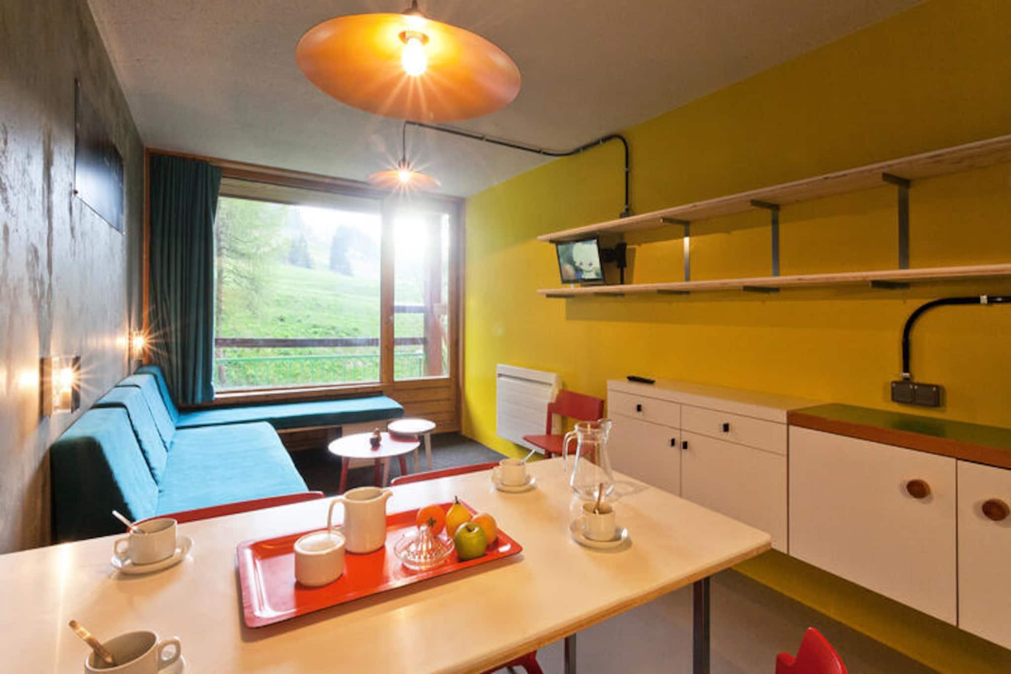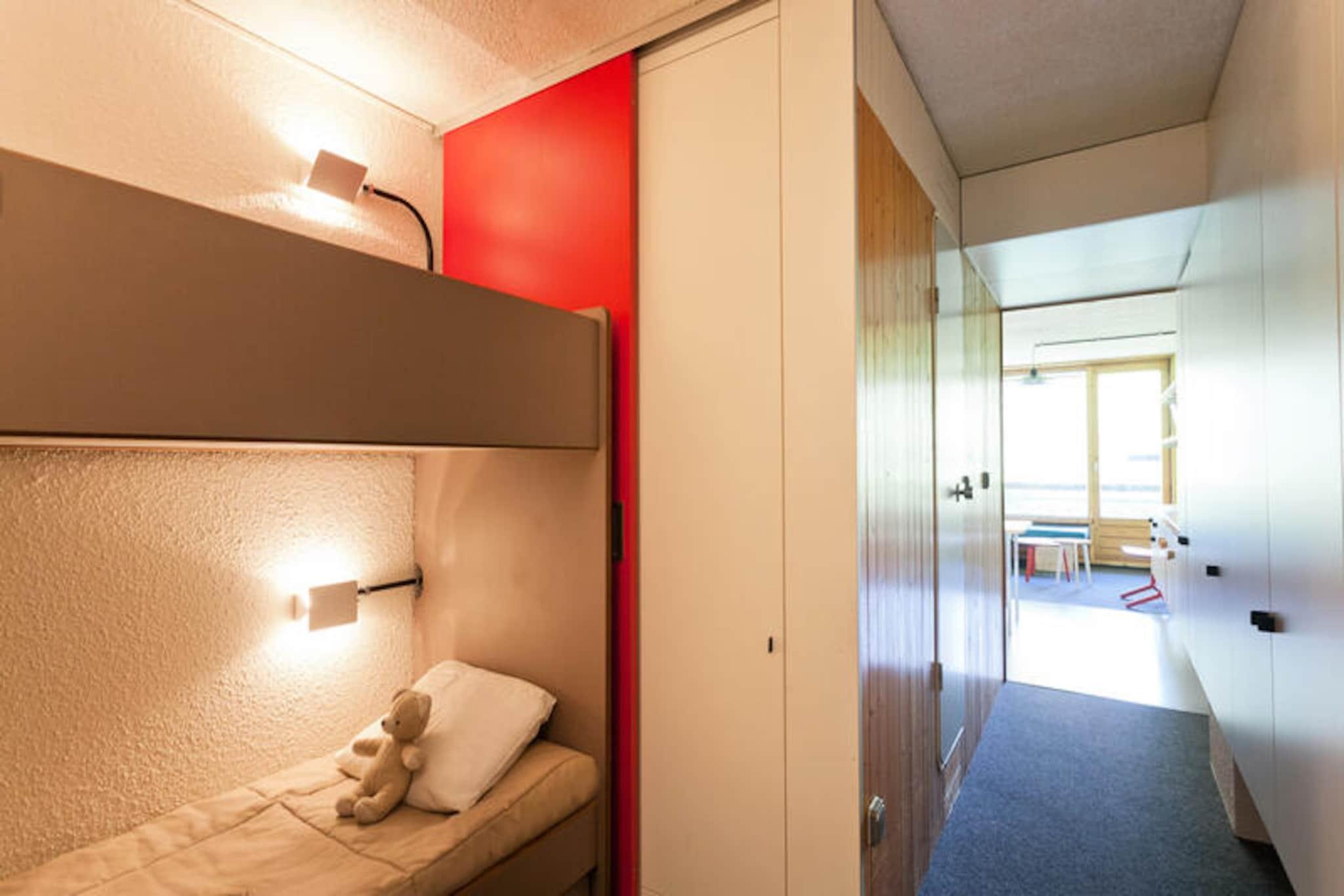 Højt over det travle Charvet-indkøbscenter tilbyder dette charmerende bjergstudie et hyggeligt tilflugtssted med uovertruffen ski-in/ski-out-bekvemmelighed. Forestil dig at træde ud på din sydvendte balkon, hvor panoramaudsigt over pisterne strækker sig foran dig, eller at kigge fra den nordøstlige balkon på den majestætiske Mont Blanc og de fredfyldte grantræer. Beliggende på 10. sal i Lauzières du Charvet-residensen er dette renoverede 27 m² store studie det perfekte alpine tilflugtssted for op til fem gæster. \n\nIndvendigt er studiet omhyggeligt designet til komfort og funktionalitet. Entréen har to køjesenge og en udtræksseng, mens stuen kan prale af en sovesofa med en udtræksseng, der kan omdannes til en rummelig dobbeltseng. Tekøkkenet er fuldt udstyret med moderne apparater, herunder keramiske kogeplader, en kombineret ovn, køleskab/fryser, opvaskemaskine, elkedel, kaffemaskine og brødrister. Den hyggelige tæppebelagte opholdsstue og det praktiske linoleumsgulv i køkkenet skaber en varm og indbydende atmosfære. Et veludstyret badeværelse med toilet fuldender rummet og sikrer et behageligt ophold. \n\nResidensen tilbyder en række faciliteter, herunder skibokse, elevatorer og adgang til overdækket og udendørs parkering i nærheden. Familier vil sætte pris på ESF Skimômes børneklub, der ligger lige ved foden af ??residensen. Den gratis Wi-Fi på resortet holder dig forbundet, mens shuttle-stoppestedet mellem resorterne sikrer nem adgang til at udforske det bredere område. \n\nUanset om du er her for spændende dage på pisterne eller fredelige aftener, hvor du nyder den alpine atmosfære, placerer denne studiolejlighed dig i hjertet af det hele. Med butikker, restauranter og skifaciliteter kun få skridt væk begynder dit bjergeventyr i det øjeblik, du ankommer. Oplev magien ved Les Arcs og skab minder, der vil vare hele livet.