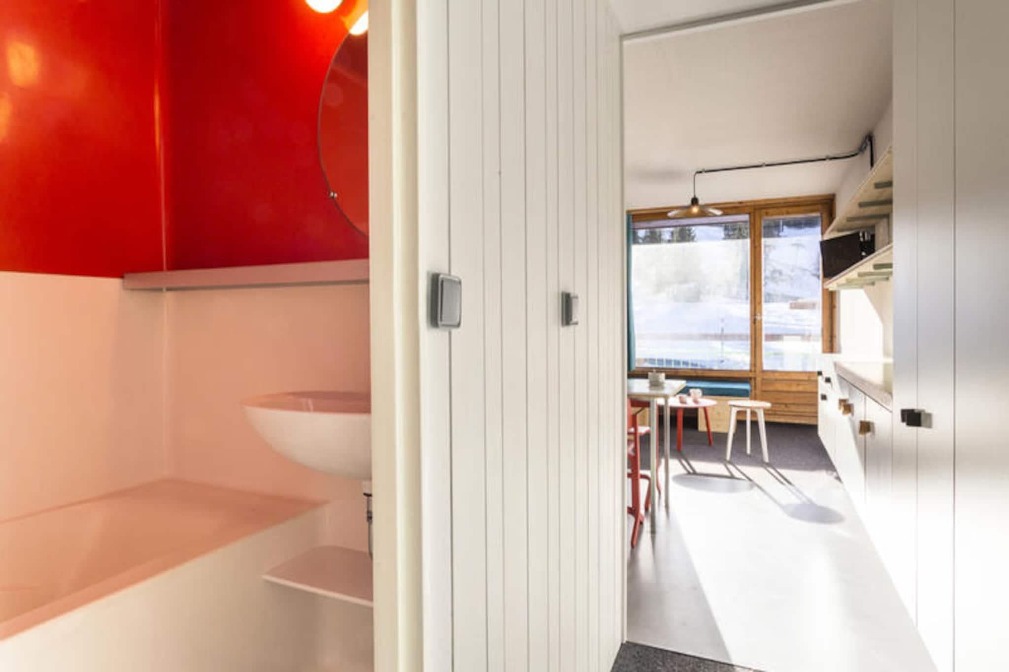 Højt over det travle Charvet-indkøbscenter tilbyder dette charmerende bjergstudie en uovertruffen ski-in/ski-out-oplevelse i hjertet af Les Arcs 1800. Forestil dig at vågne op til den friske alpine luft, træde ud på din sydvendte balkon for at nyde den fredfyldte udsigt over pisterne eller kigge på Mont Blanc fra den nordøstvendte side. Dette hyggelige tilflugtssted er den perfekte base for et mindeværdigt alpint eventyr, uanset om du er her for de snedækkede pister eller de livlige sommerløjper. \n\nDet nyrenoverede 27 m² store studie har komfortabel plads til op til fem gæster, hvilket gør det ideelt til familier eller små grupper. Entréhallen har to køjesenge og en udtræksseng, mens stuen tilbyder en sovesofa og en anden udtræksseng, der kan laves om til en rummelig dobbeltseng. Tekøkkenet er fuldt udstyret med moderne apparater, herunder keramiske kogeplader, en kombinationsovn, et køleskab/fryser, en opvaskemaskine og mere, så du har alt, hvad du behøver for et behageligt ophold. Studiolejligheden har også et badeværelse med toilet, tæppebelagt gulv og linoleumsgulv, og miljøvenligt sengelinned kan fås mod et ekstra gebyr.\n\nBekvemt placeret ved foden af ??pisterne og butikkerne tilbyder boligen også adgang til et skirum, elevatorer og nærliggende parkeringsmuligheder. Familier vil sætte pris på ESF Skimômes børneklub kun få skridt væk, mens shuttle-stoppestedet mellem feriestederne sikrer problemfri udforskning af området. Uanset om du står på ski om vinteren eller vandrer om sommeren, er den pulserende atmosfære i Les Arcs 1800 lige uden for døren.\n\nMed en betagende udsigt, moderne faciliteter og en uovertruffen beliggenhed inviterer denne studiolejlighed dig til at skabe uforglemmelige minder i hjertet af de franske alper. Book dit ophold i dag, og oplev magien i Les Arcs 1800 selv.